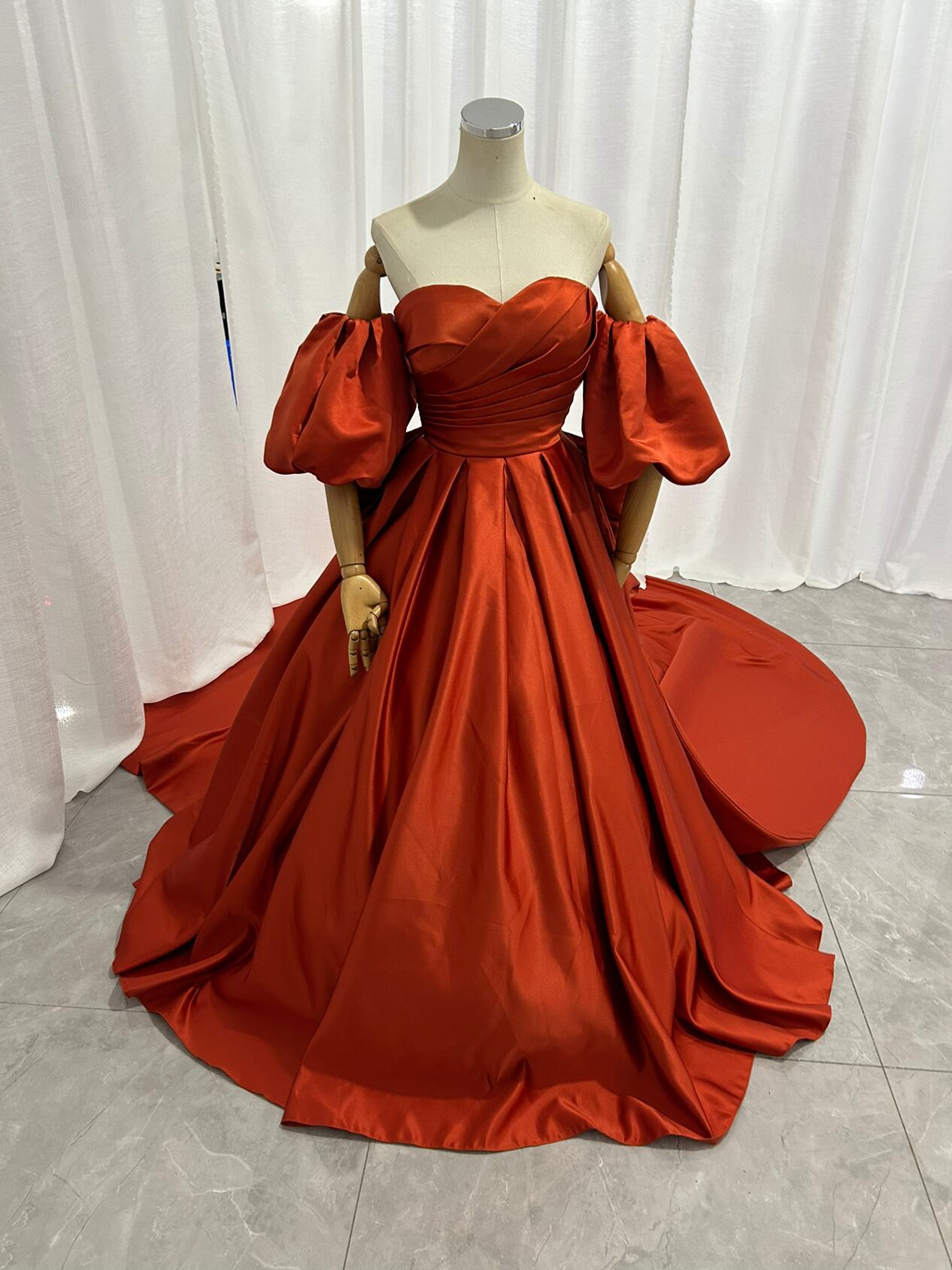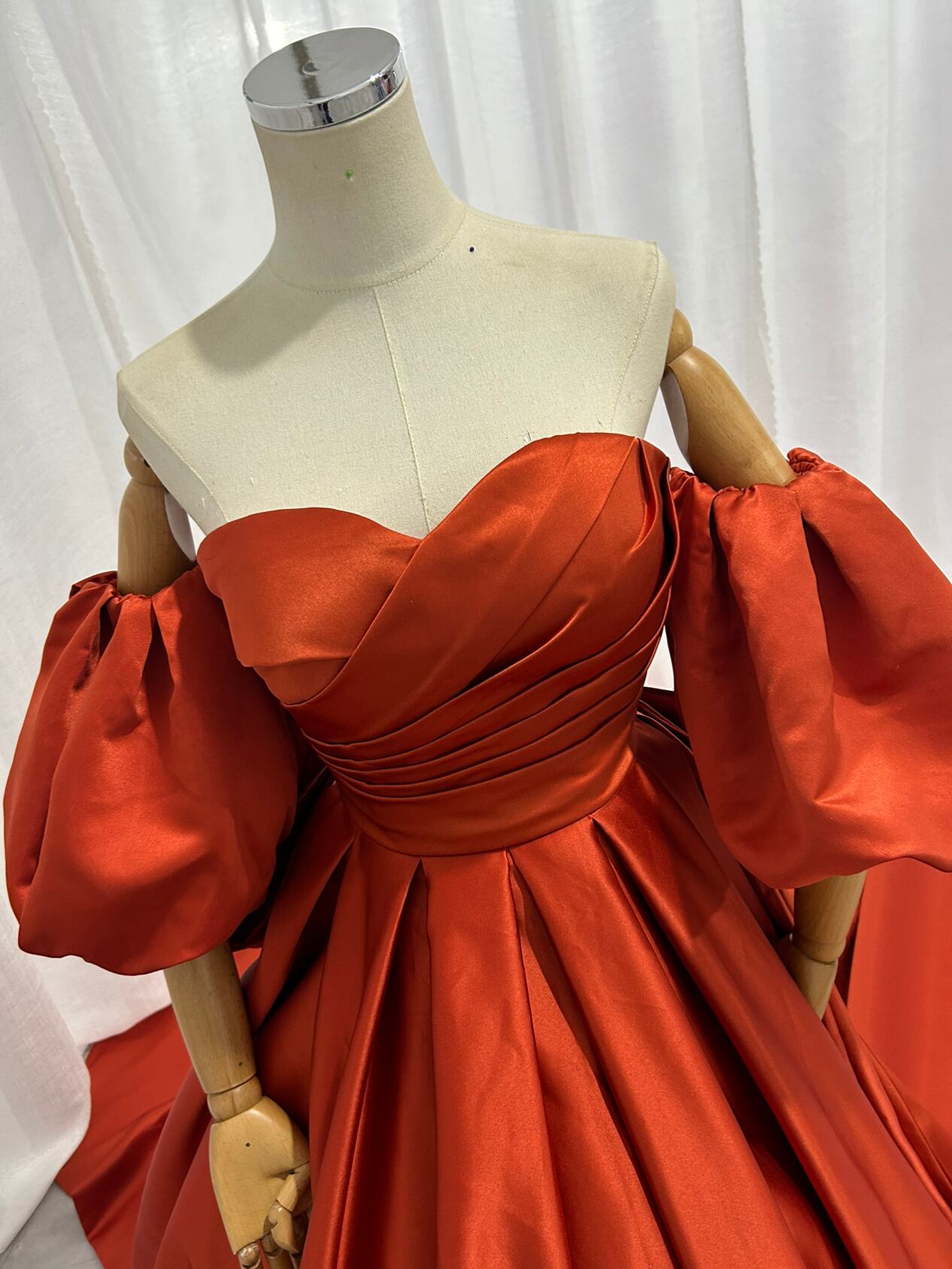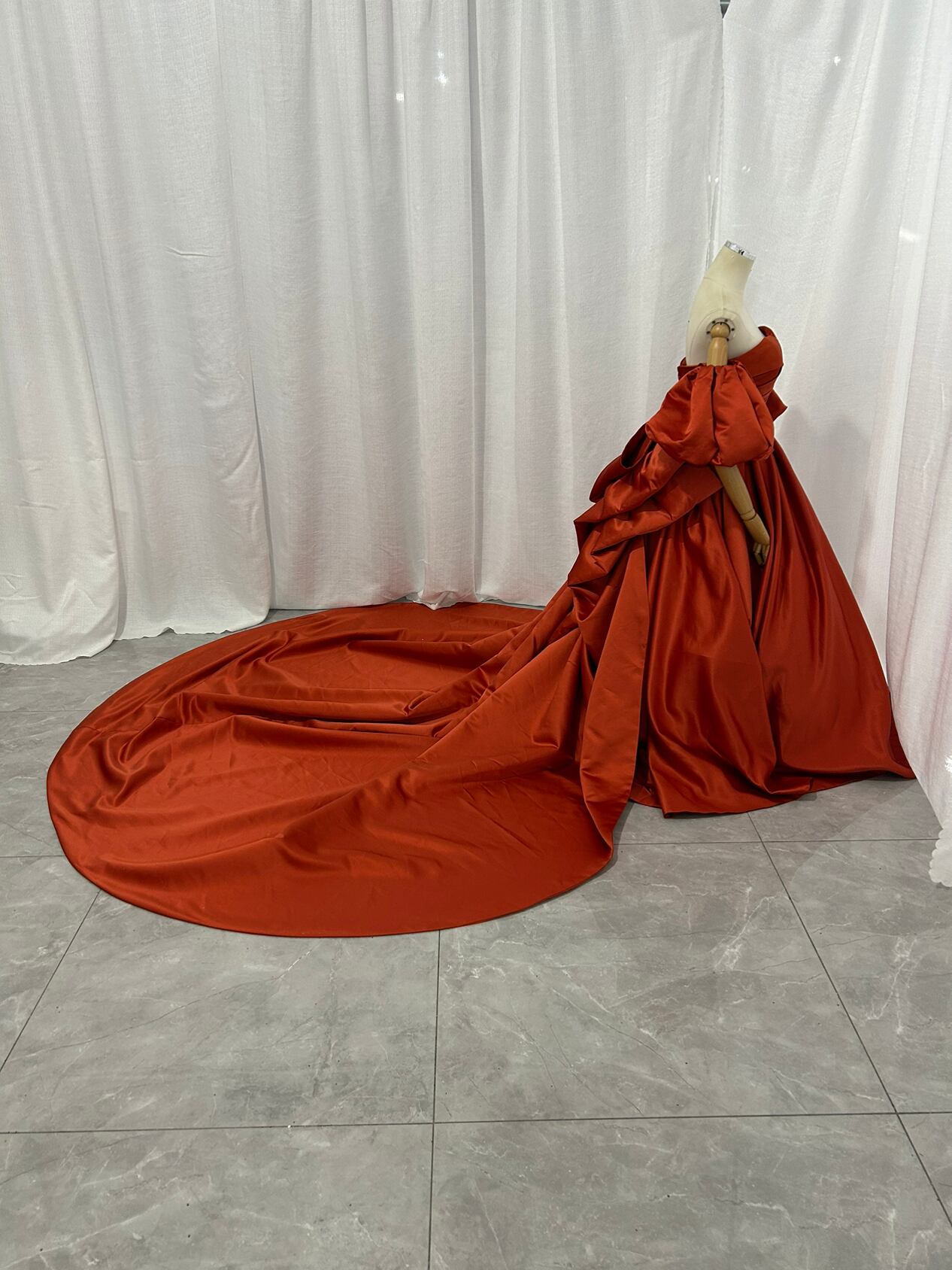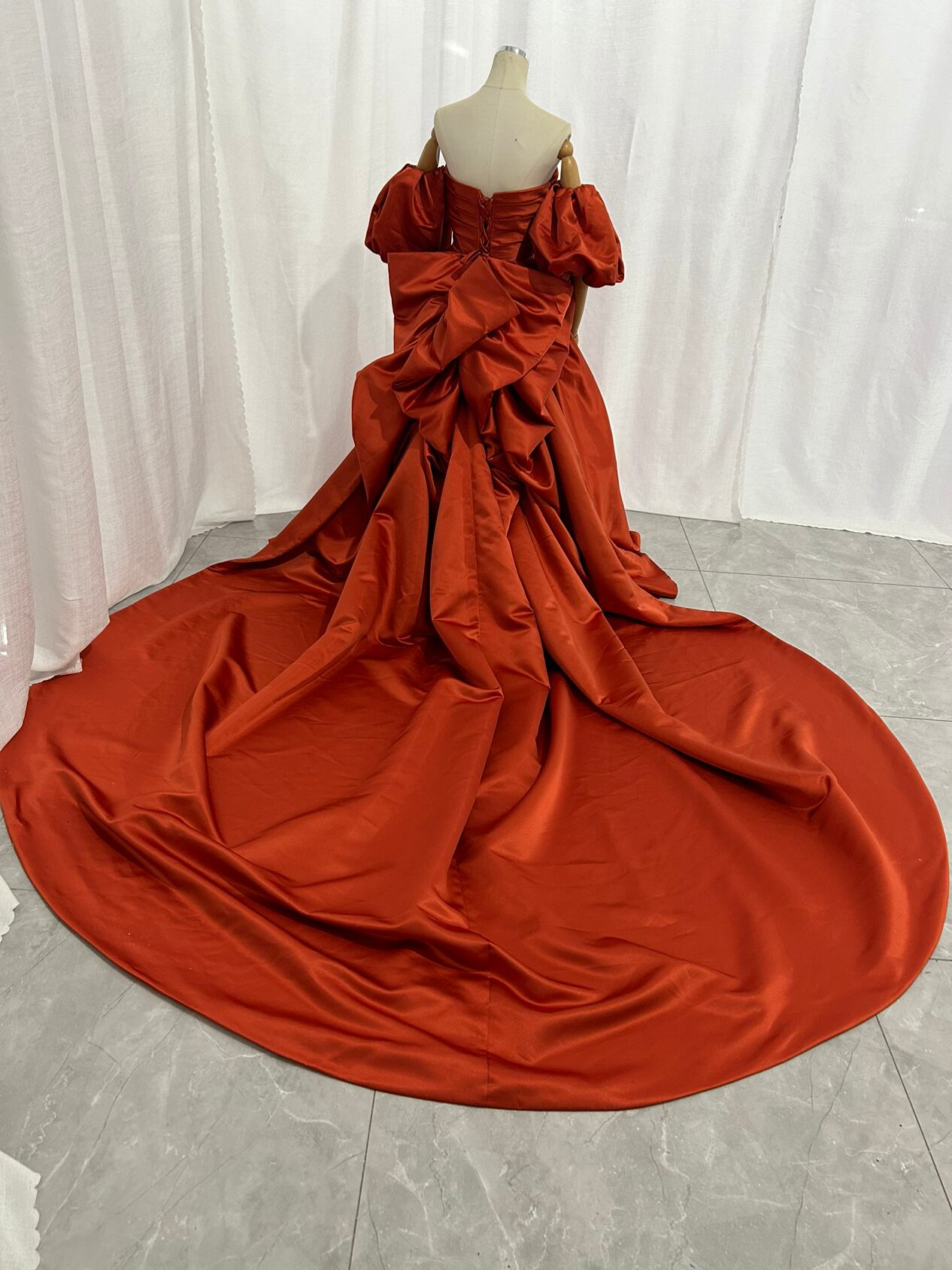 送料無料!人気上昇!パーティードレス テラコッタ色 テラコッタ ベアトップ 華やかなトレーン/結婚式/披露宴