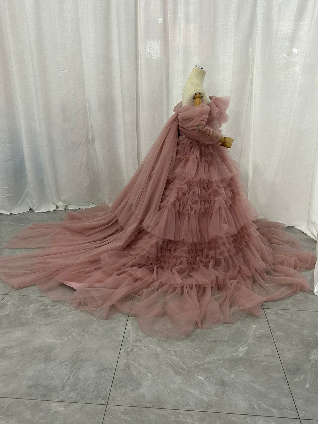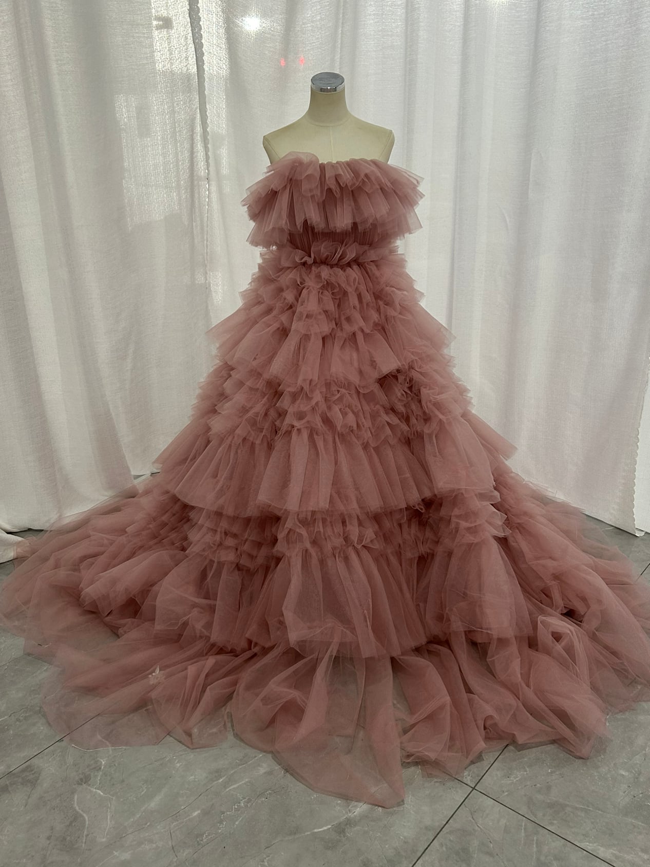 韓国風もこもこチュールドレス ピンク カラードレスフリルオフショルダー お色直し ふわふわ+ 取り外し華やかなトレーン