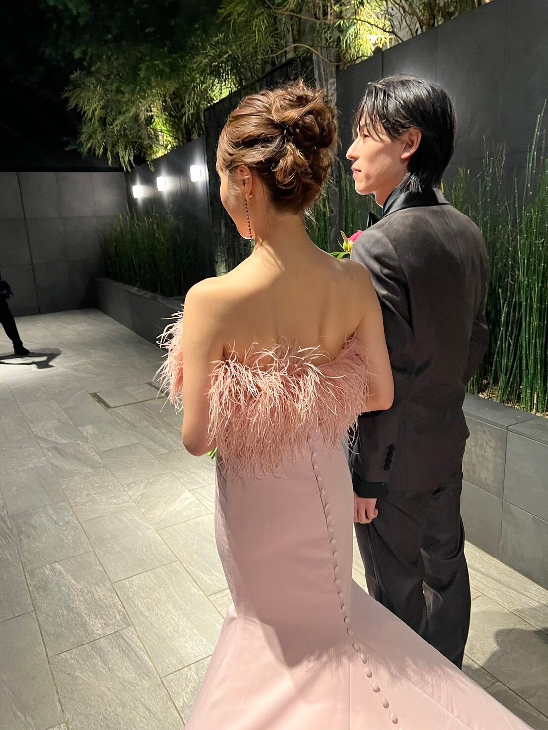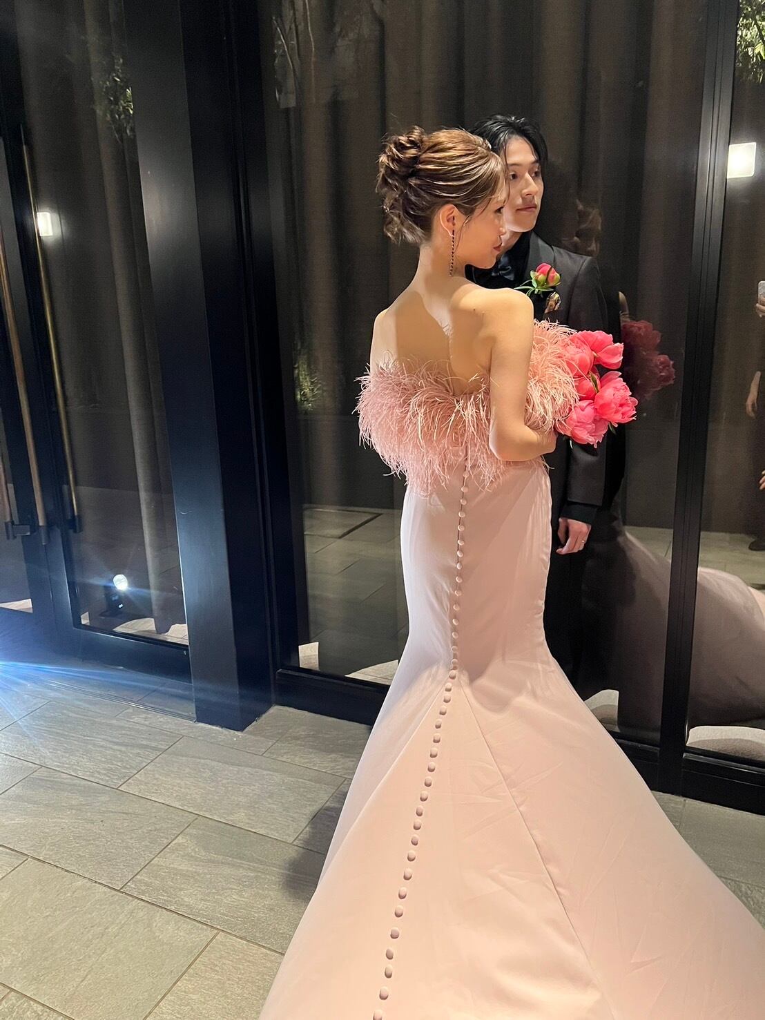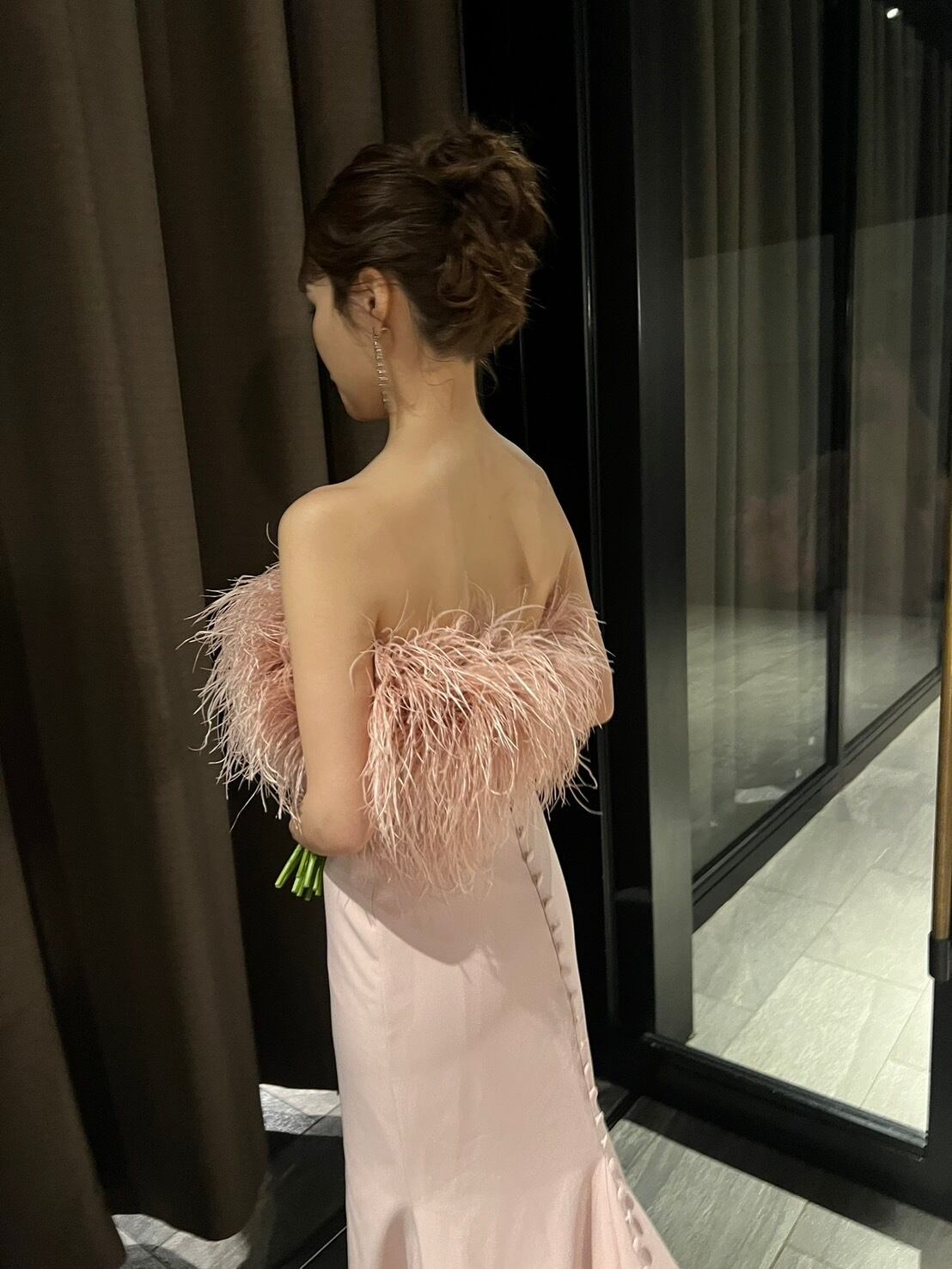 実例写真!送料無料!人気上昇!カラードレス 羽フェザーマーメイド 玉ピンク パーティー/結婚式/披露宴