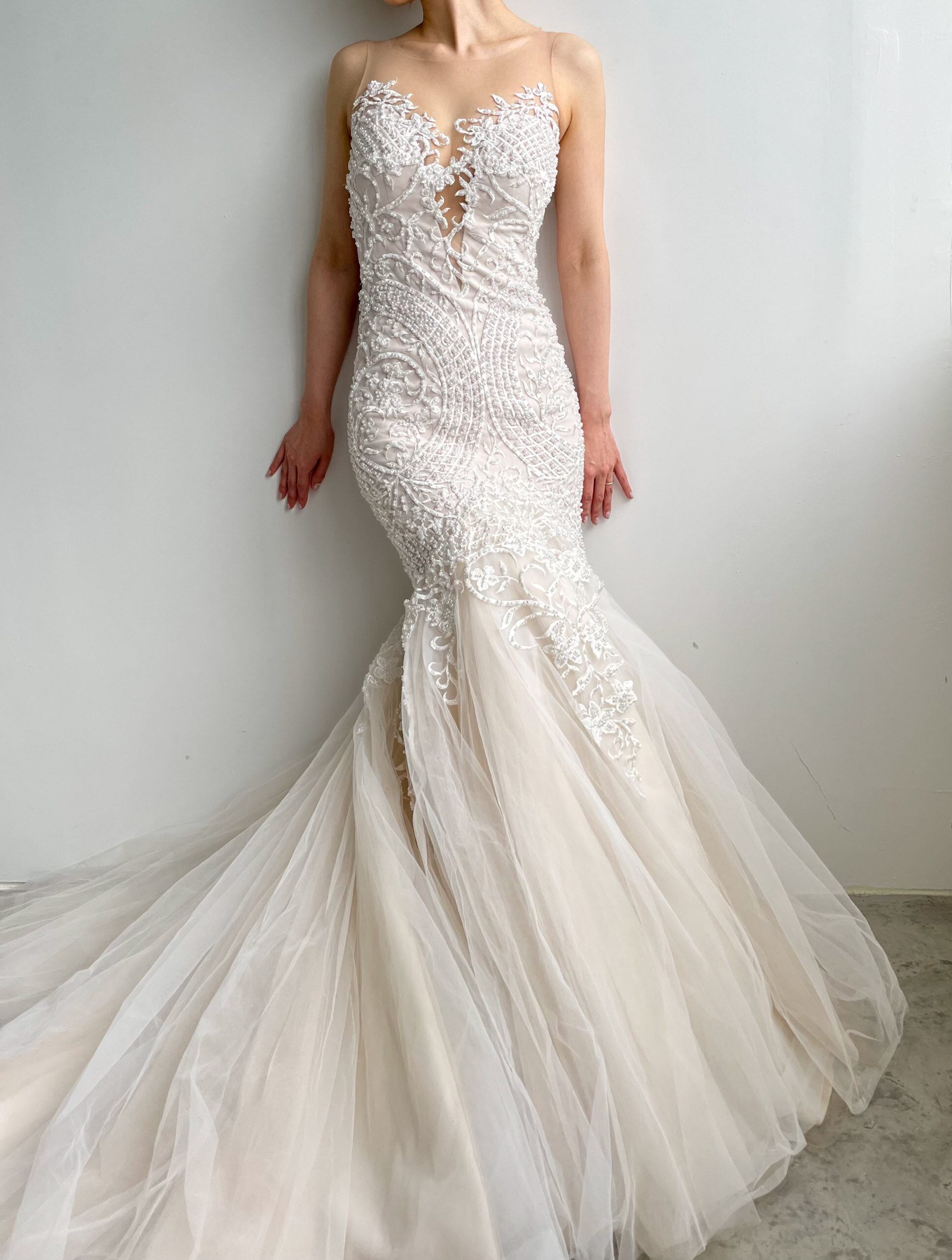 上品 ウエディングドレス 3D立体レース刺繍 ロングトレーン マーメイドライン 2次会 前撮り 花嫁 挙式
