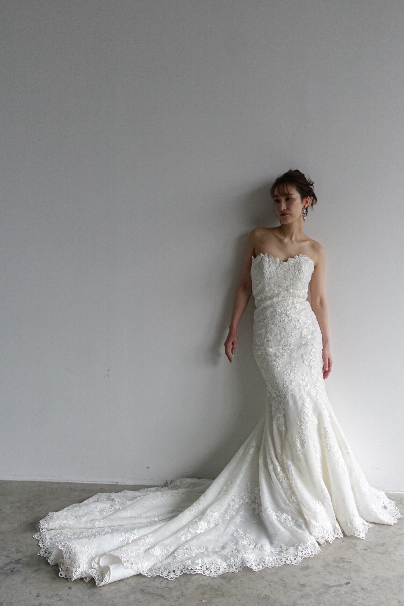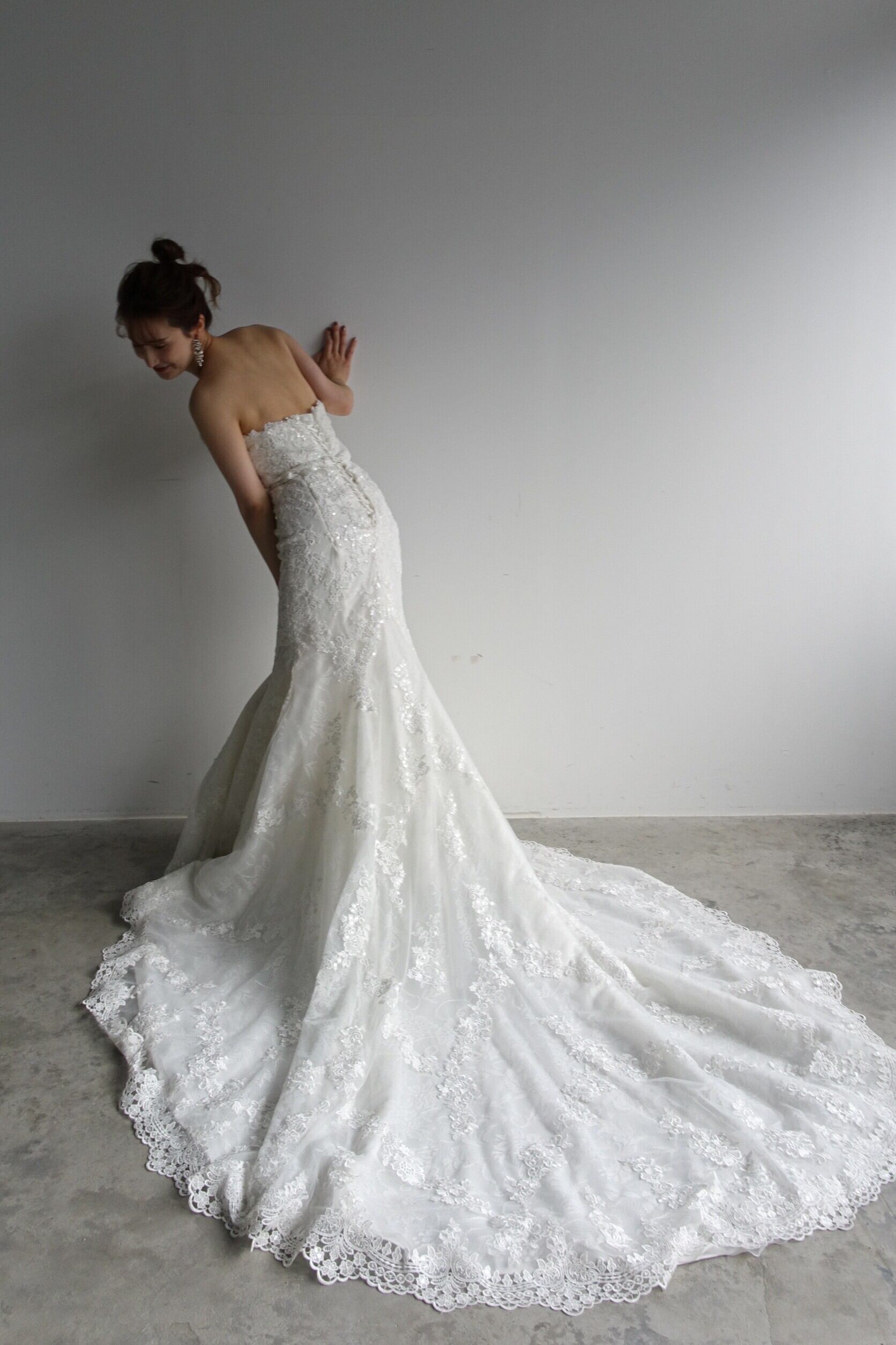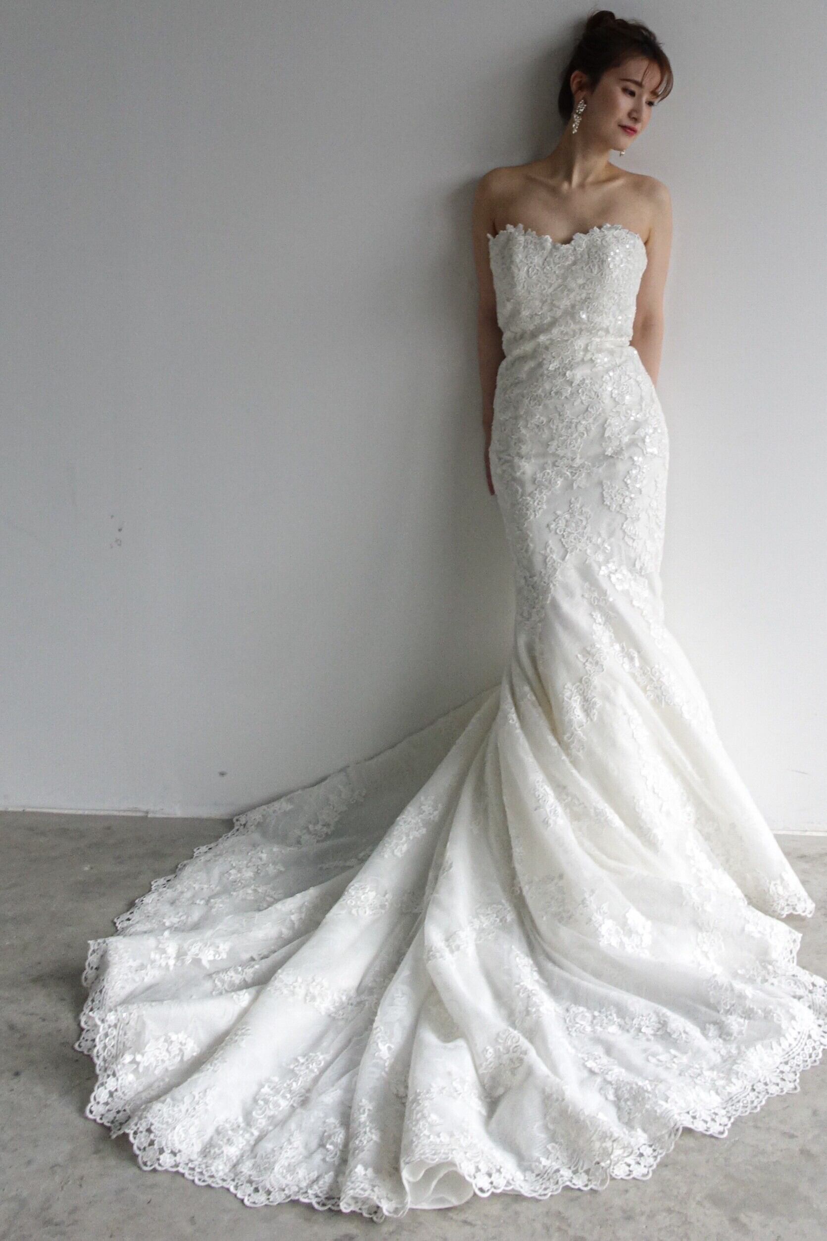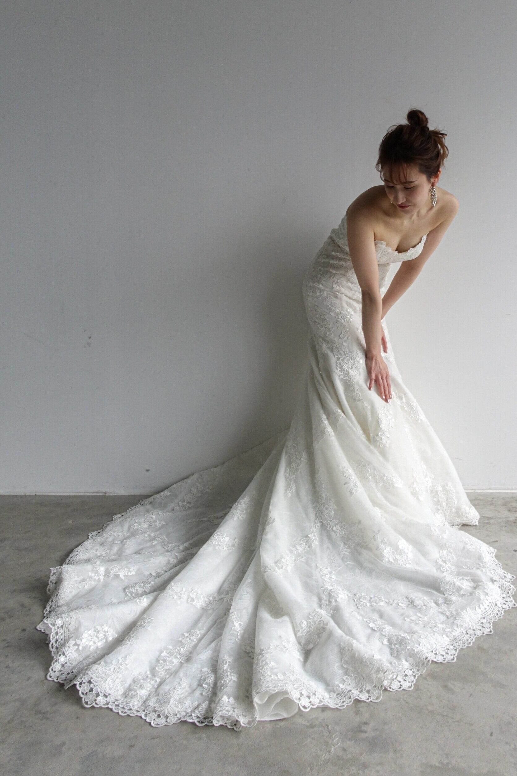 上品 ベアトップ ウエディングドレス 贅沢な総レース ロングトレーン マーメイドライン 2次会 前撮り 花嫁 挙式