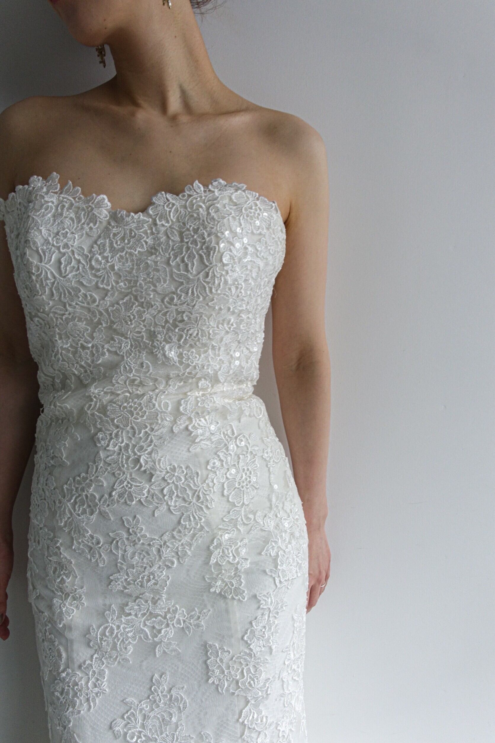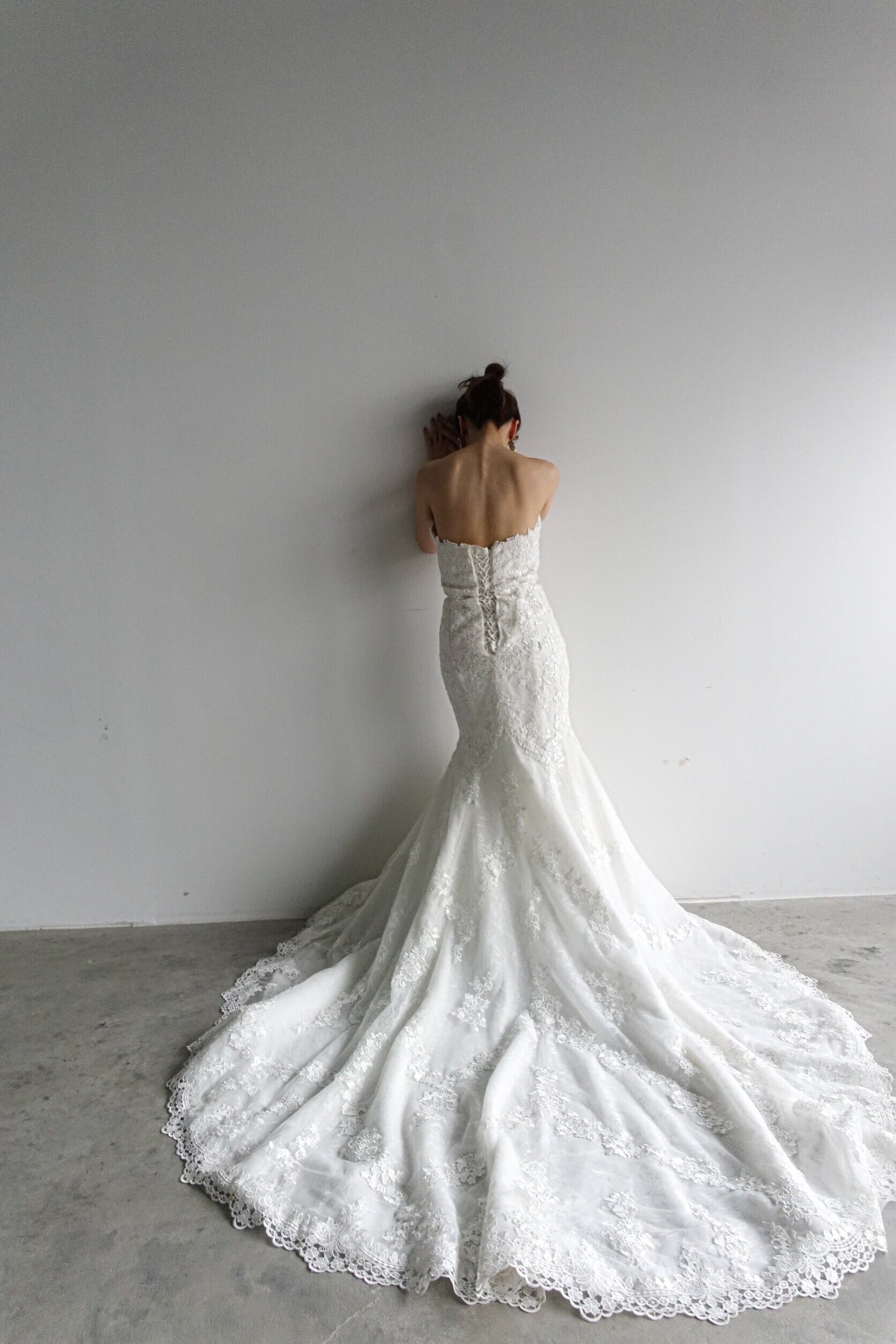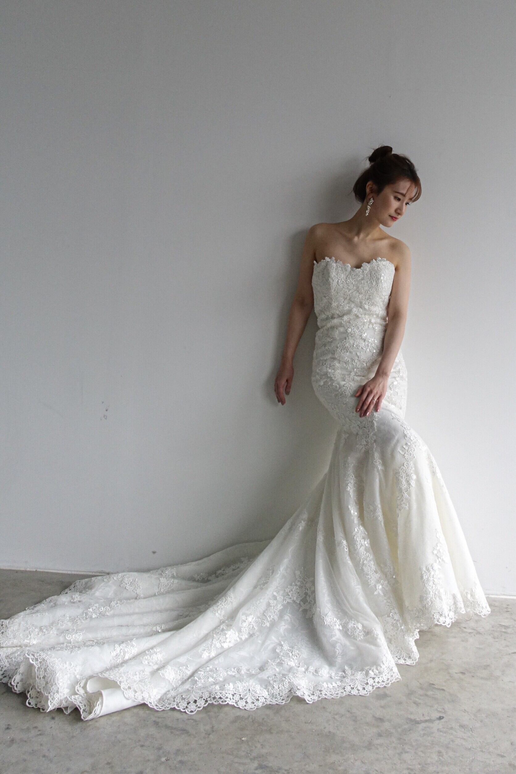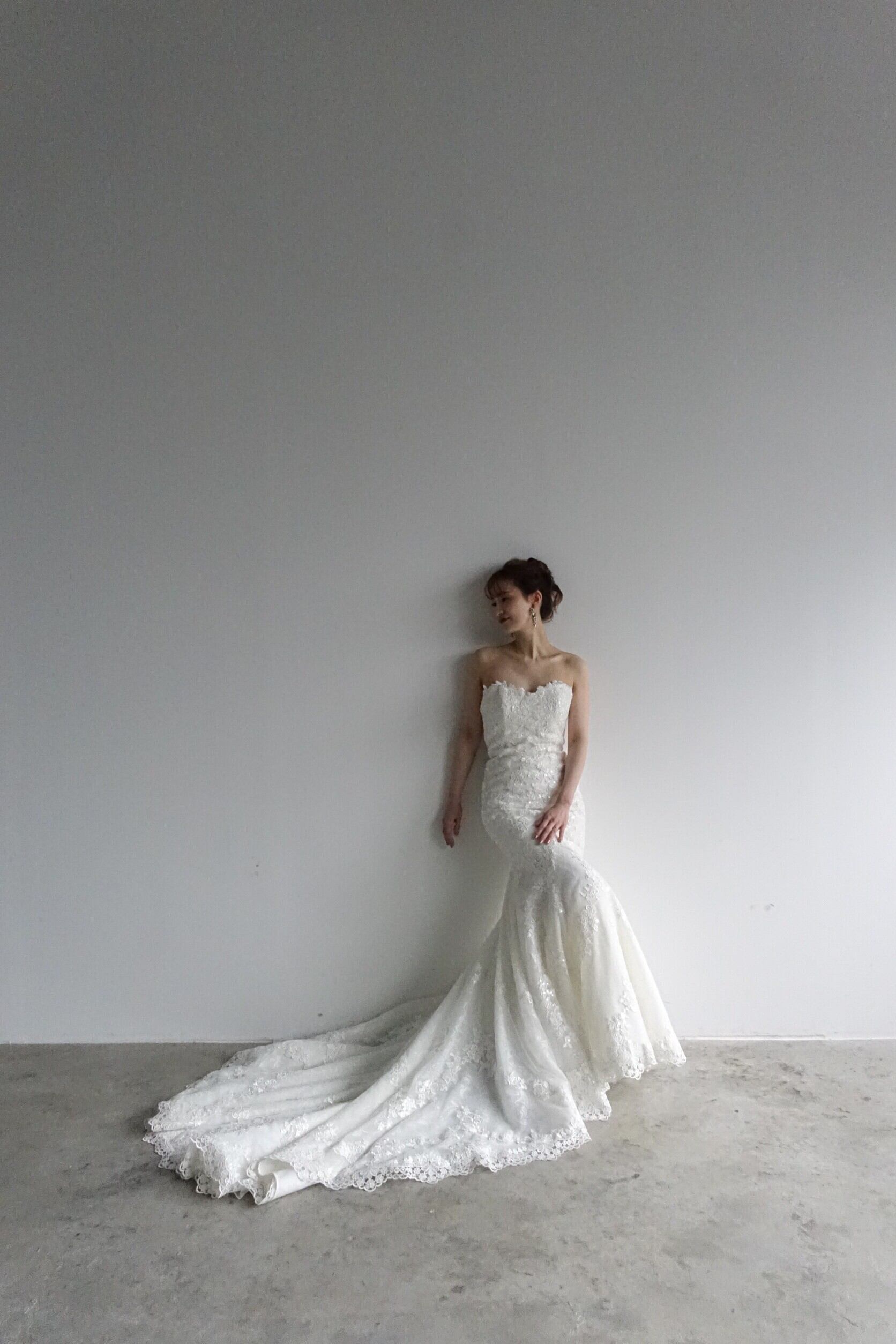 上品 ベアトップ ウエディングドレス 贅沢な総レース ロングトレーン マーメイドライン 2次会 前撮り 花嫁 挙式