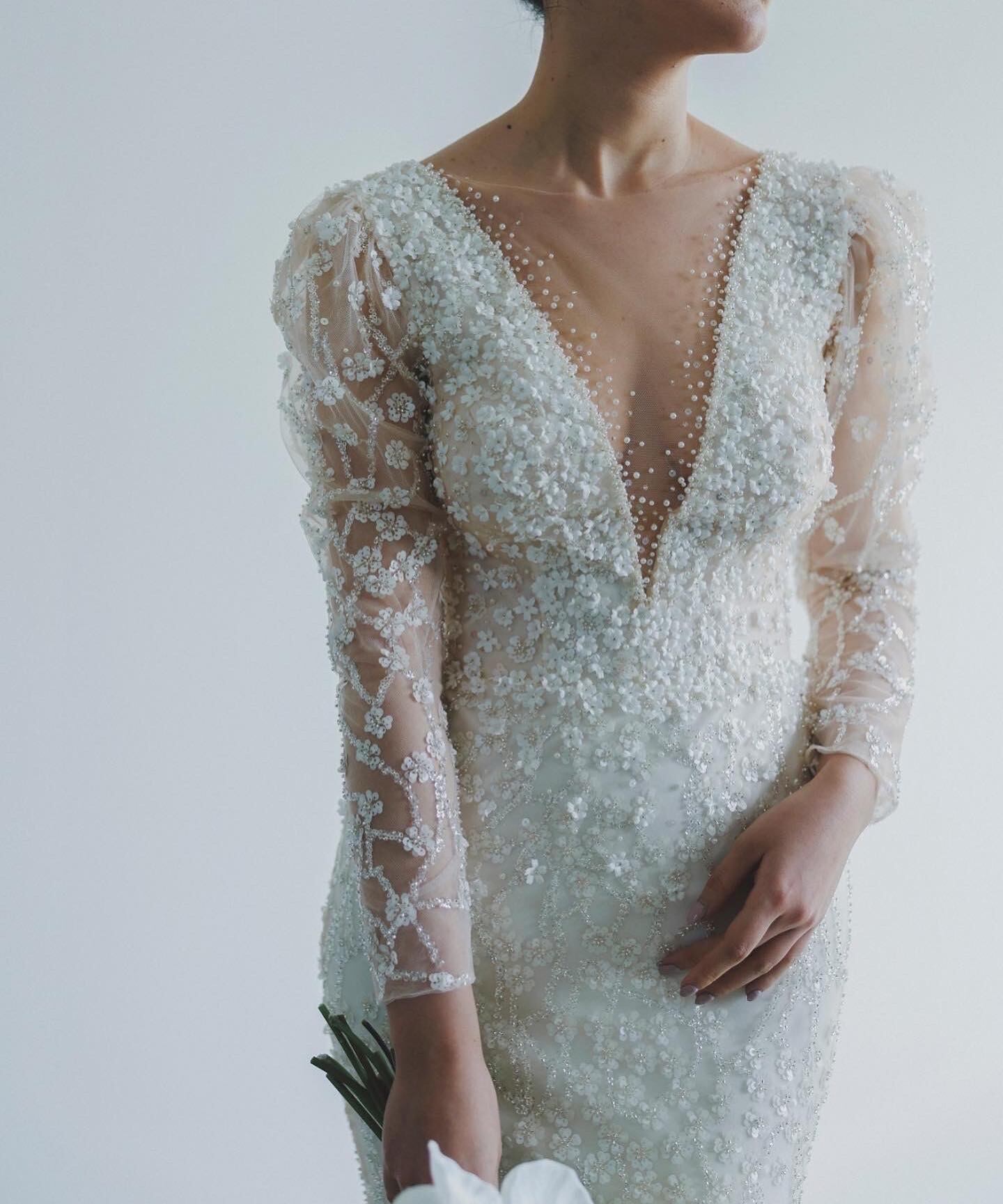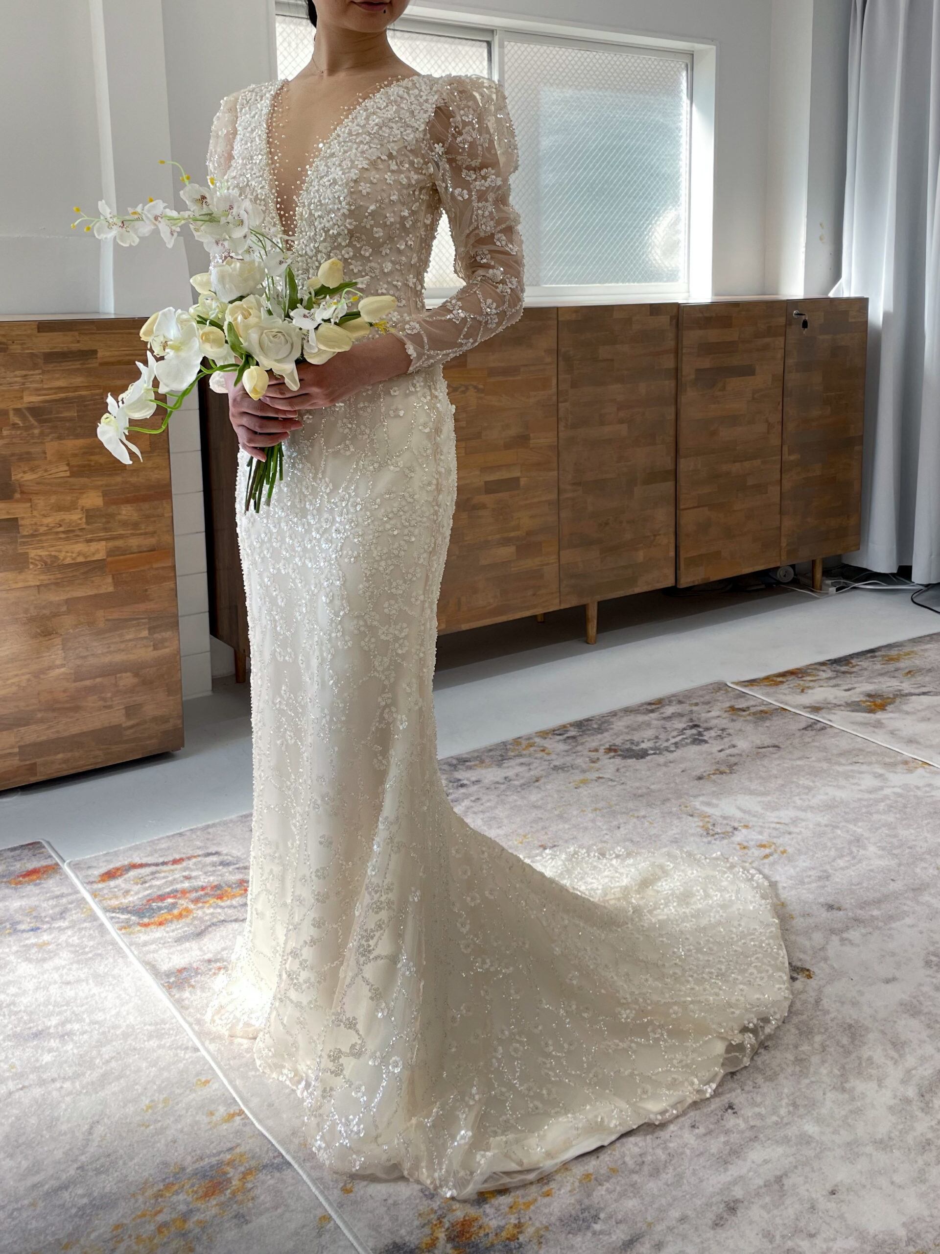 輝きな光彩を放つ Vネック 長袖 ウエディングドレス 贅沢な総レース ロングトレーン マーメイドライン 2次会 前撮り 花嫁 挙式