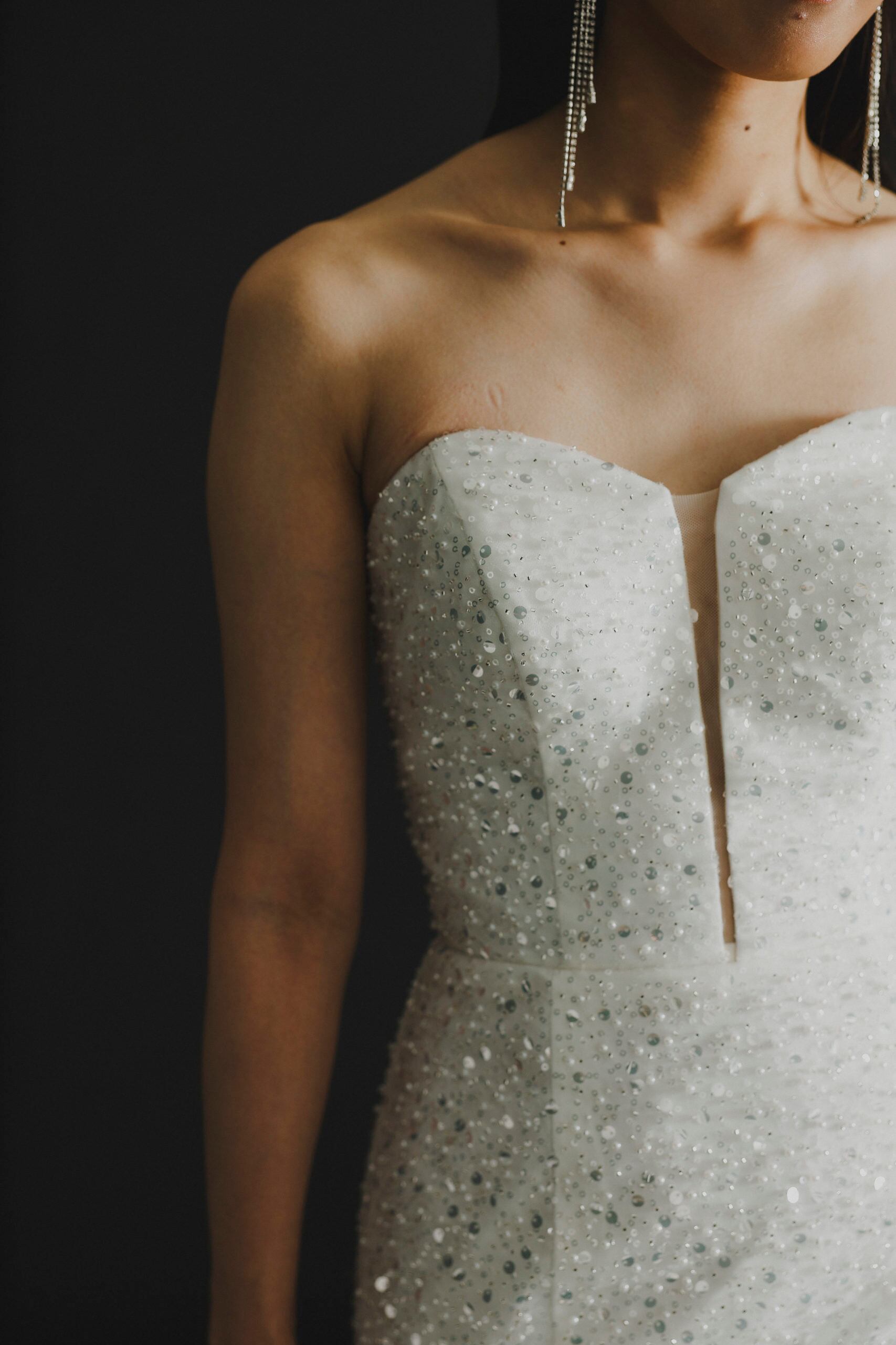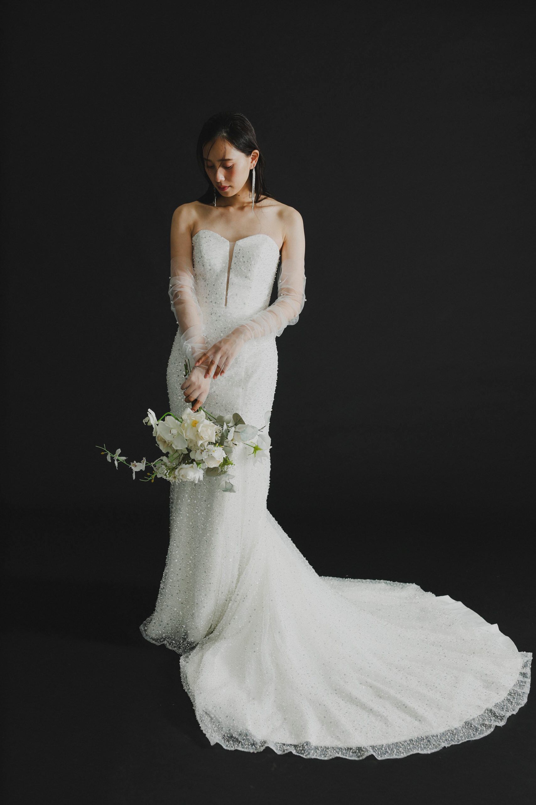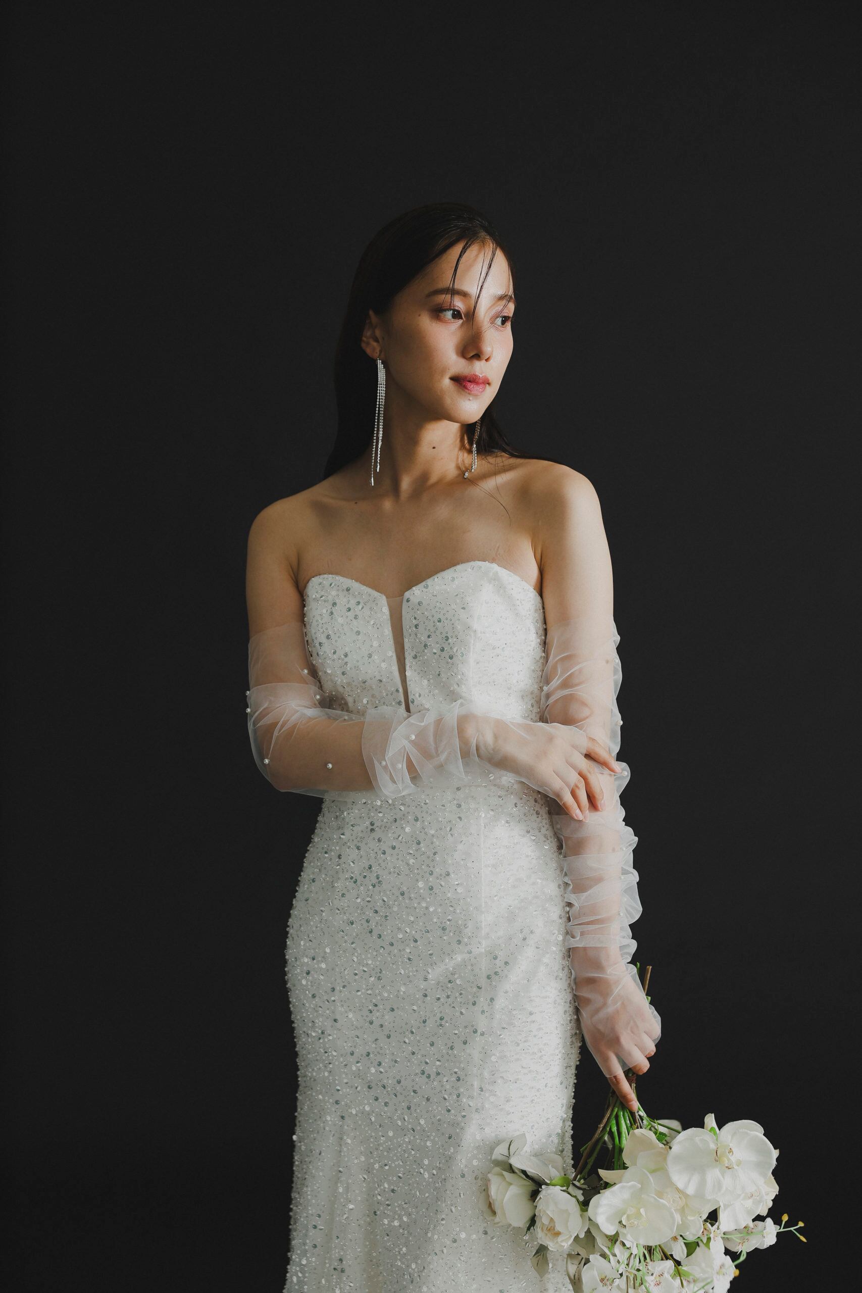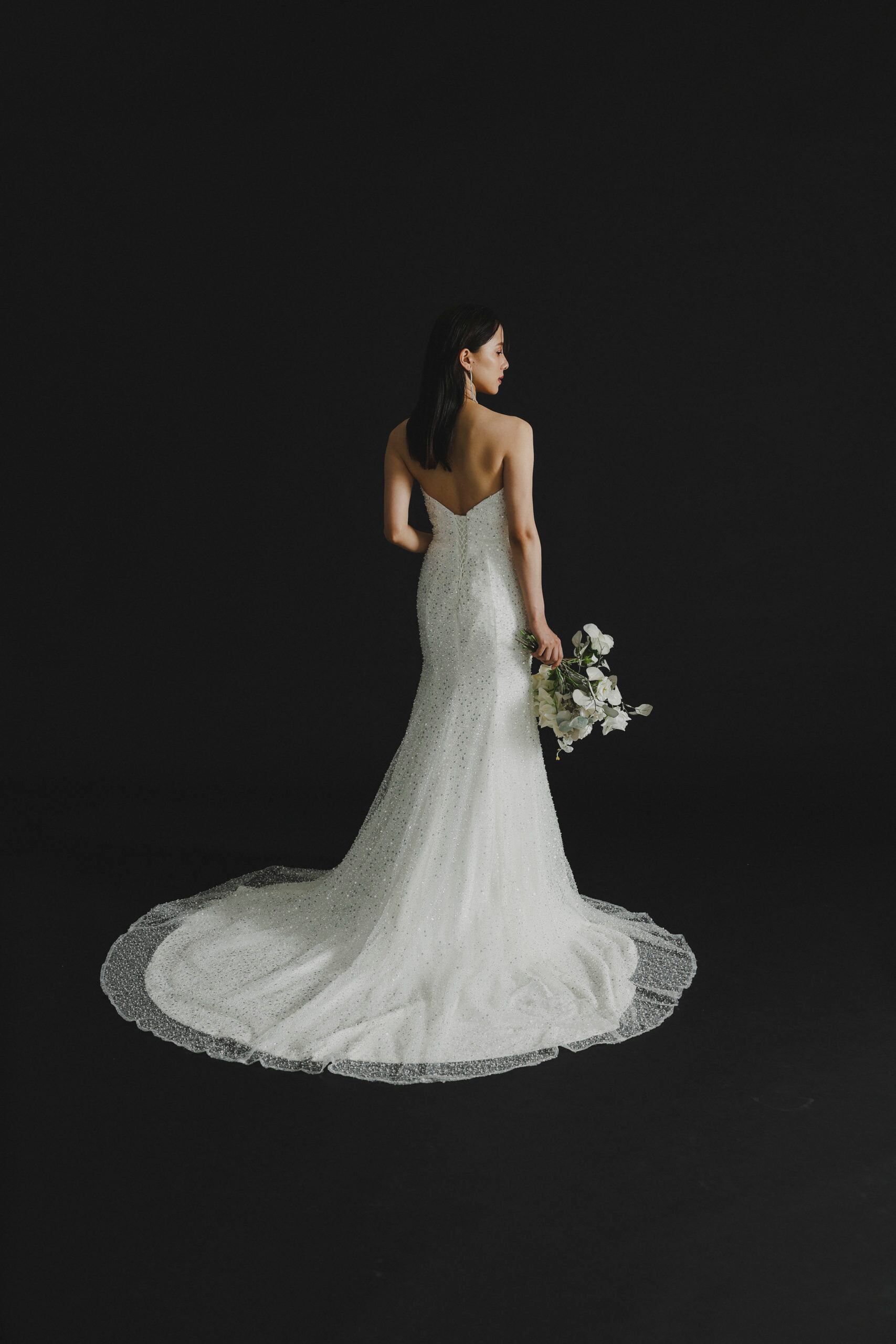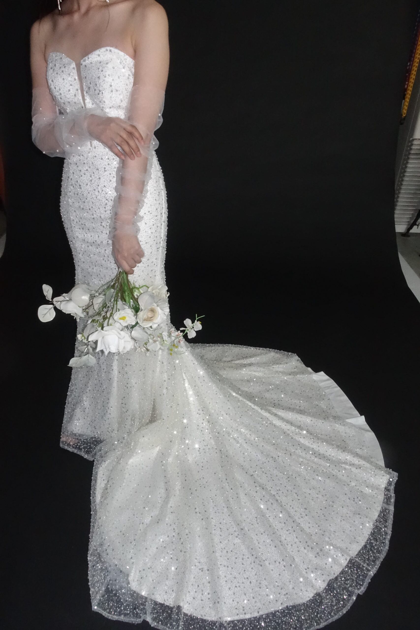 ベアトップ ウエディングドレス キラキラスパンコール ロングトレーン マーメイドライン 2次会 前撮り 花嫁 挙式