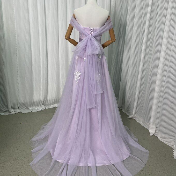 実例写真!人気上昇!紫 オフショルダー リーフ刺繍 ソフトチュール カラードレス パーティードレステラコッタ結婚式/披露宴