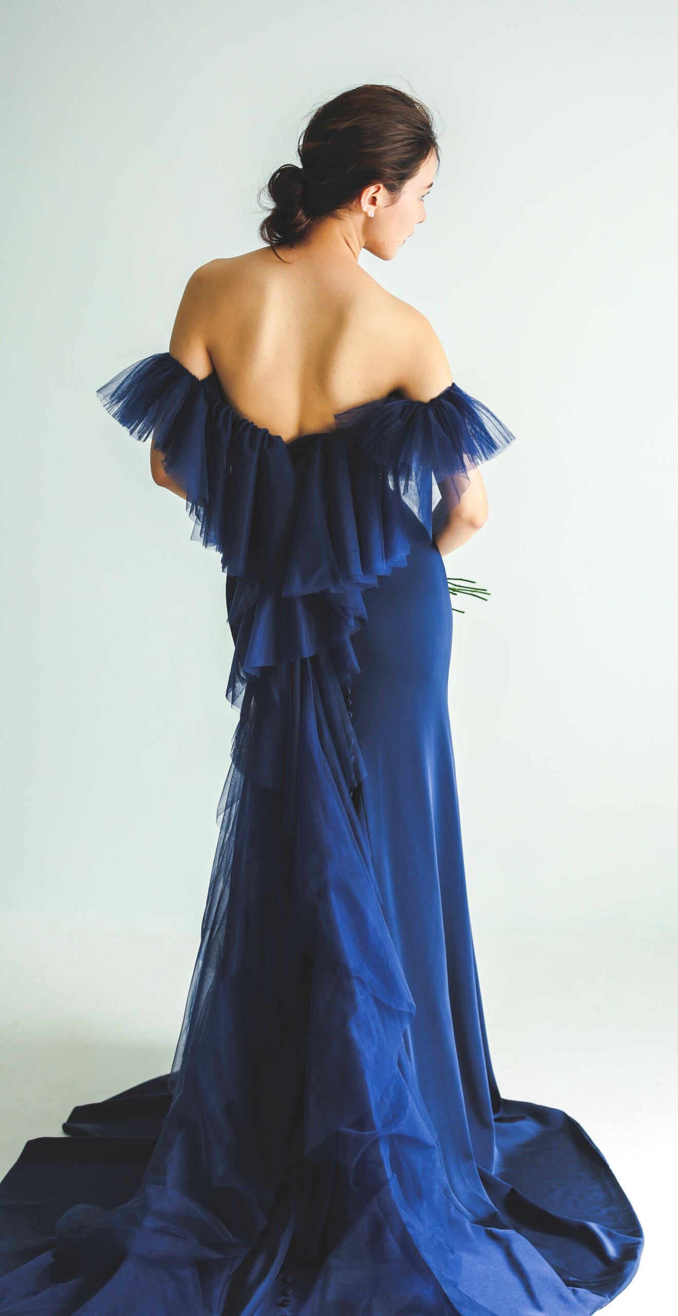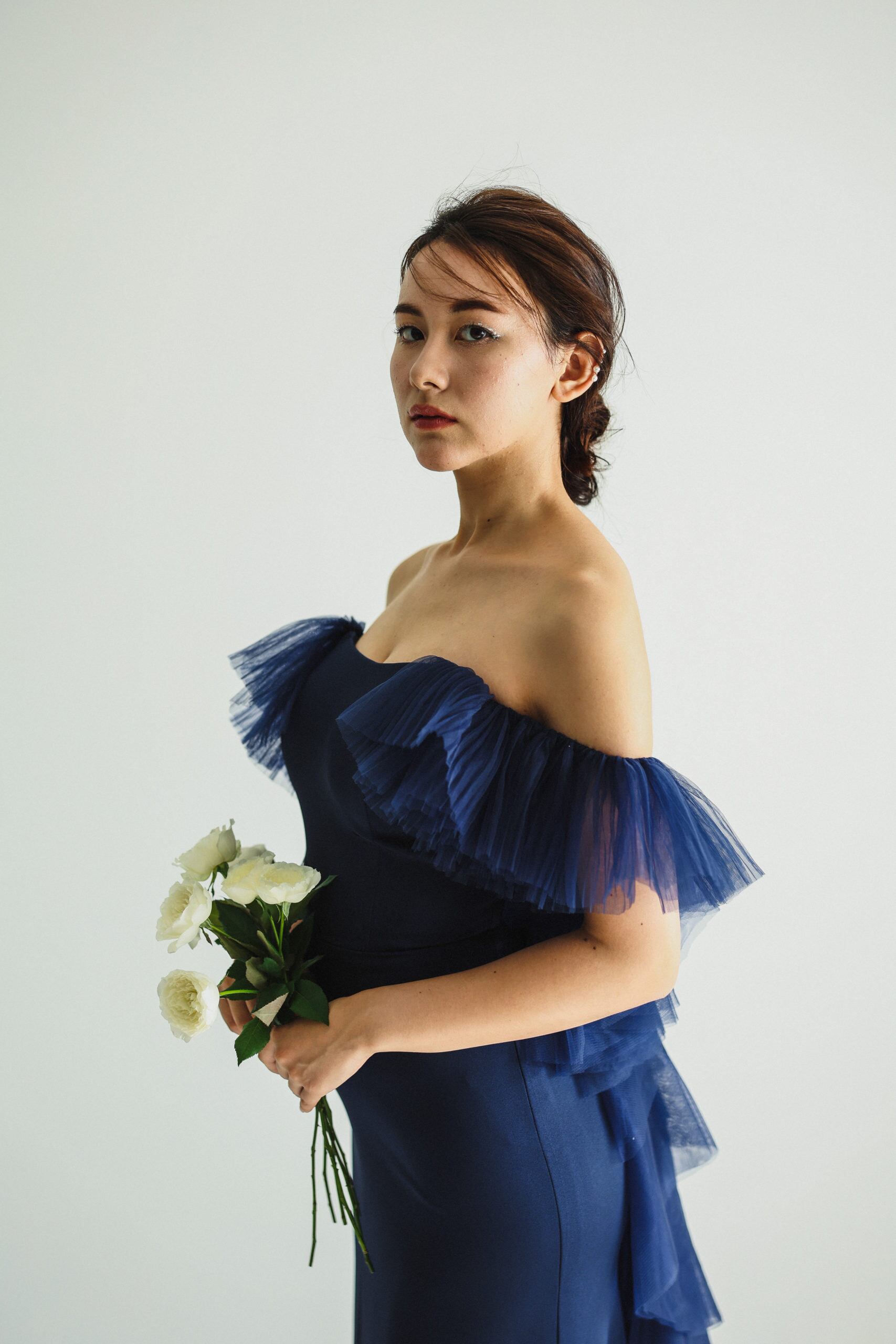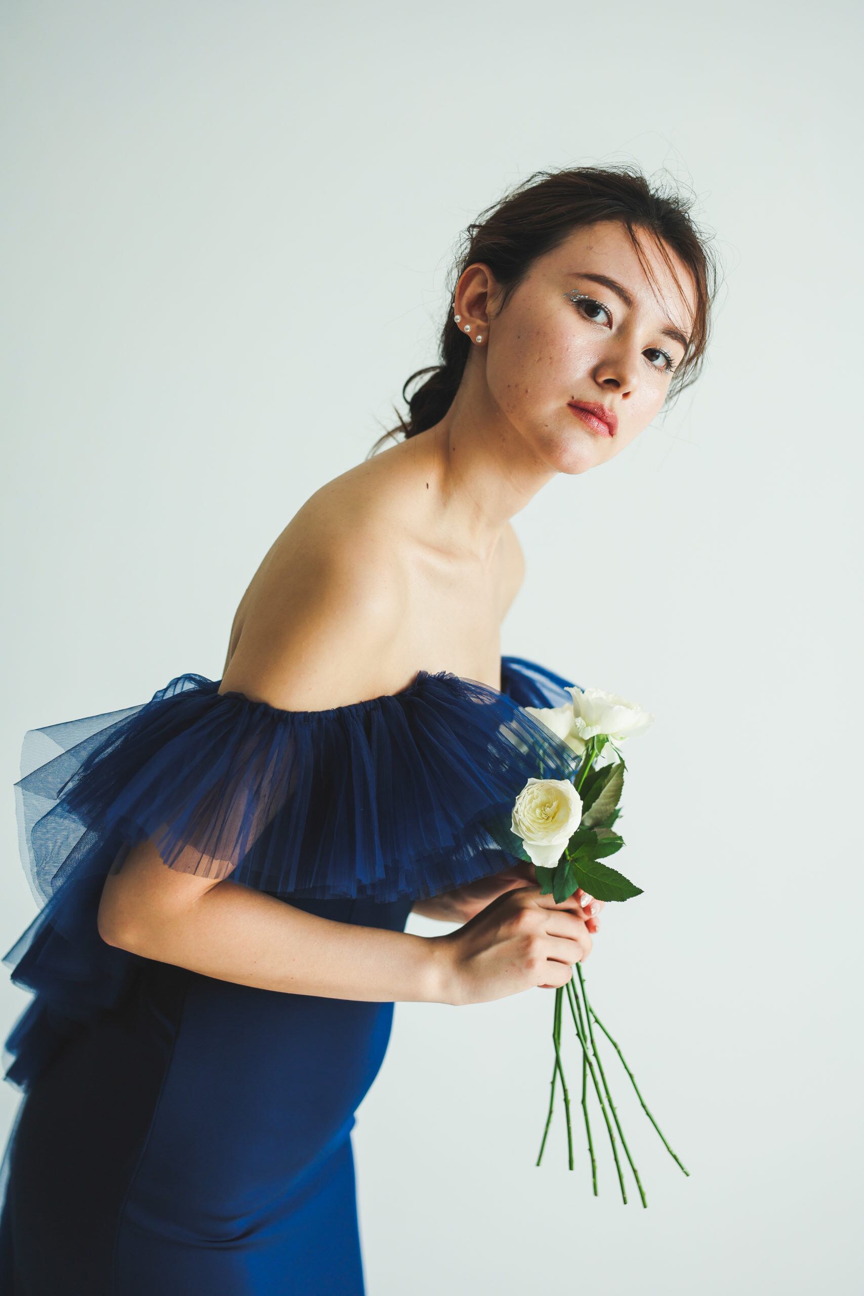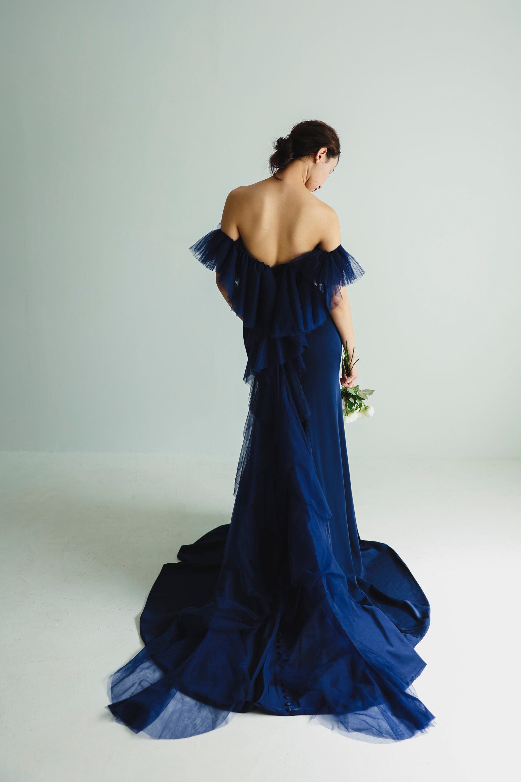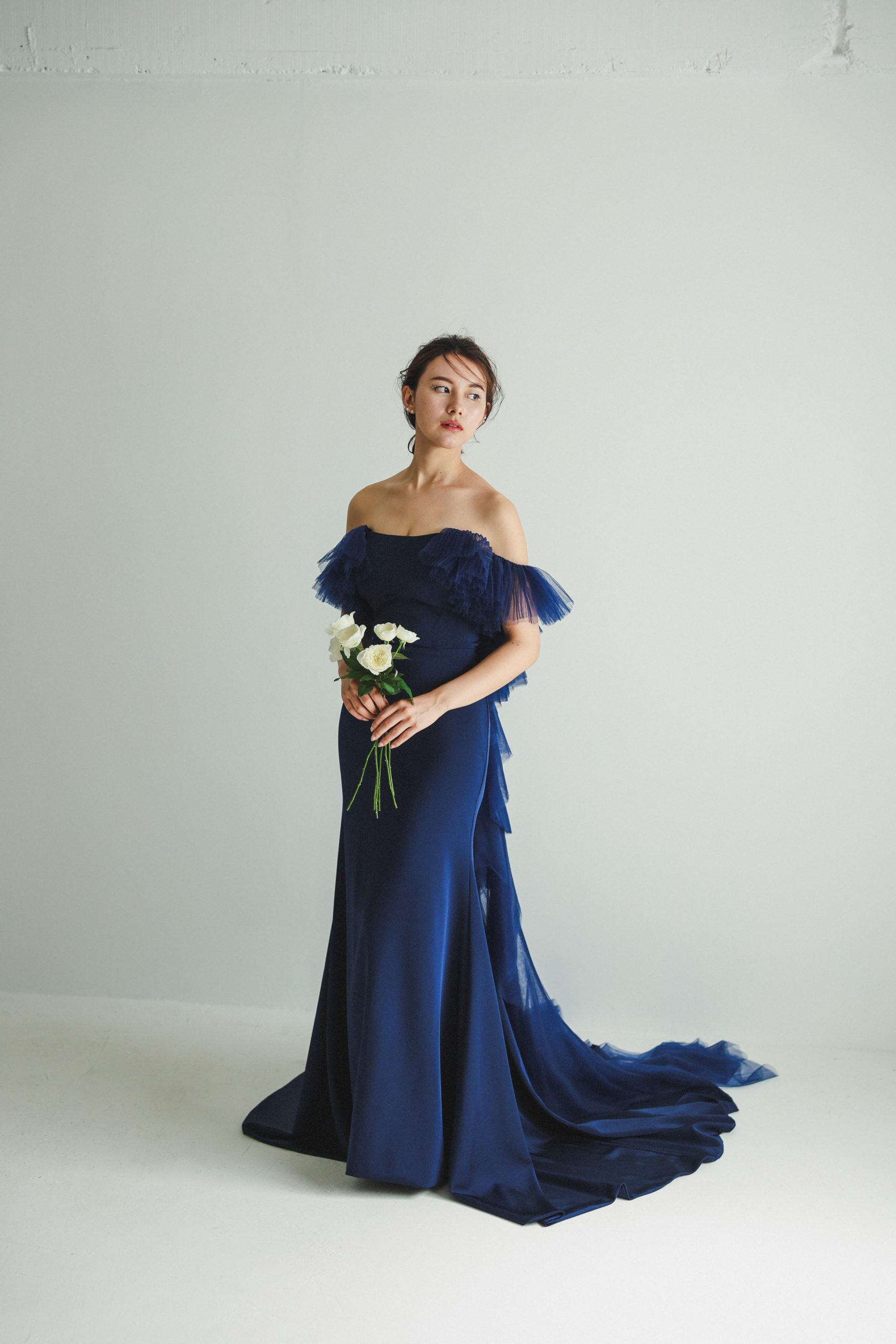人気上昇!ネイビー オフショルダー カラードレス パーティードレステラコッタ結婚式/披露宴