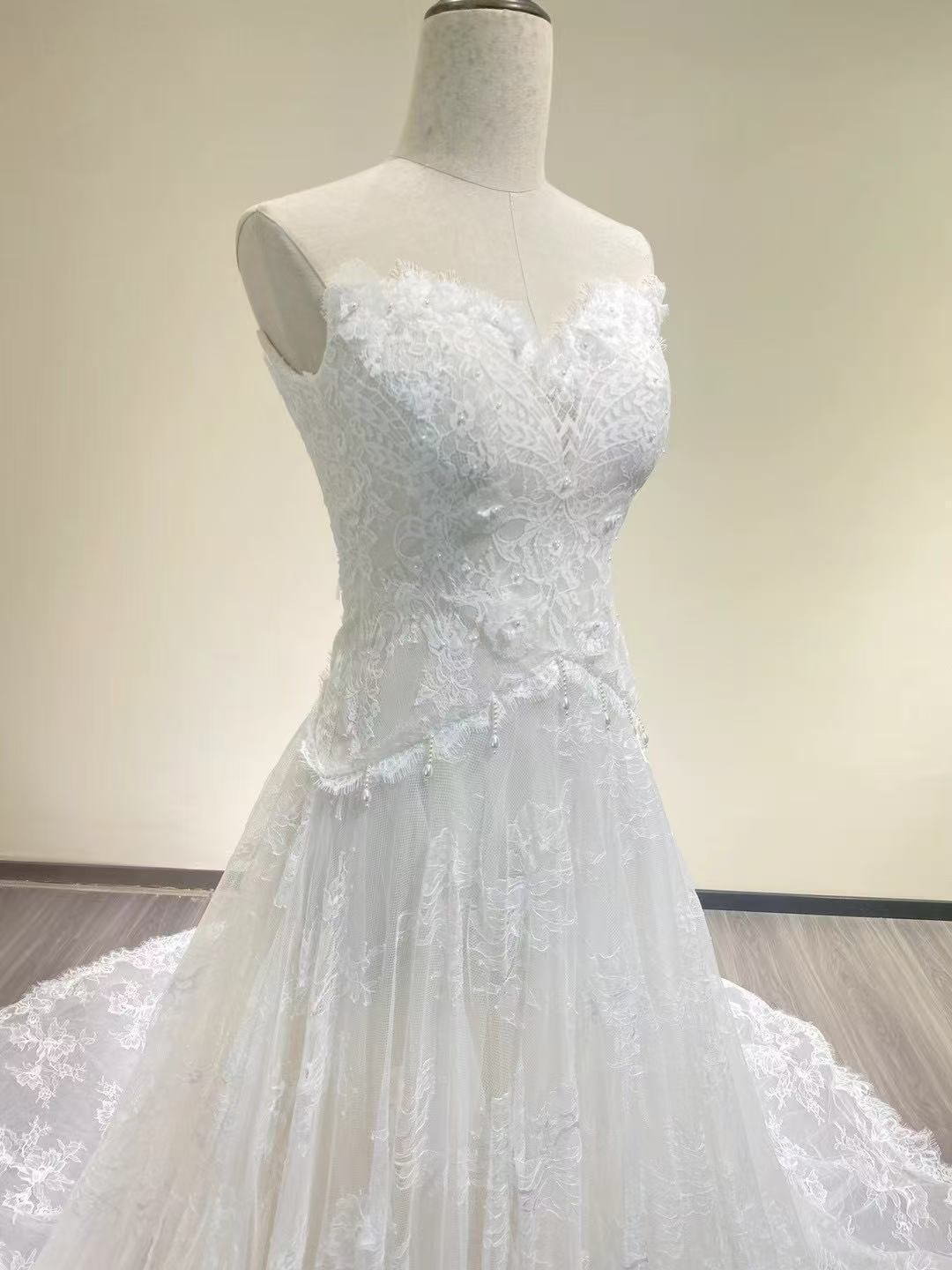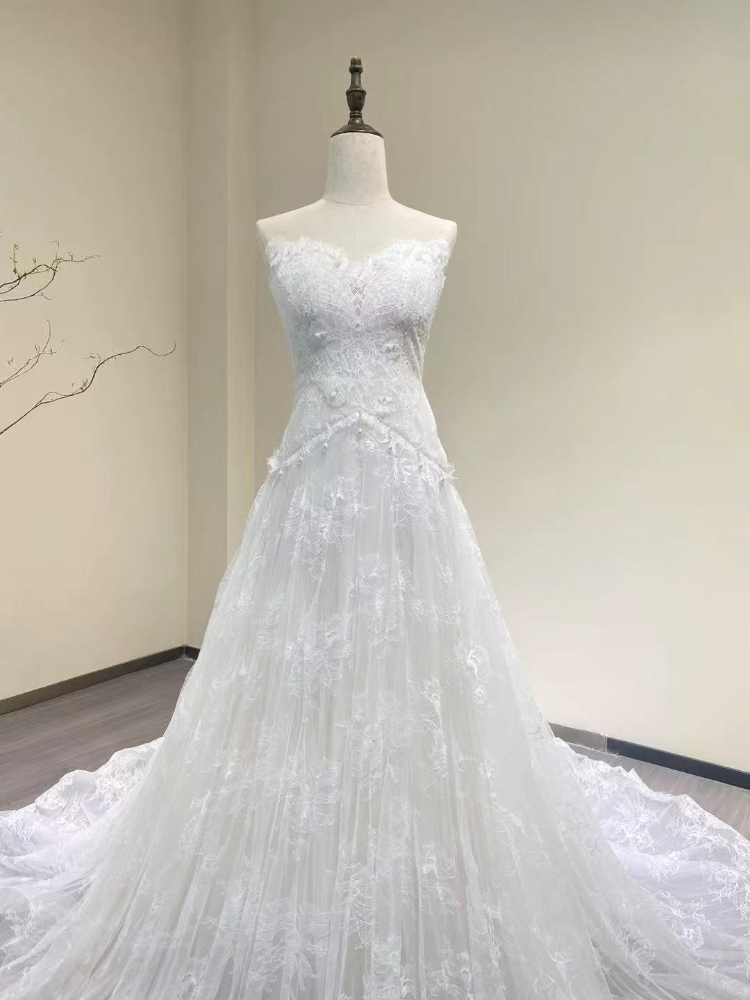 総レース ベアトップ ウエディングドレスロングトレーンビジュードレス グリッターチュール 結婚式 /前撮り/ 披露宴