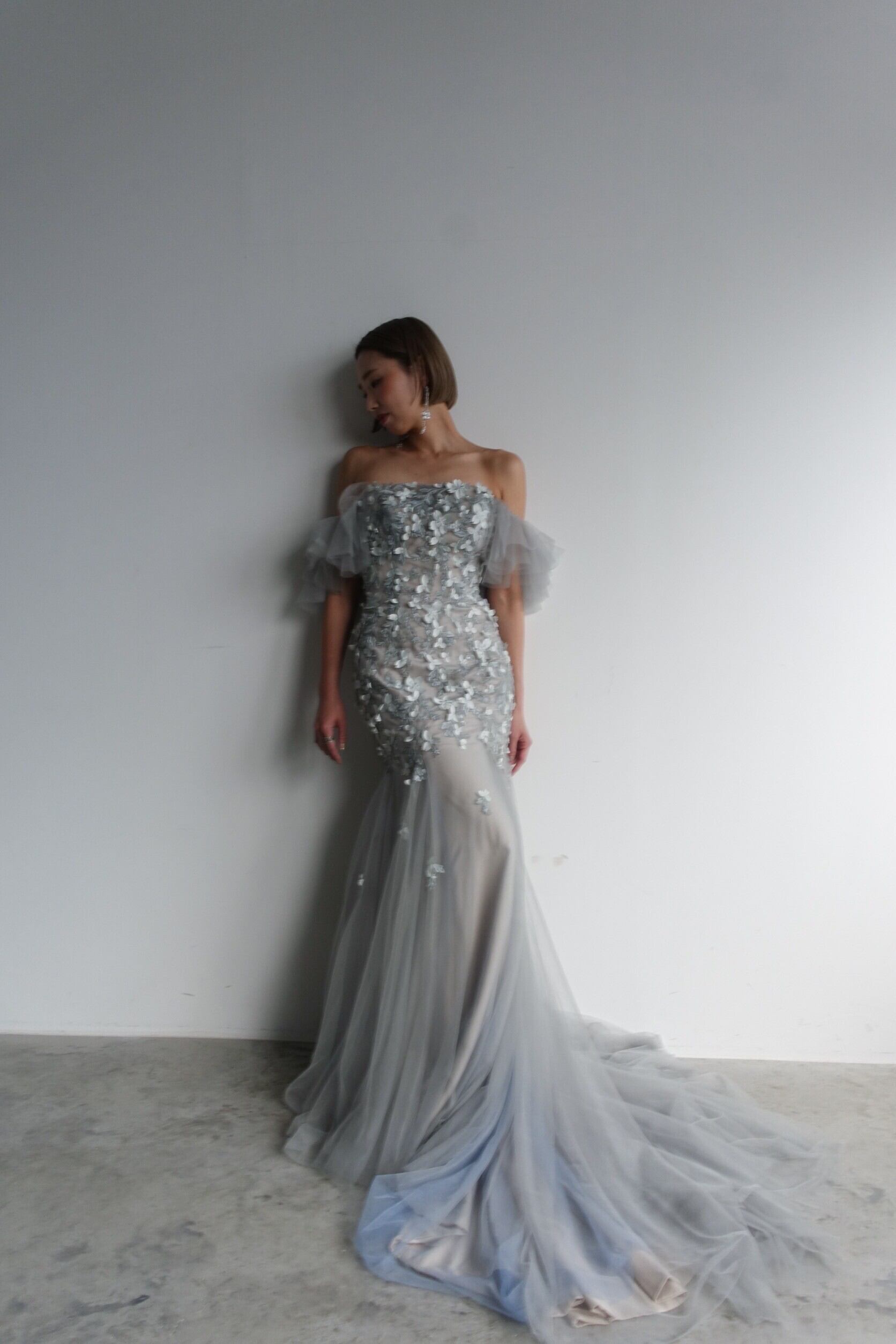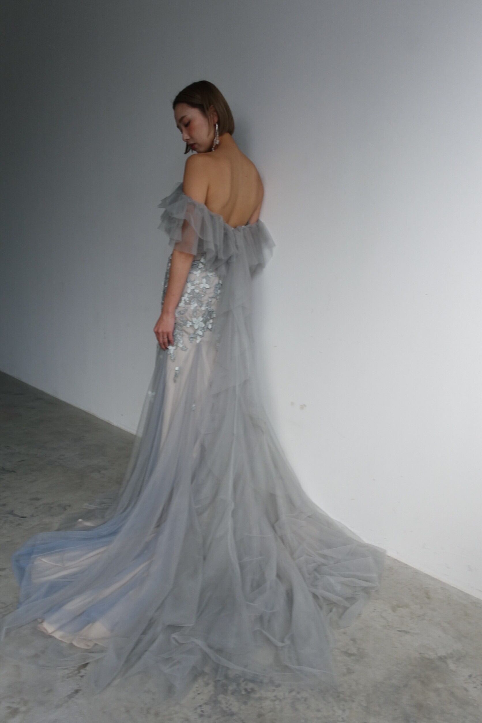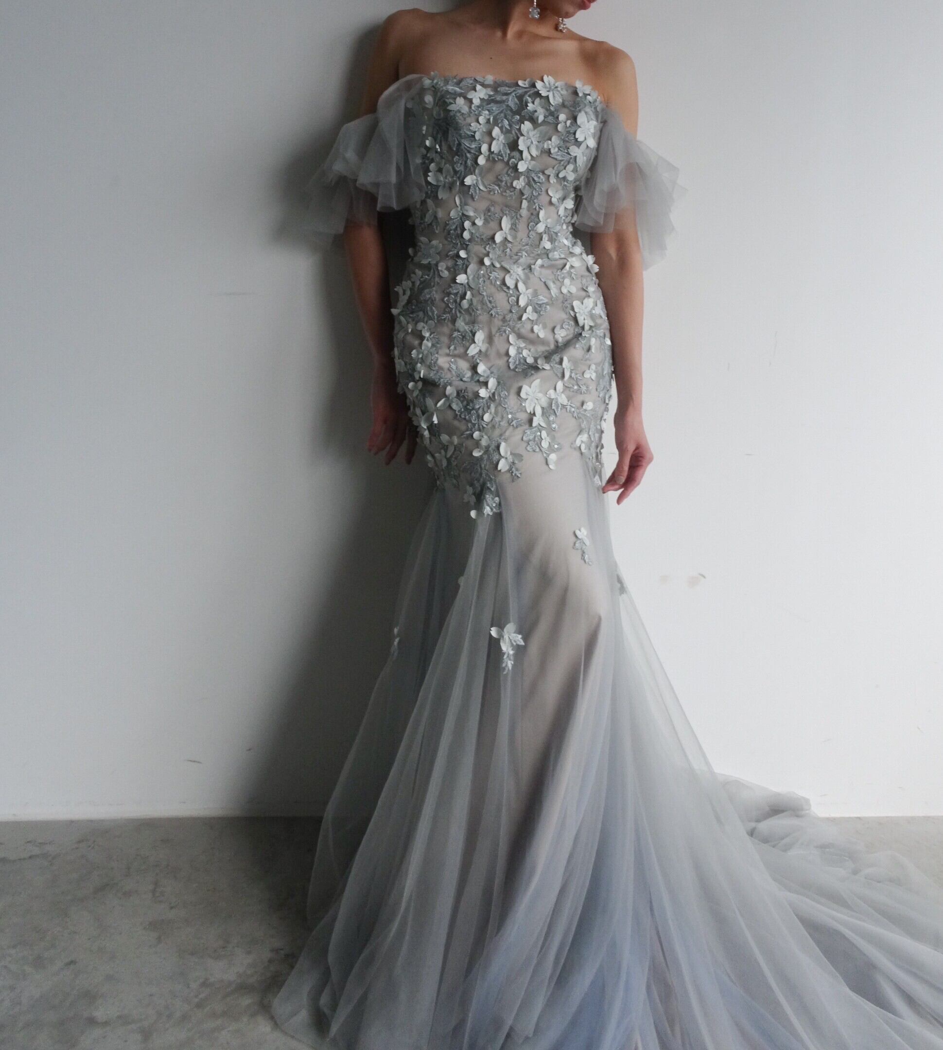 人気上昇!グレー オフショルダー 3D立体レース刺繍 カラードレス マーメイドライン パーティードレステラコッタ結婚式/披露宴