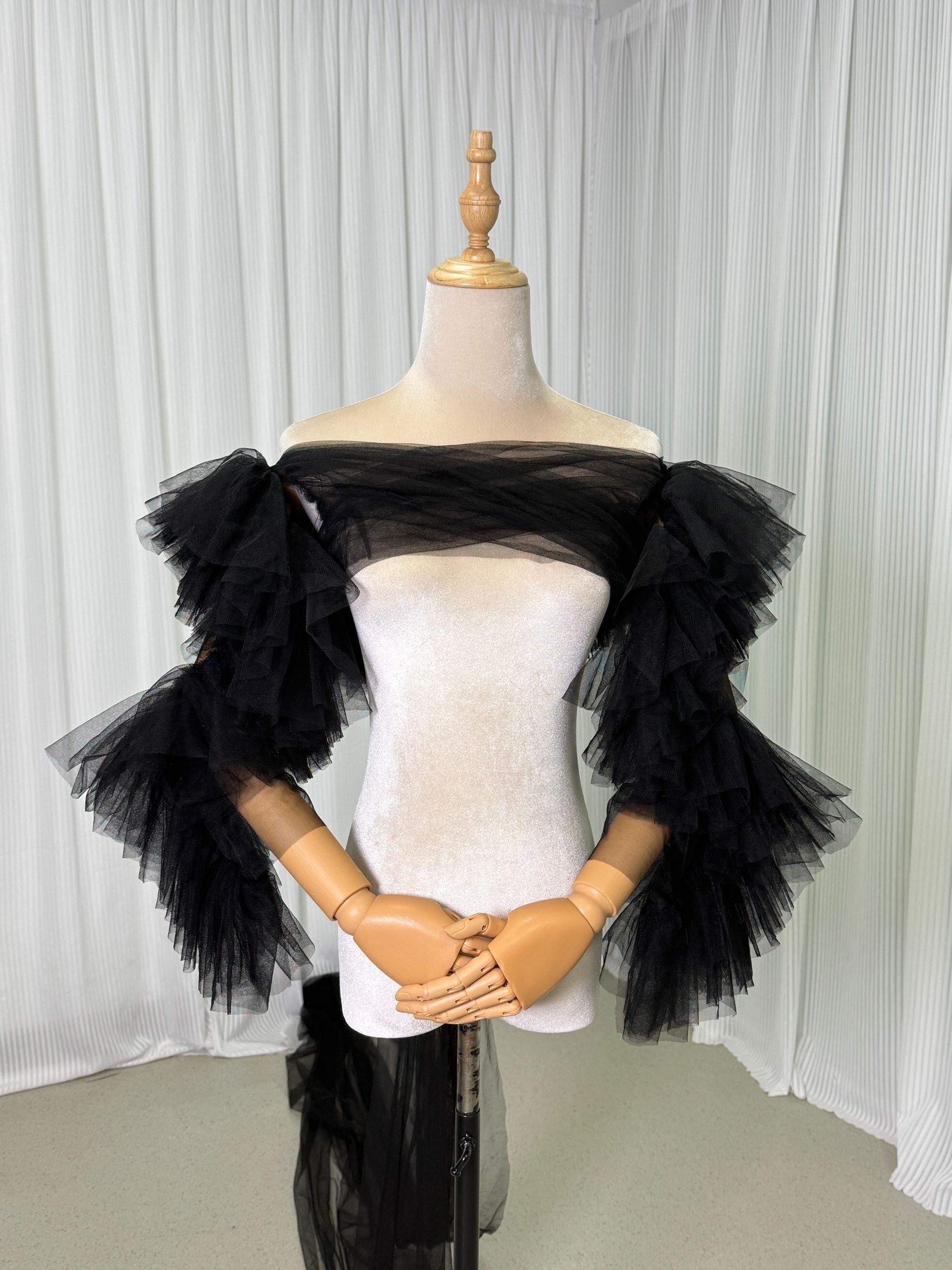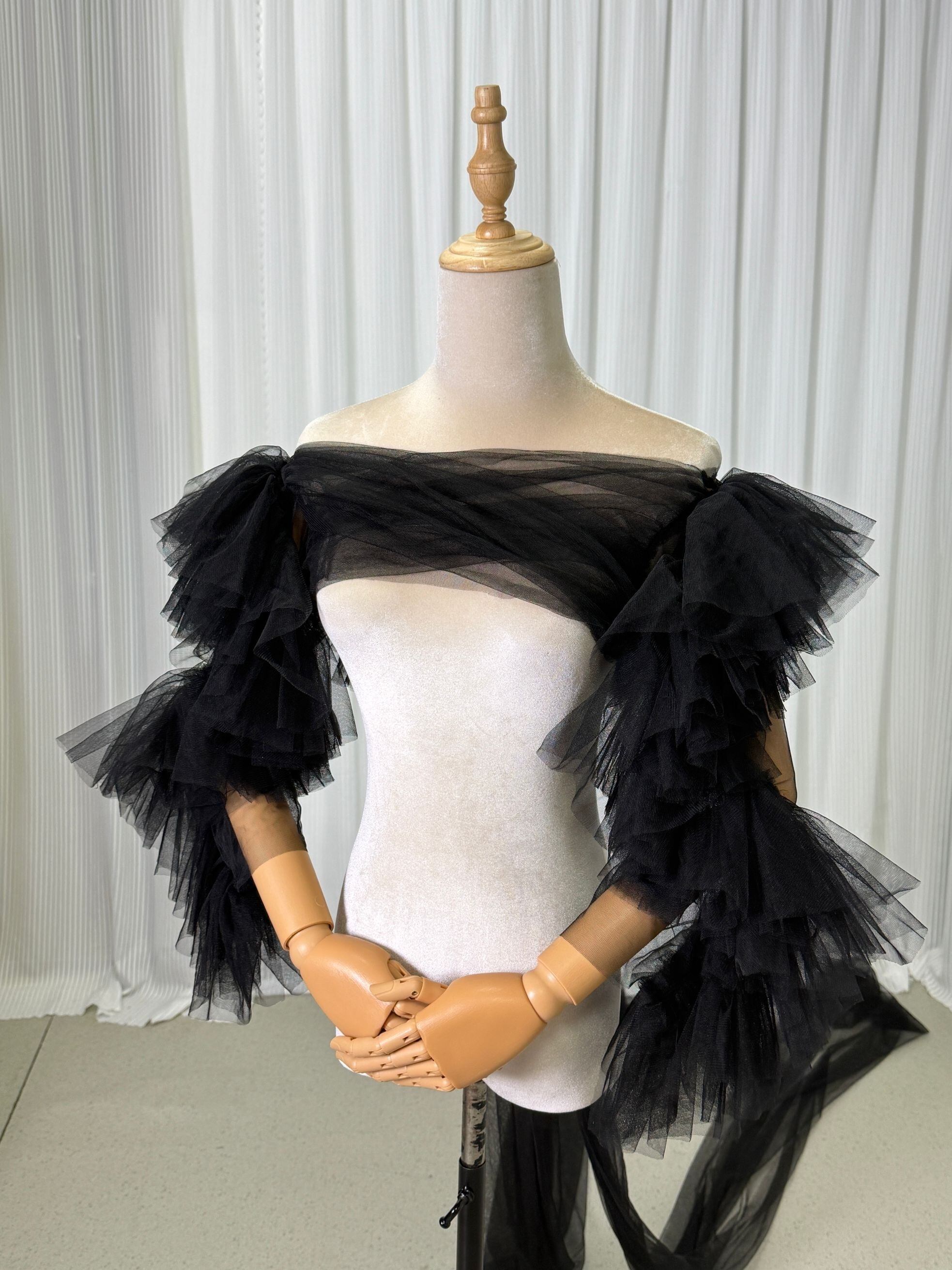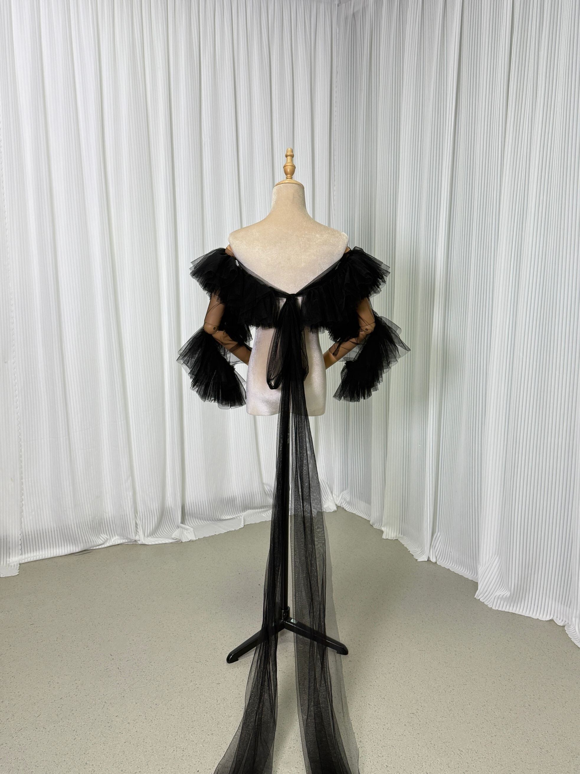 料無料!ウエディングドレスソフトチュール  黒 色 オフショルダー サイズ調整可能 ドレスアレンジ お色直し