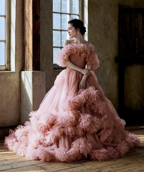 人気上昇!ピンクブラウン カラードレス パフスリーブ 柔らかく重ねたチュールスカート 華やかなトレーン 結婚式/披露宴/前撮り