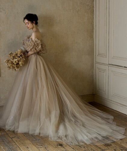 上品 ブラウンカラードレス シャンパン色 キラキラチュール パフスリーブ 華やかなトレーン 結婚式/披露宴/前撮り