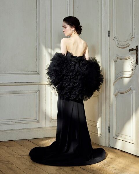 上品 黒 カラードレス ソフトマーメイドライン パフスリーブ + ソフトチュール ポンチョ結婚式/披露宴/前撮り