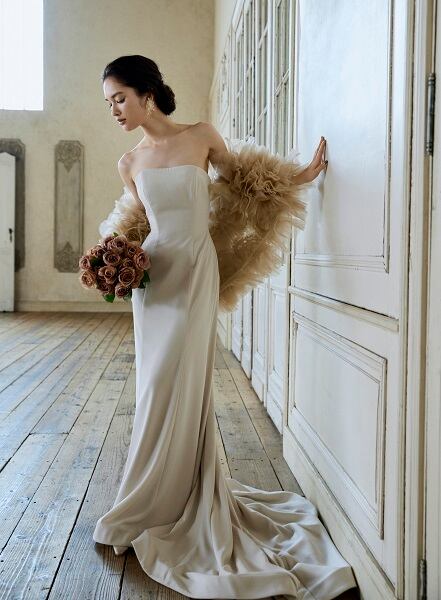 上品 オフホワイト カラードレス ソフトマーメイドライン パフスリーブ + カーキ色 ソフトチュール ポンチョ結婚式/披露宴/前撮り