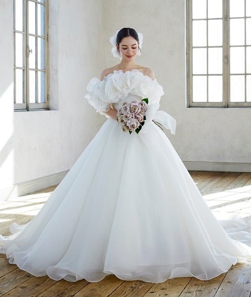 豪華! ホワイト オフショルダー ウェディングドレス プリンセスライン 華やかなトレーン 結婚式/披露宴