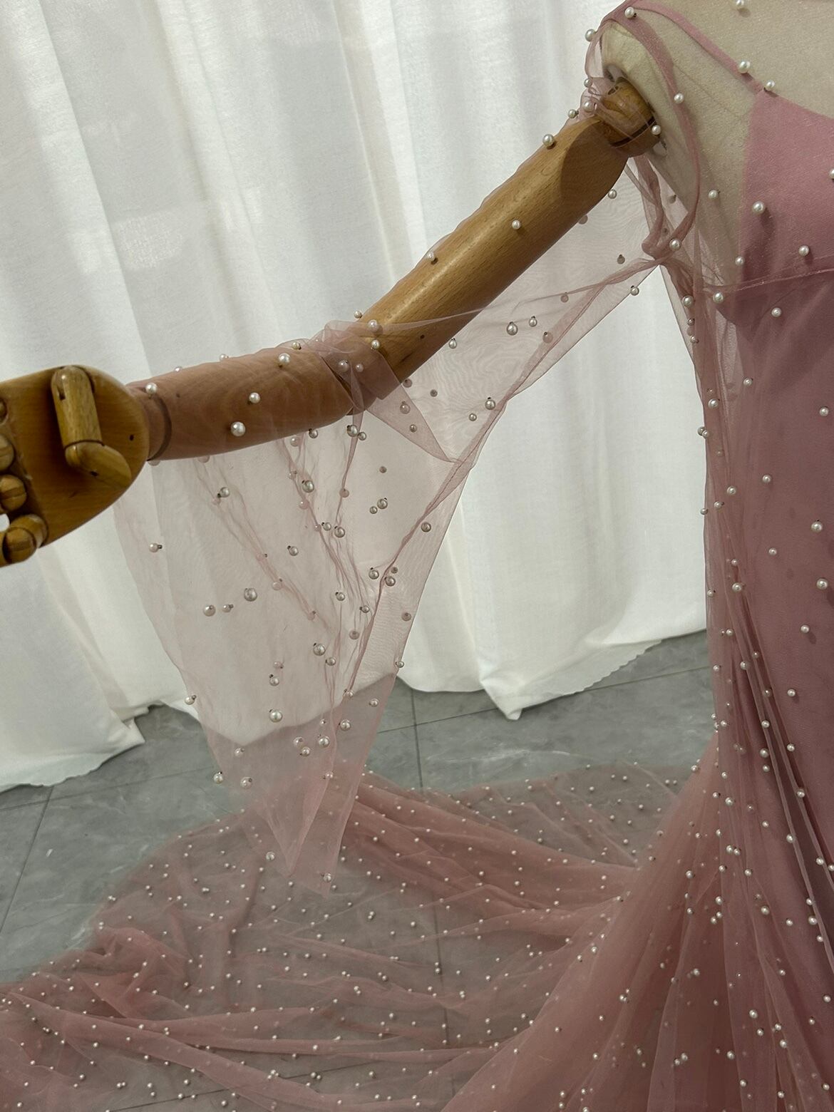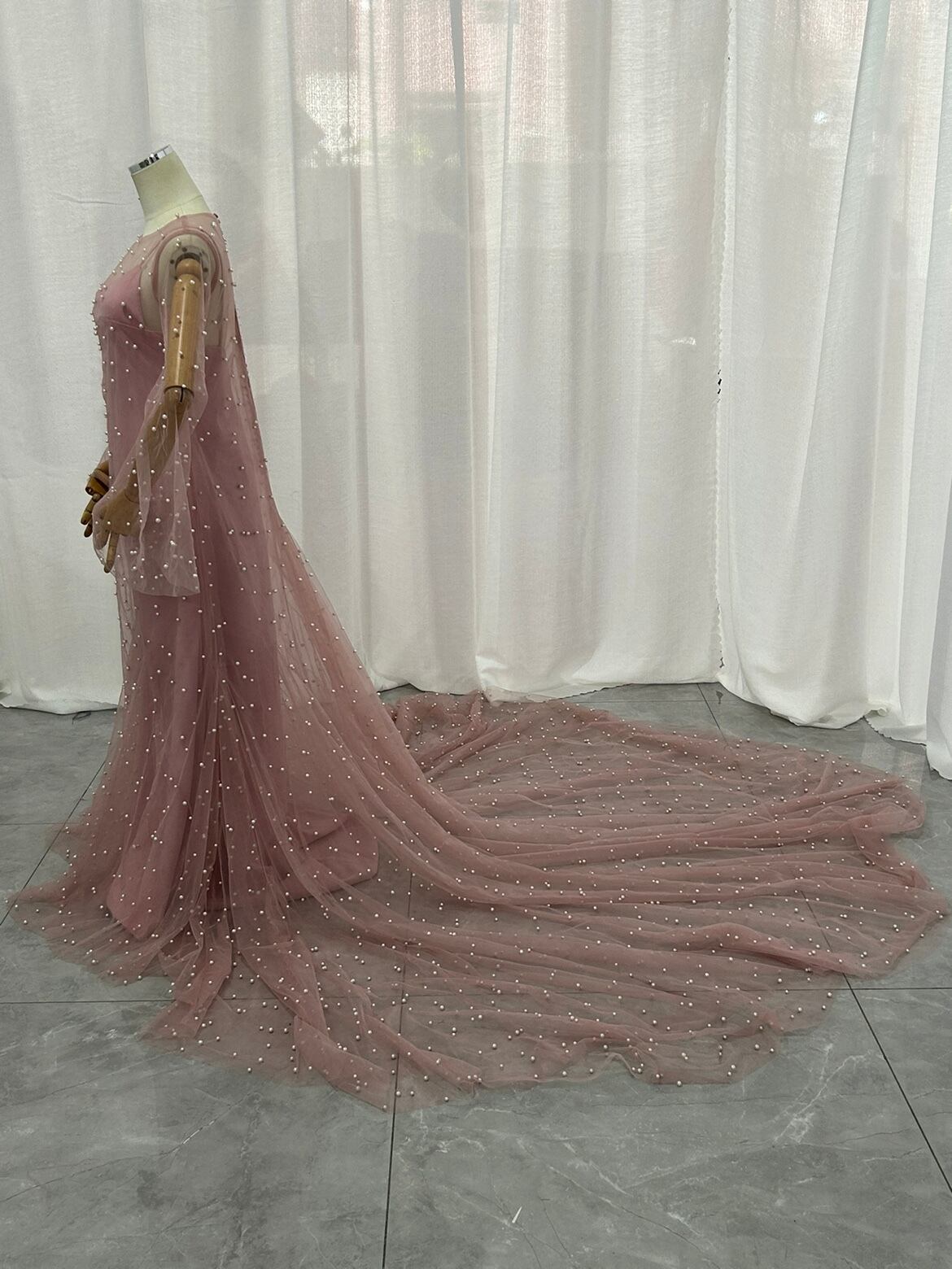 高品質! ピンク キャミソール カラードレス 華やか 贅沢 パール ラッパ袖+オーバードレス 2点セット 結婚式/披露宴 2次会