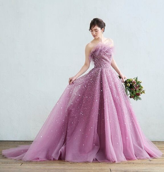 豪華! ピンクソフィア カラードレス オフショルダー キラキラチュール パフスリーブ 華やかなトレーン 結婚式/披露宴/前撮り