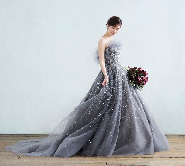 上品 グレー カラードレス オフショルダー キラキラチュール パフスリーブ 華やかなトレーン 結婚式/披露宴/前撮り
