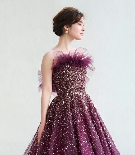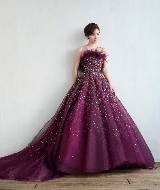 上品 カラードレス ワインレッド オフショルダー キラキラチュール パフスリーブ 華やかなトレーン 結婚式/披露宴/前撮り