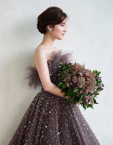 豪華!茶 カラードレス オフショルダー キラキラチュール パフスリーブ 華やかなトレーン 結婚式/披露宴/前撮り