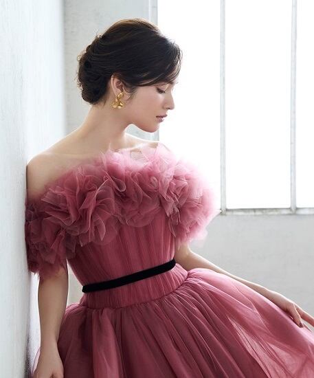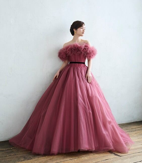 人気上昇 ビビッドピンク カラードレス オフショルダー パフスリーブ 華やかなトレーン 結婚式/披露宴/前撮り