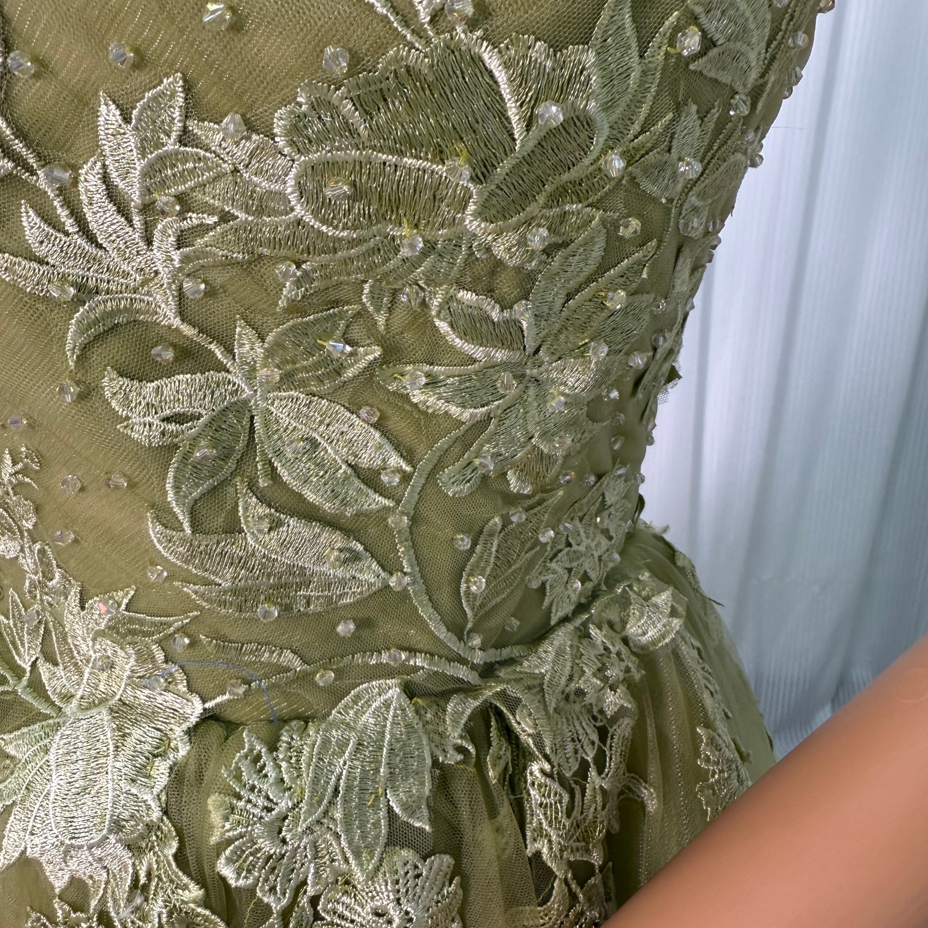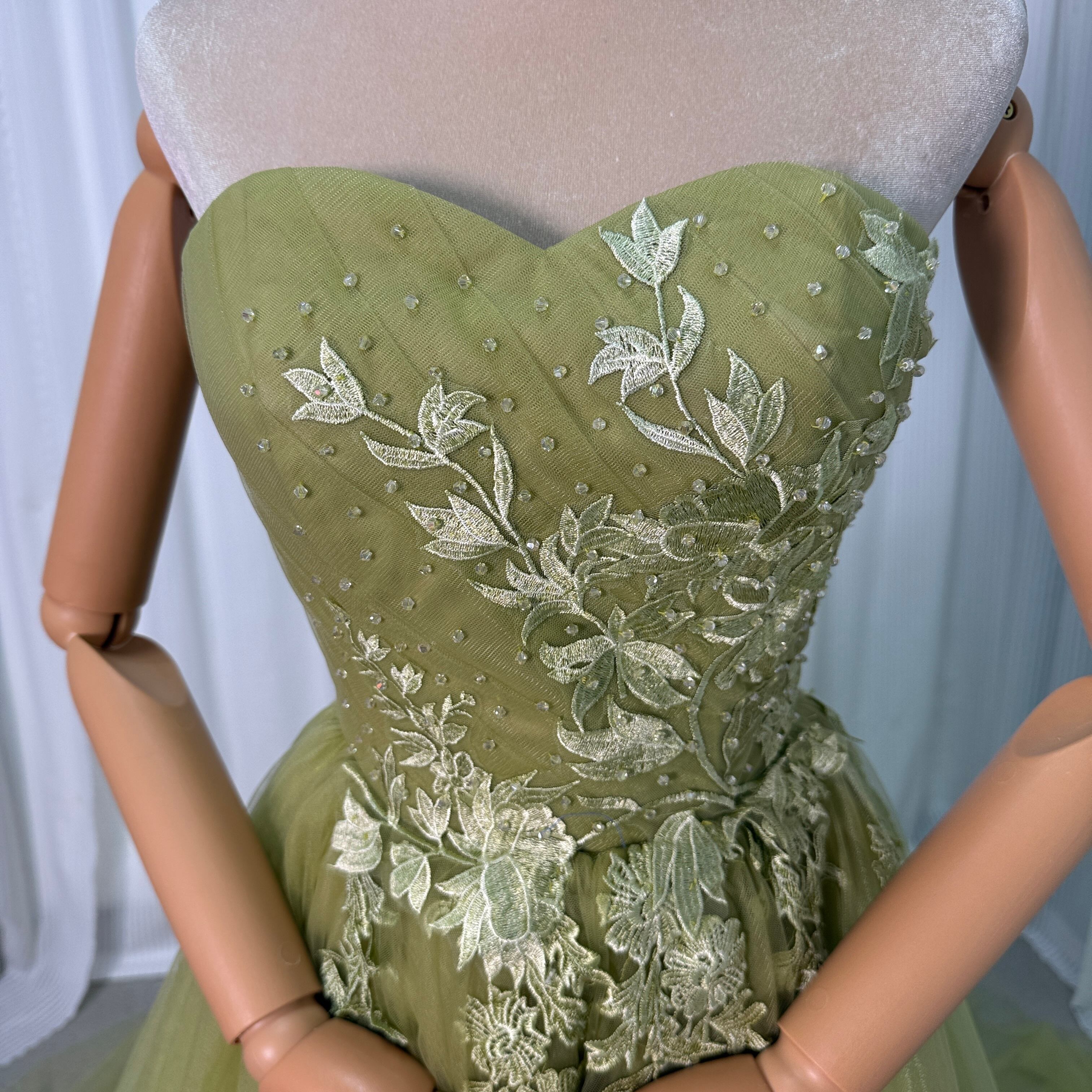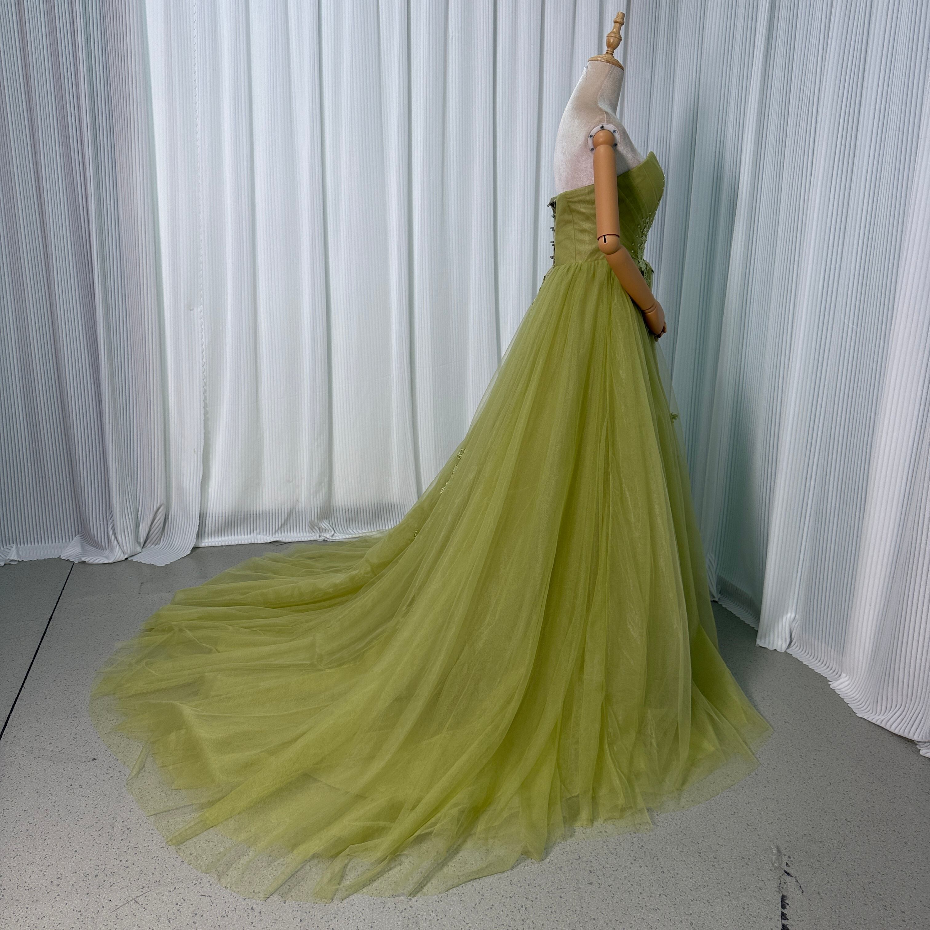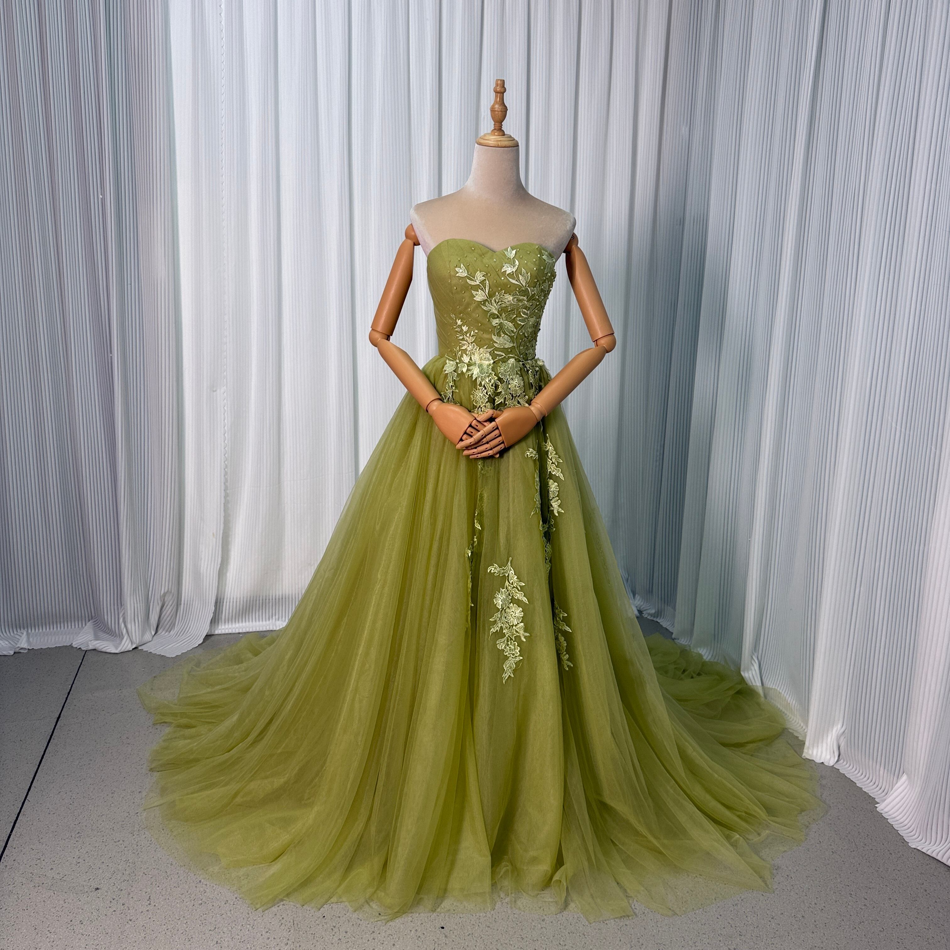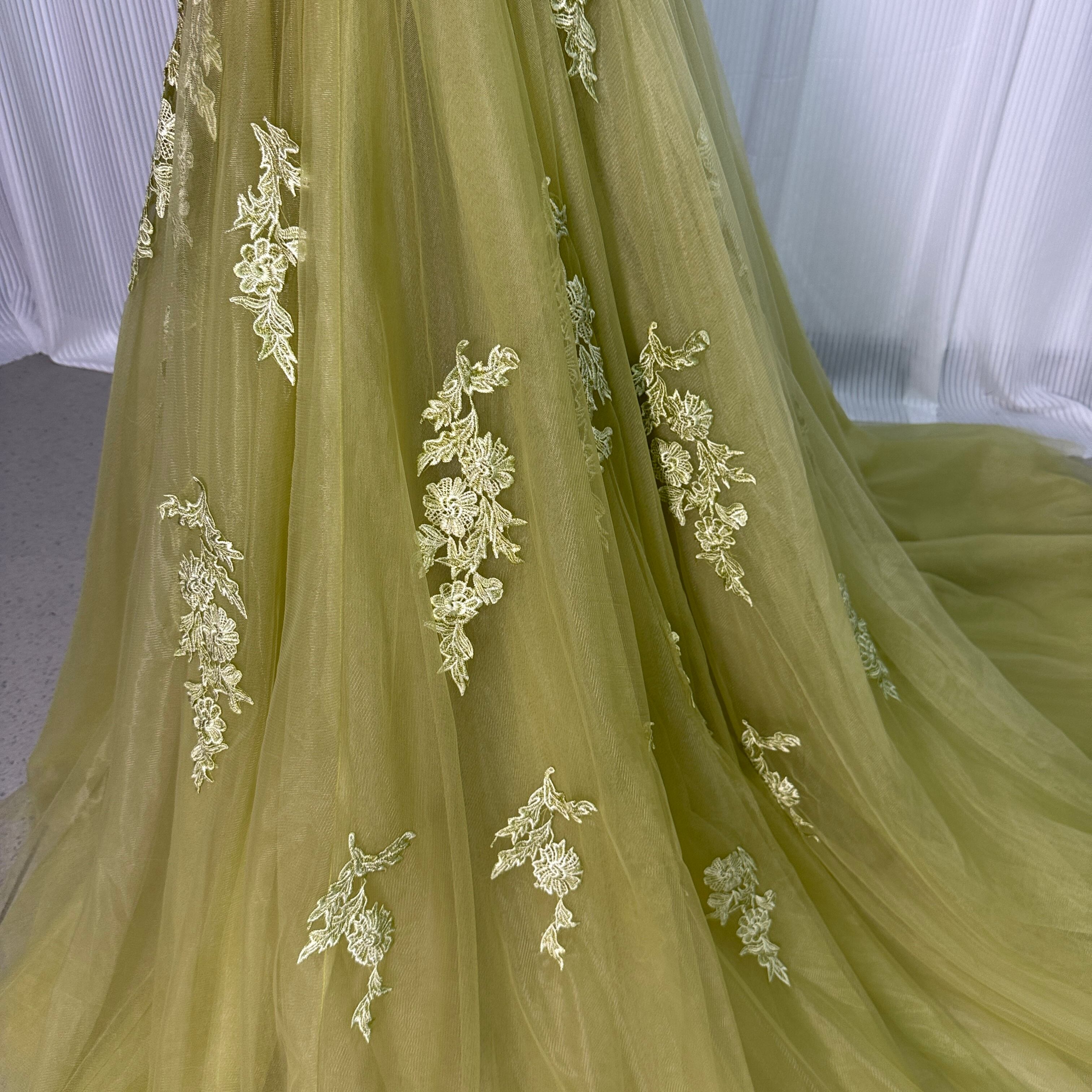 人気上昇 グリーン 3D立体レース刺繍 カラードレス ソフトチュール パフスリーブ 華やかなトレーン 結婚式/披露宴/前撮り