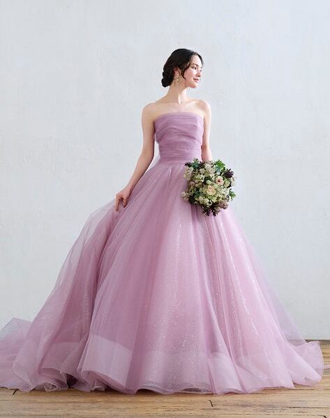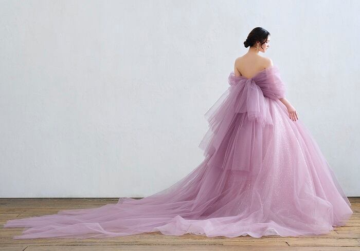 高品質! ピンクソフィア カラードレス オフショルダー ソフトチュール プリンセスライン 結婚式/披露宴