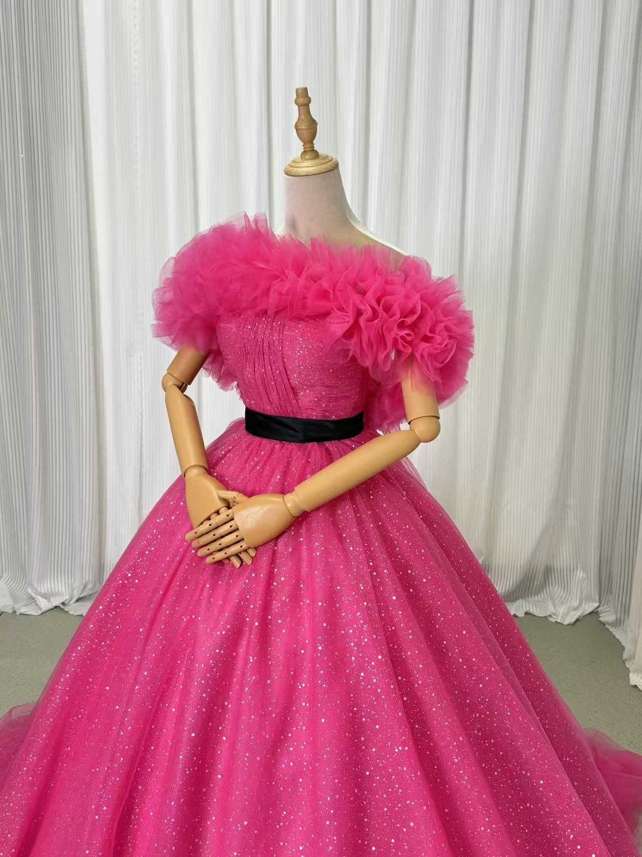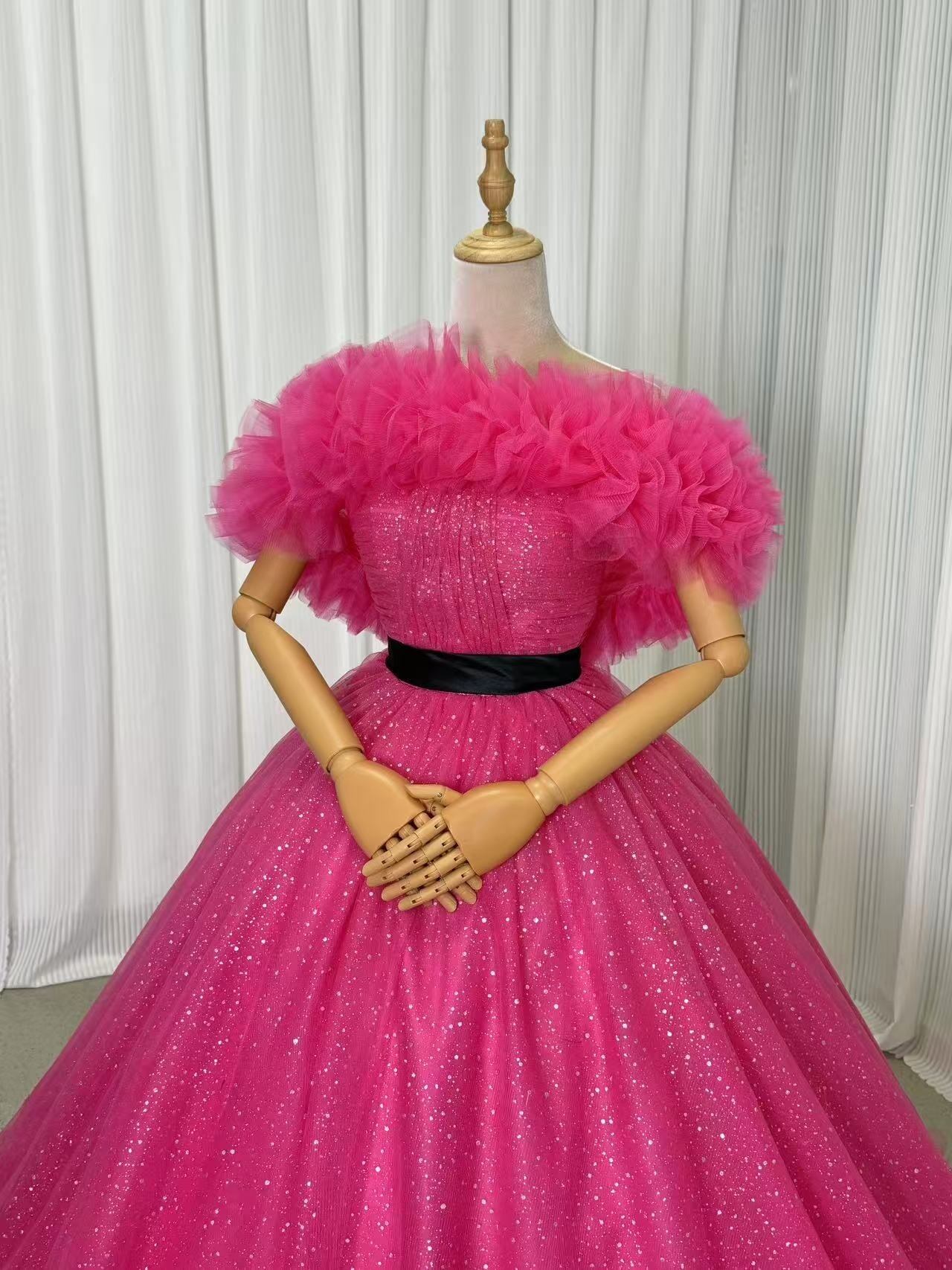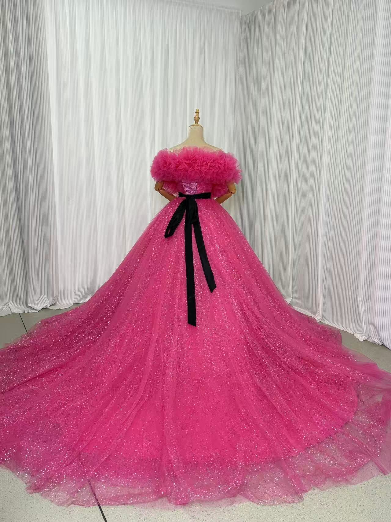 送料無料! 人気上昇!ビビッドピンク カラードレス オフショルダーの2WAYドレス ロングトレーン パーティードレス お色直し 結婚式/披露宴