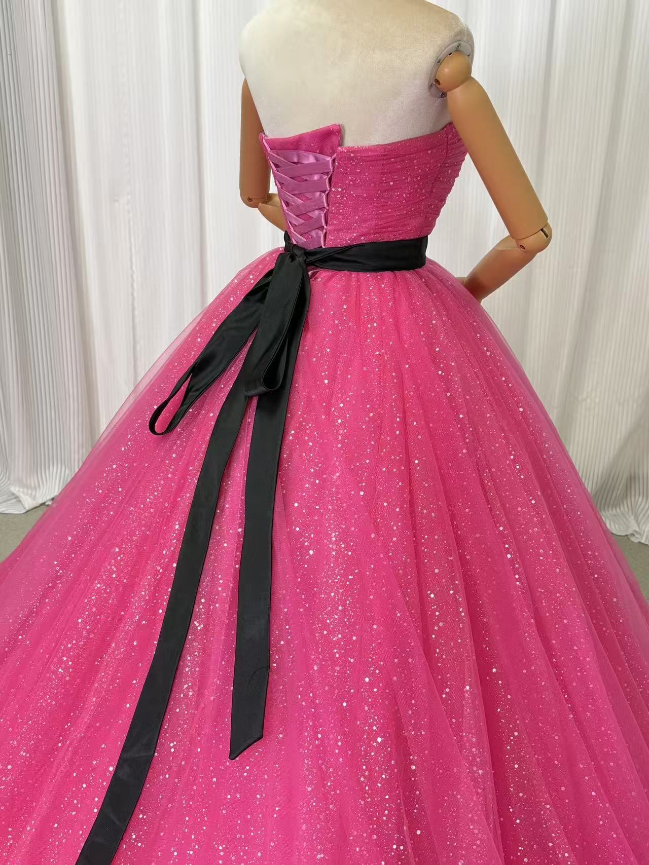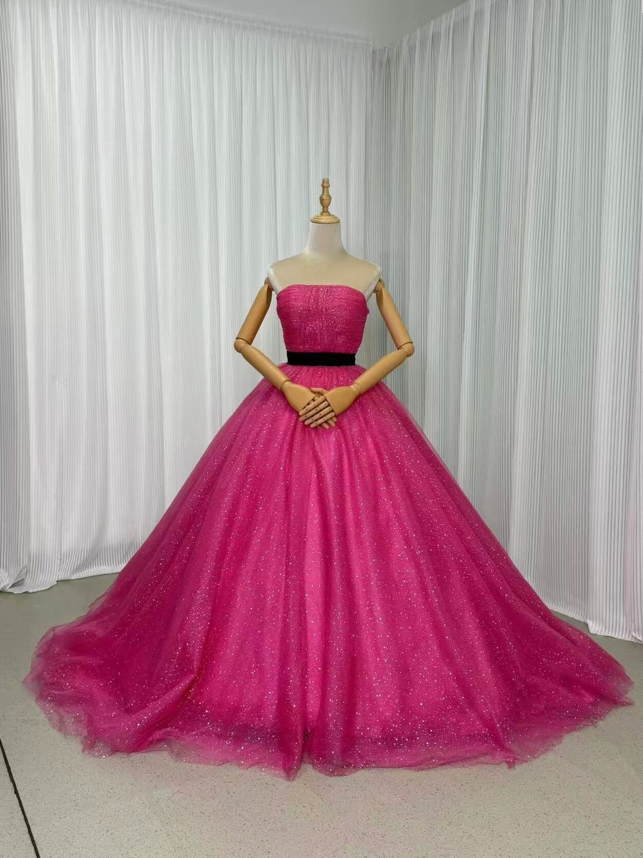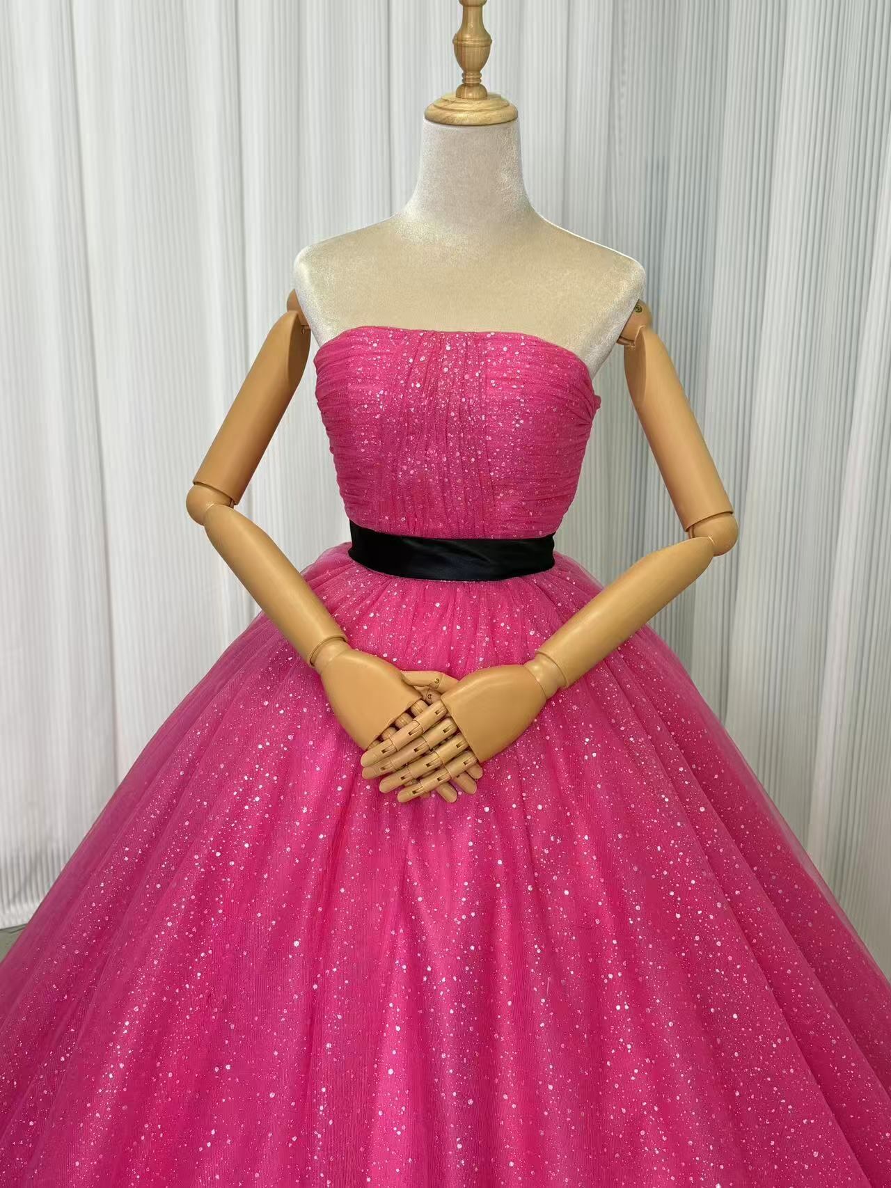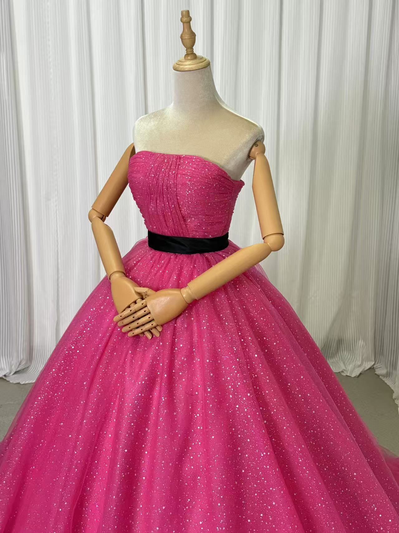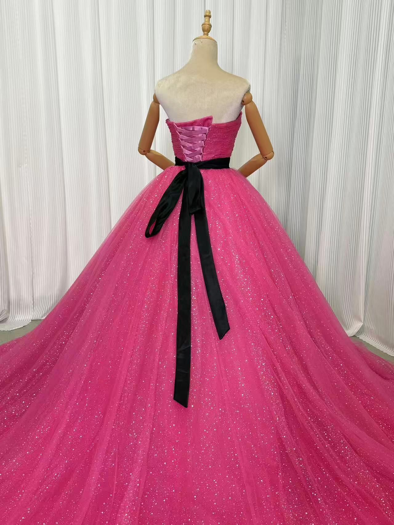 送料無料! 人気上昇!ビビッドピンク ベアトップ カラードレス ロングトレーン パーティードレス お色直し 結婚式/披露宴