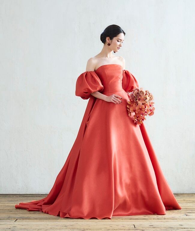 送料無料! 人気上昇! テラコッタ色 ベアトップ 取り外し袖 カラードレス ロングトレーン パーティードレス お色直し 結婚式/披露宴