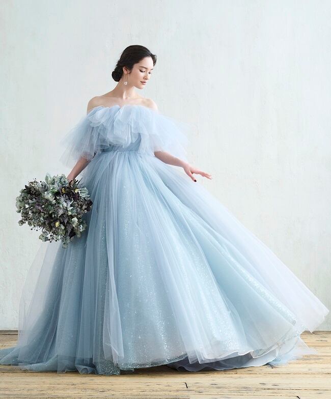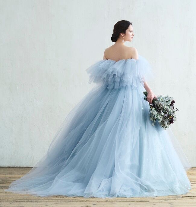 送料無料! 人気上昇!爽やかで優しいブルー オフショルダー カラードレス キラキラチュール ロングトレーン パーティードレス お色直し 結婚式/披露宴 | David1021k Dress(ダヴィドレス)