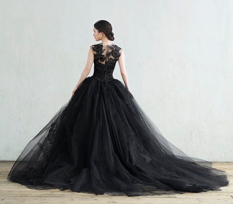 送料無料! 人気上昇! 黒 クルーネック 上品レース カラードレス ロングトレーン パーティードレス お色直し 結婚式/披露宴