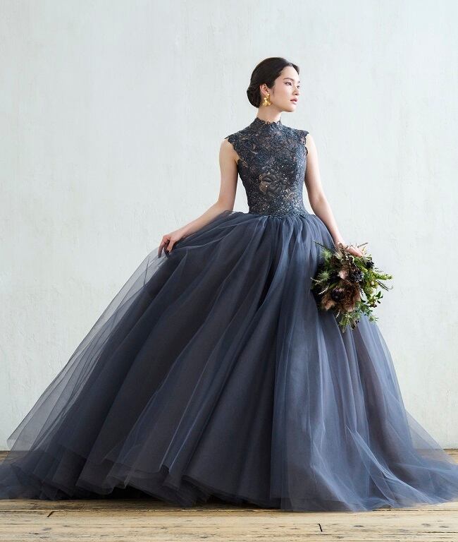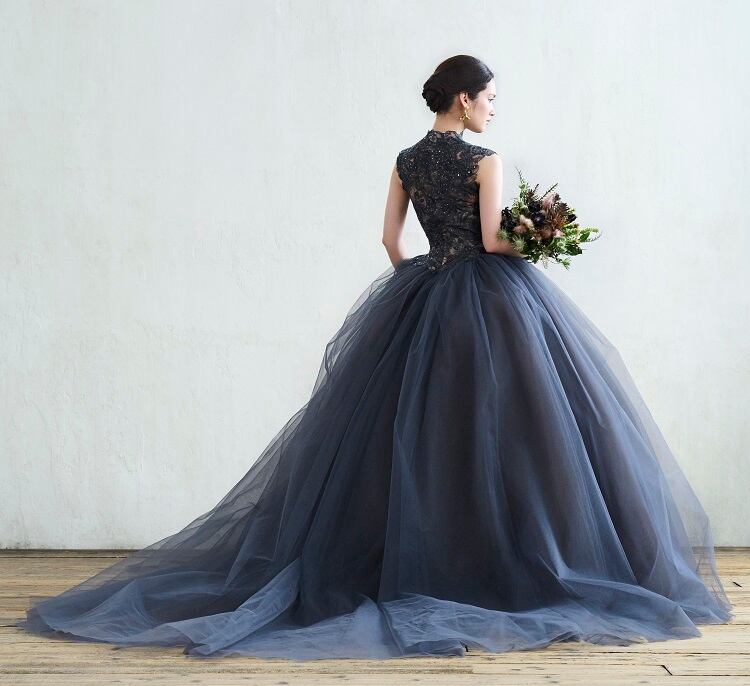 送料無料! 人気上昇! ネイビー クルーネック 上品レース カラードレス ロングトレーン パーティードレス お色直し 結婚式/披露宴