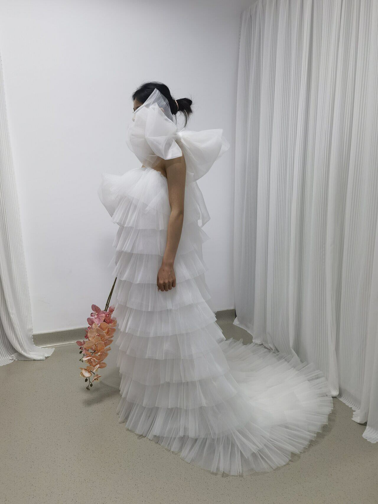 実例写真! ベアトップ オフホワイト 取り外しリボン 袖 ウエディングドレス 柔らかく重ねたチュールスカート 抜群のおしゃれ見え 目立つ 前撮り 花嫁