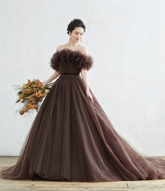 送料無料! 人気上昇! コーヒーの色 オフショルダー カラードレス キラキラチュール ロングトレーン パーティードレス お色直し 結婚式/披露宴