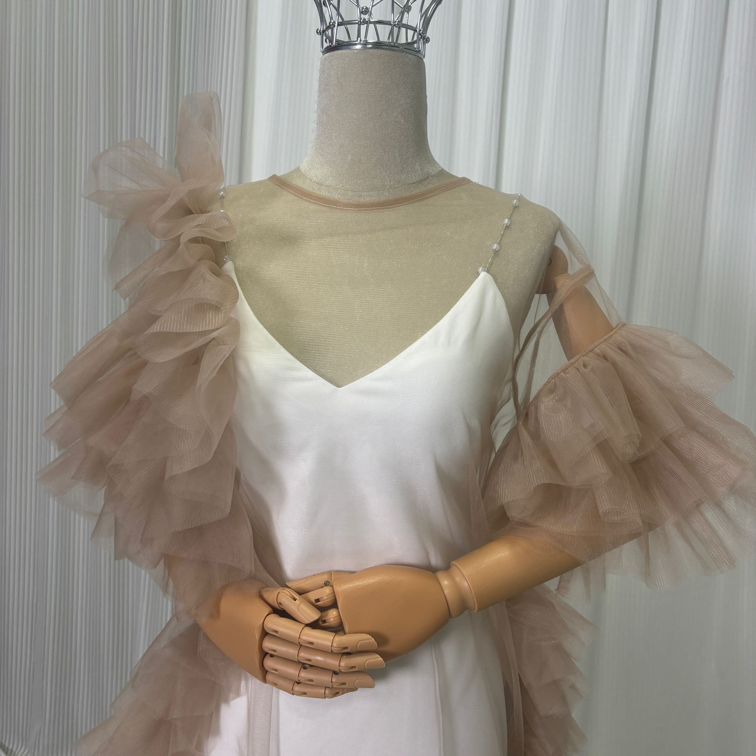送料無料!抜群のおしゃれ見えカーディガン(ボレロ) ソフトチュール ラッフルフリル 長袖+オフホワイト キャミソールワンピース