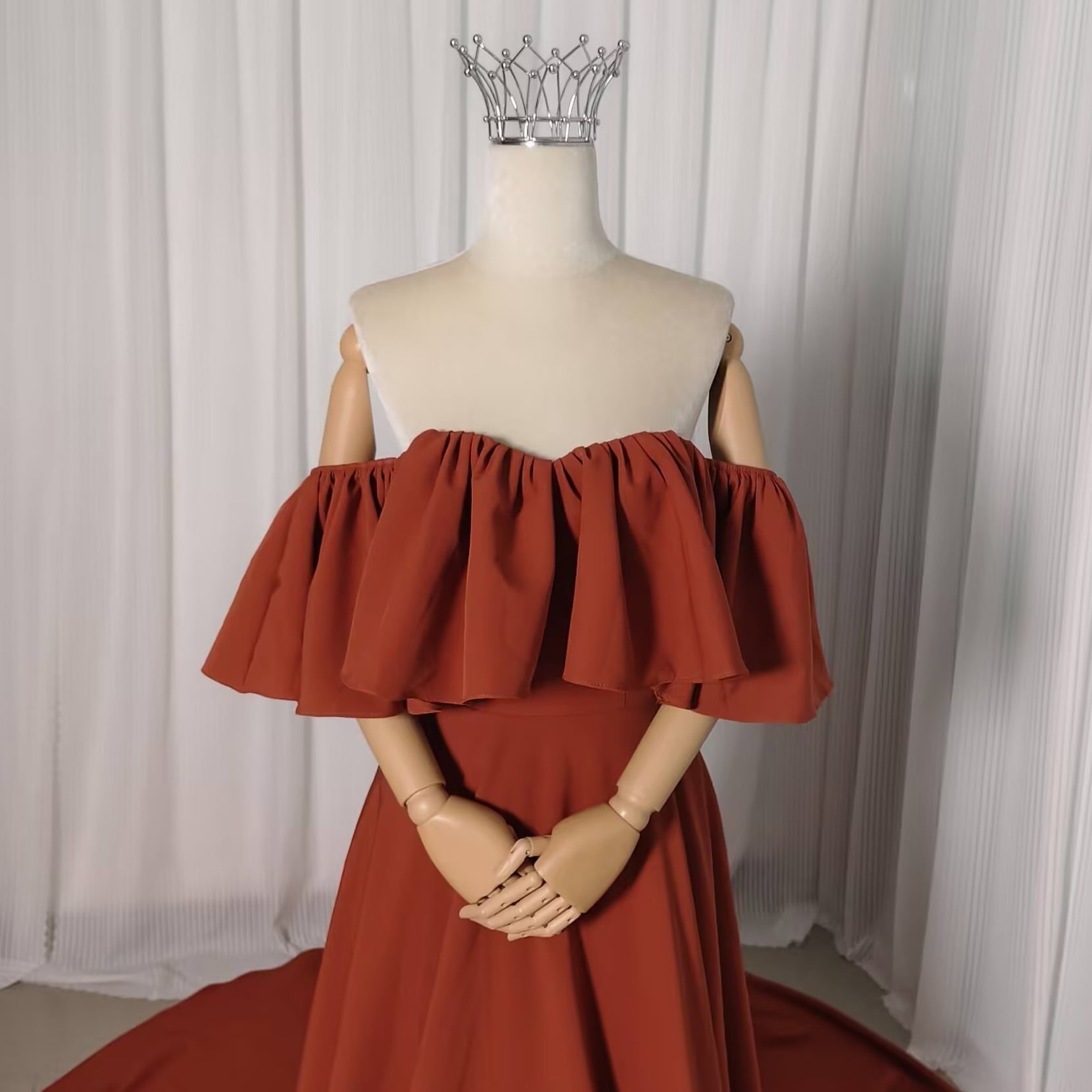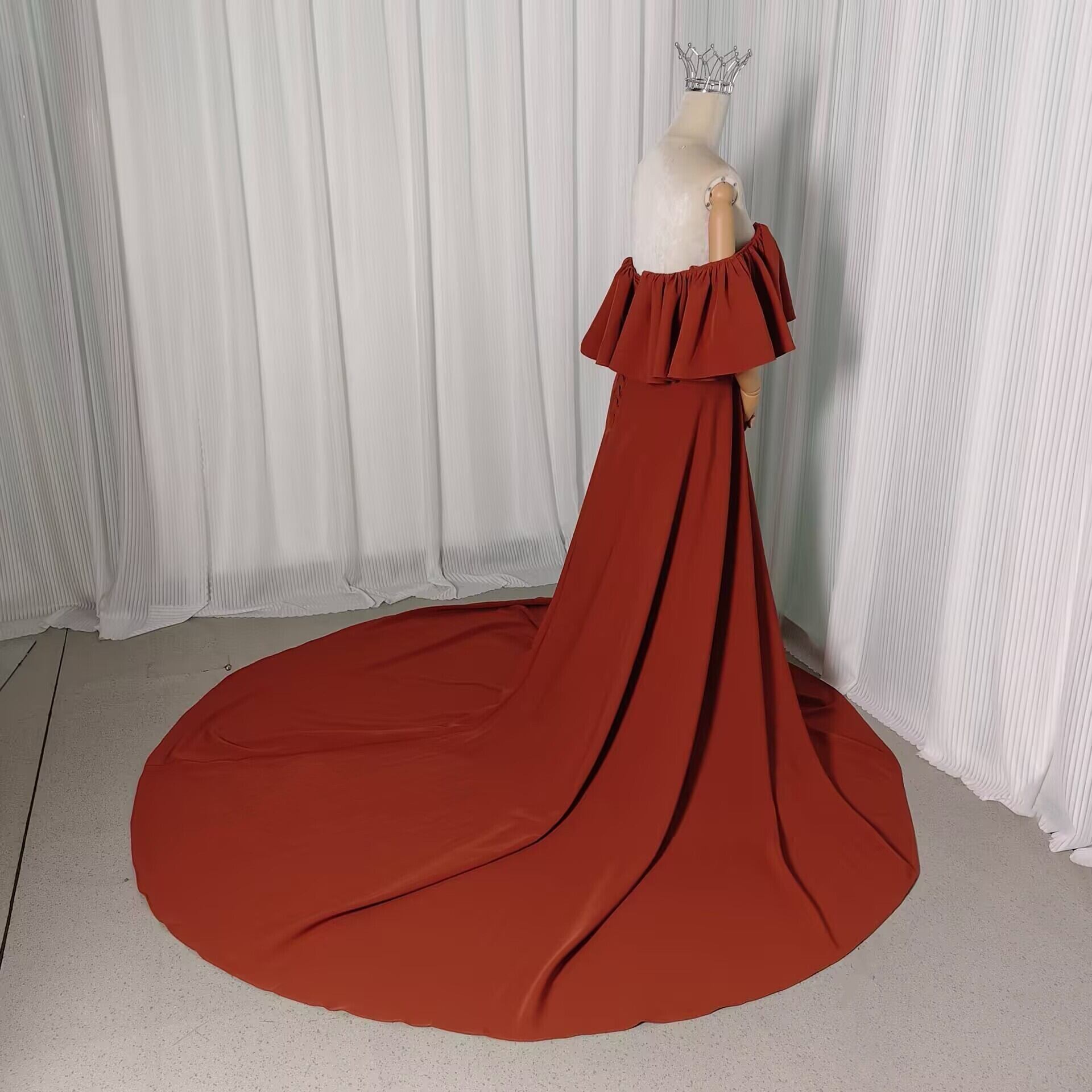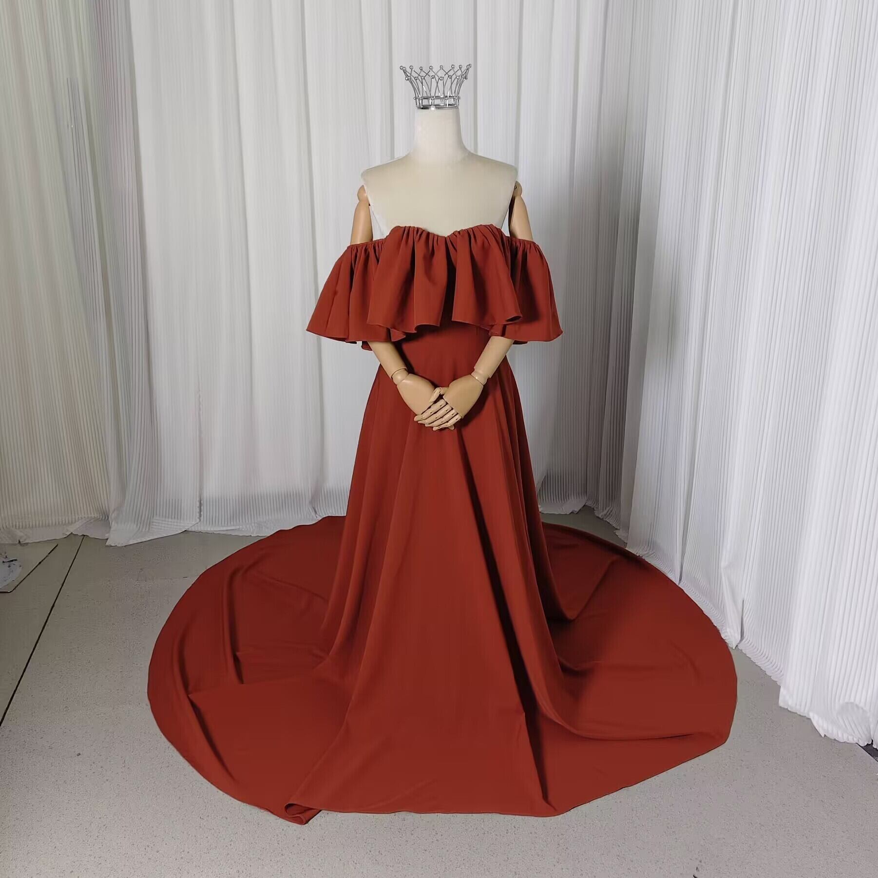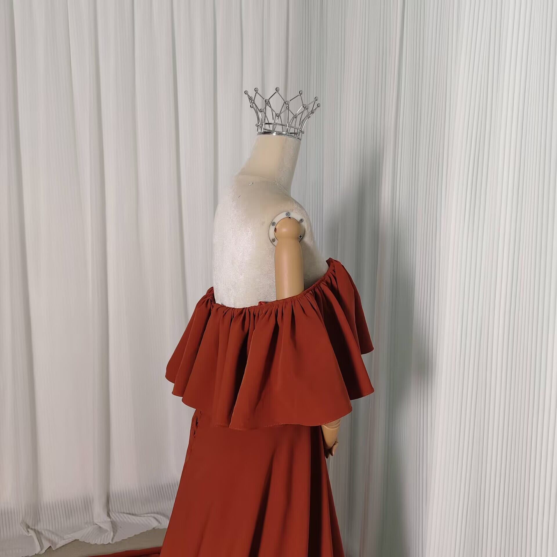 高品質! カラードレス テラコッタ色 オフショルダーク レープ生地 ロングトレーン 前撮り2次会/挙式/花嫁