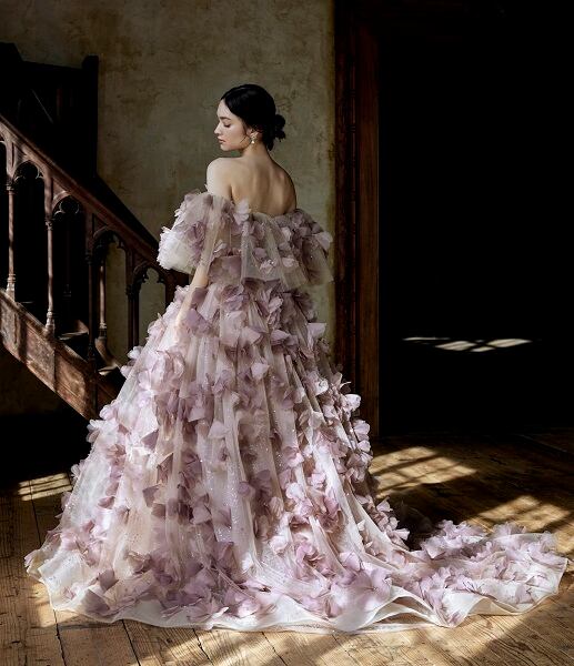 人気上昇 3D立体レース刺繍 オフショルダー カラードレス ソフトチュール プリンセスライン パフスリーブ 結婚式/披露宴/前撮り