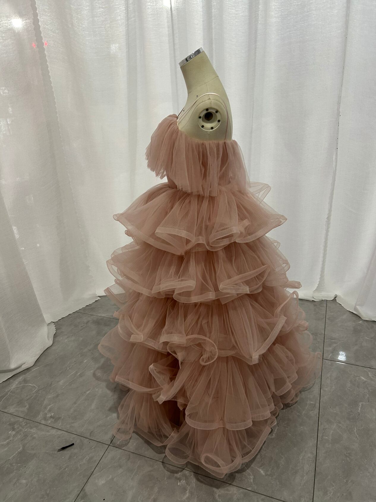 人気上昇 ピンク ベアトップ カラードレス ソフトチュール 柔らかく重ねたチュールスカートフレアスカート パフスリーブ 結婚式/披露宴/前撮り