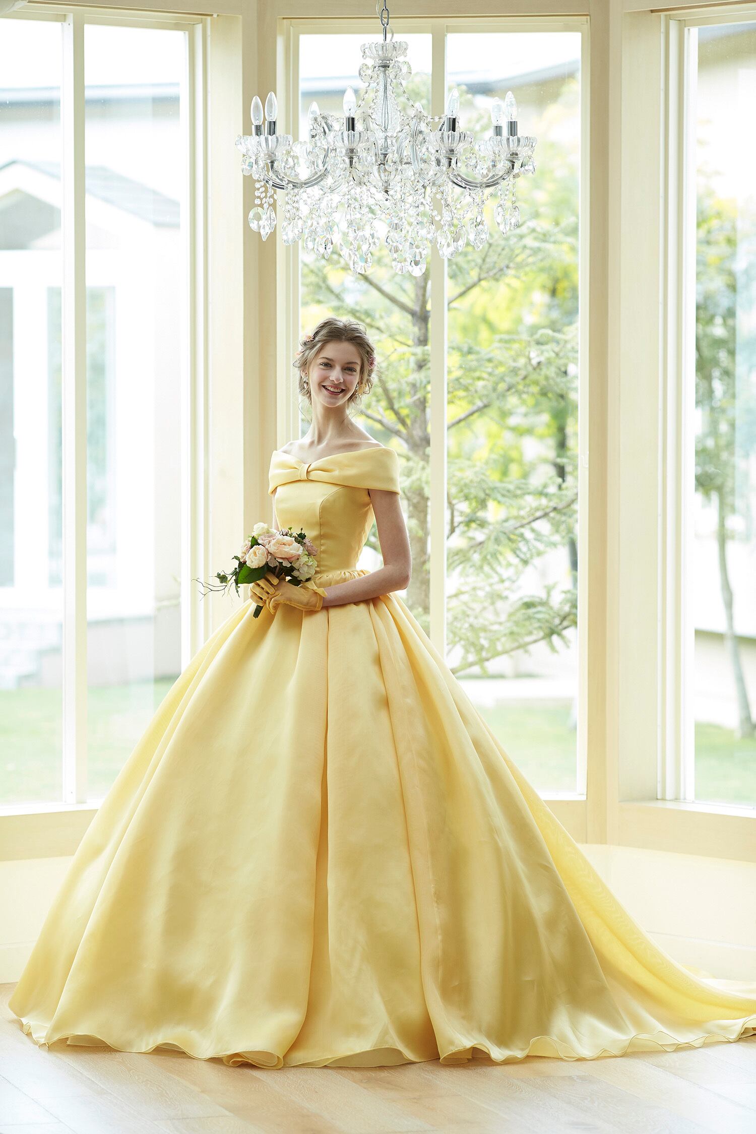 カラードレス イエロー サテン オフショルダ― 編み上げ 結婚式/披露宴