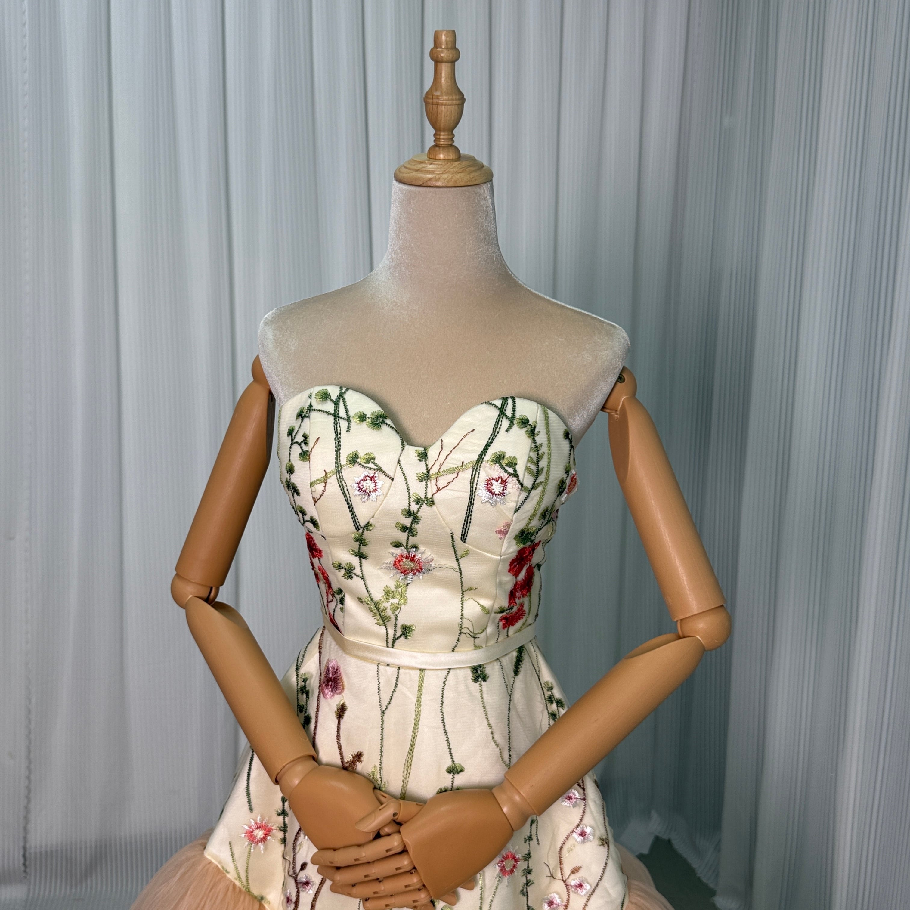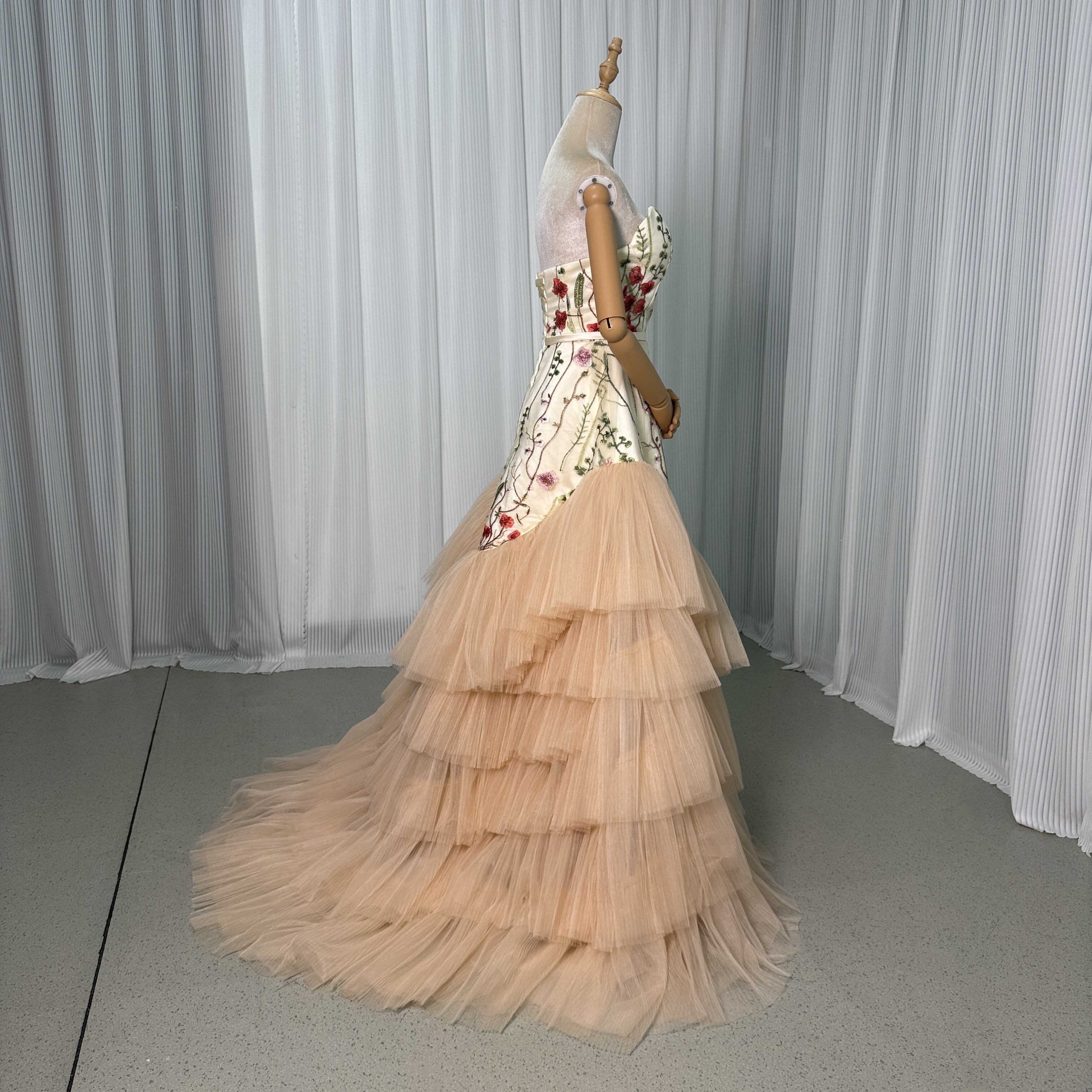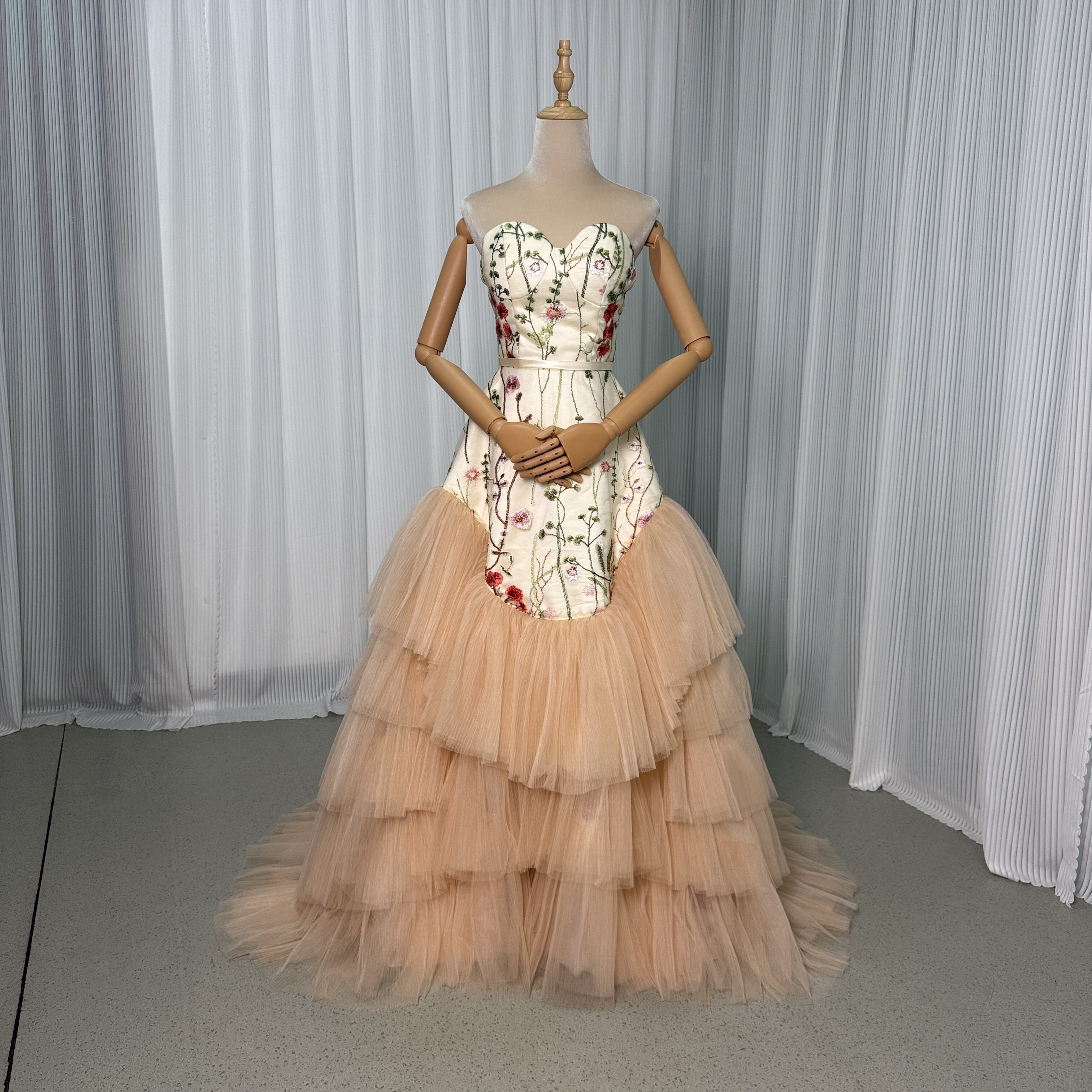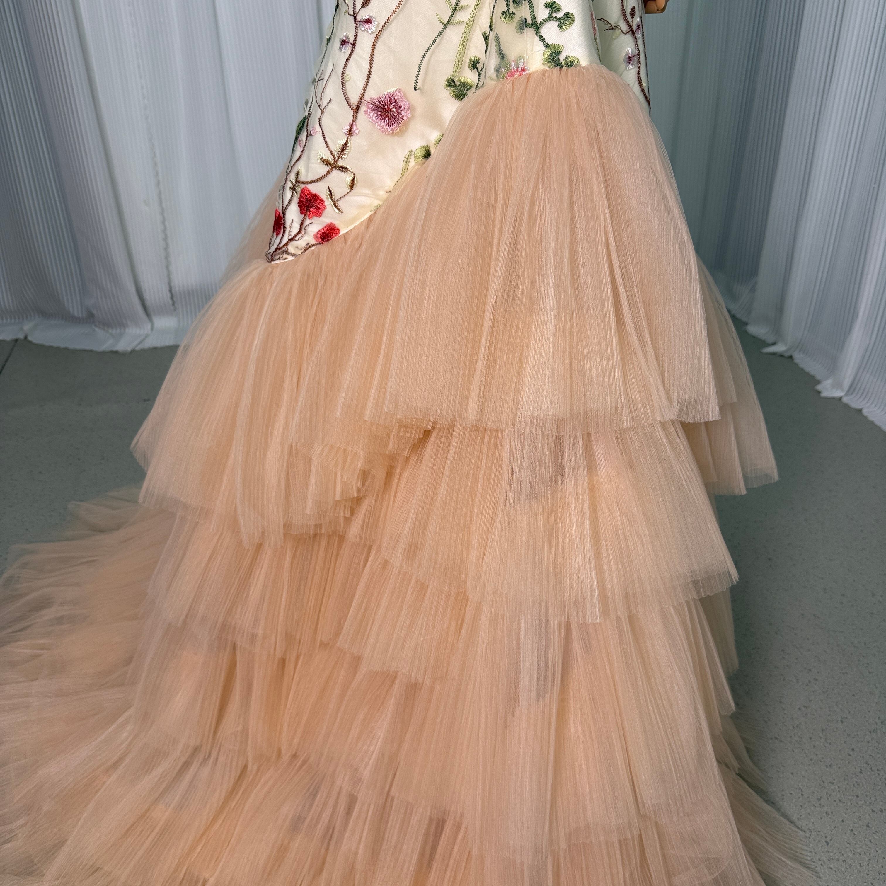 もこもこチュールドレス シャンパン色 3D立体レース刺繍 カラードレスフリルオフショルダーお色直し ふわふわ前撮り/花嫁/結婚式/披露宴