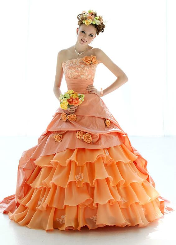 送料無料!人気上昇! オレンジ カラードレス 柔らかく重ねたチュールスカート カート プリンセスライン 2次会 花嫁 ロングトレーン オーバ 結婚式/披露宴