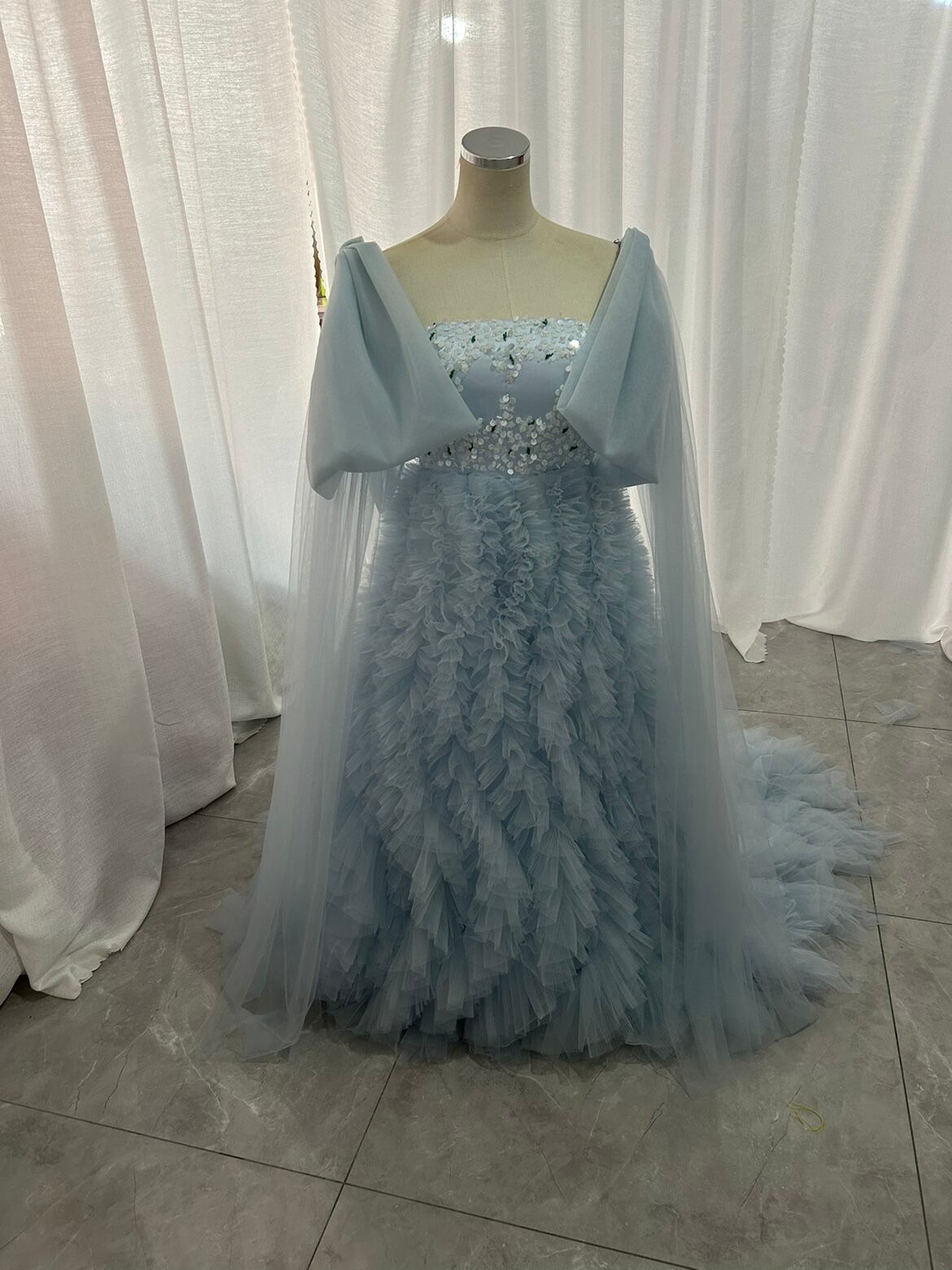ゴージャスでエアリーなもこもこカラードレス リボン袖 チュールドレス キラキラのハンドビーディング ふわふわ ボリューム
