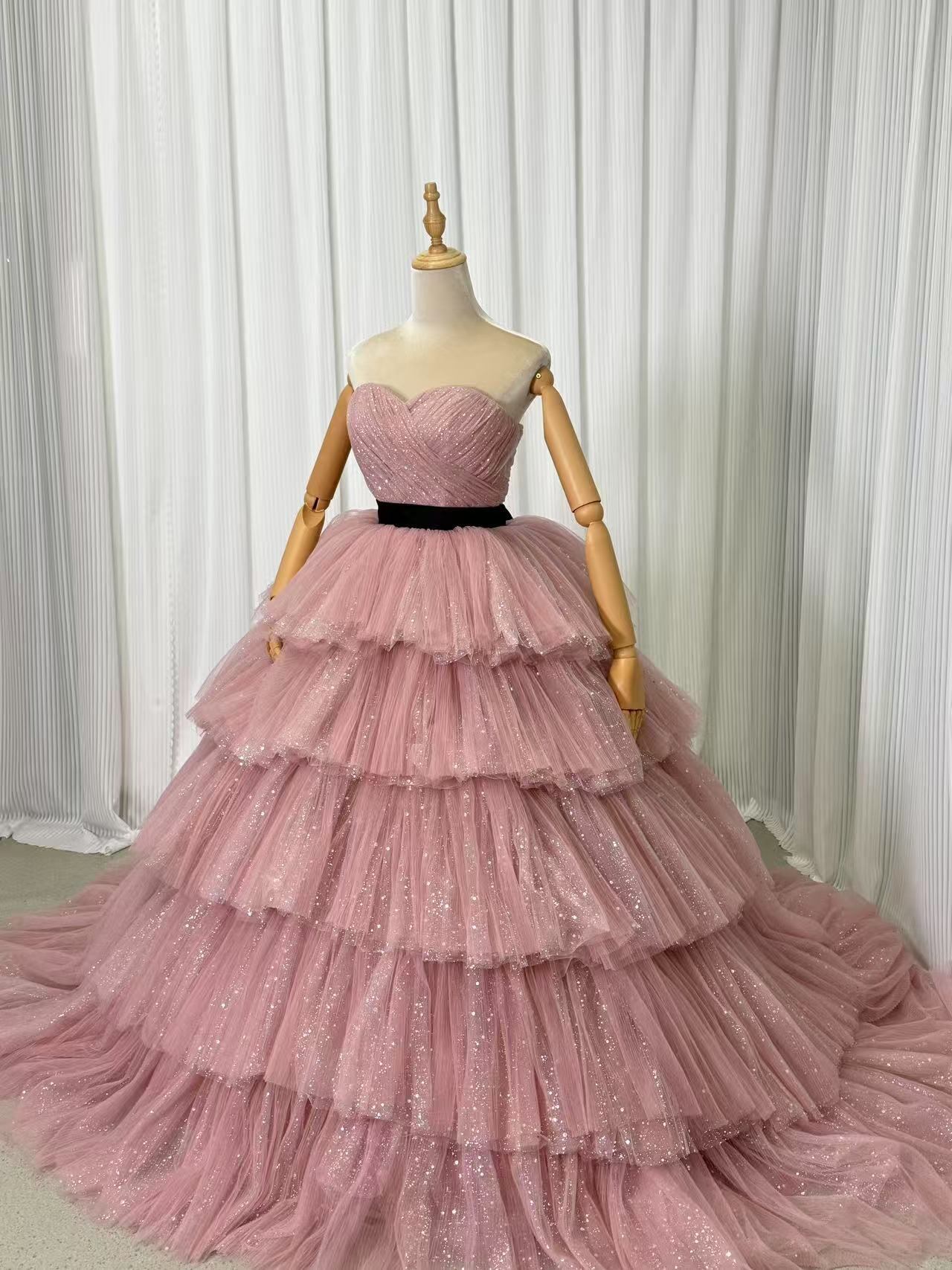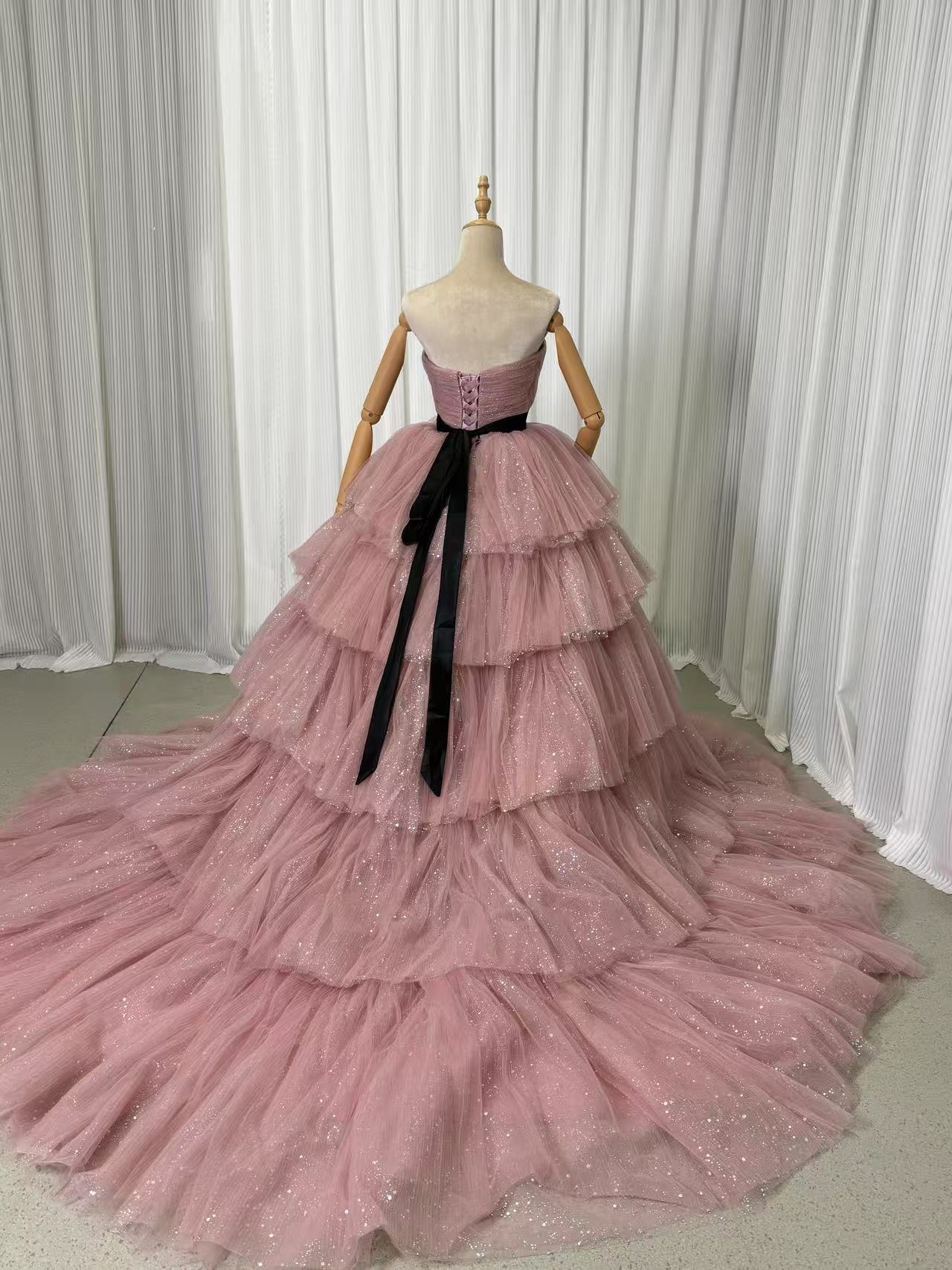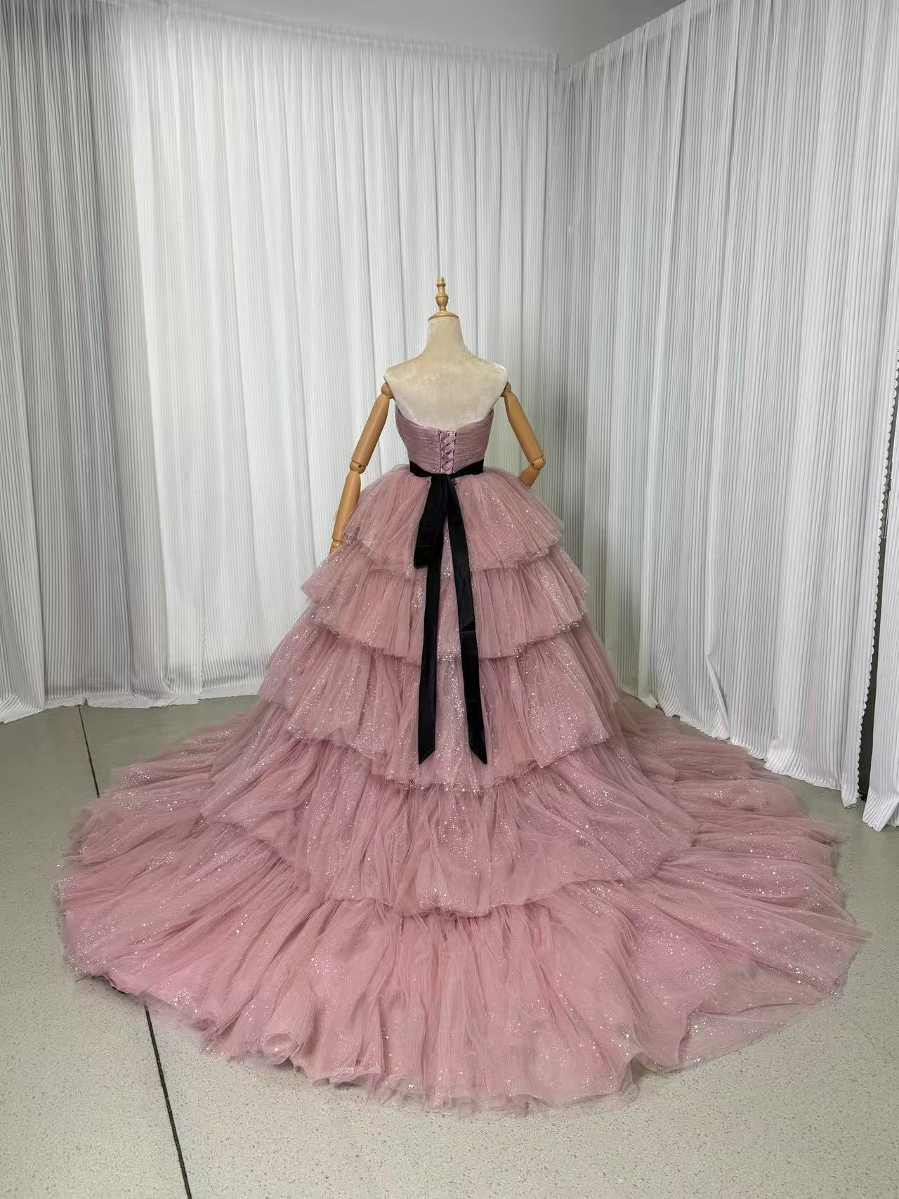 送料無料!人気上昇! ピンク ベアトップ キラキラチュール カラードレス 柔らかく重ねたチュールスカート カート プリンセスライン 2次会 花嫁 ロングトレーン オーバ 結婚式/披露宴