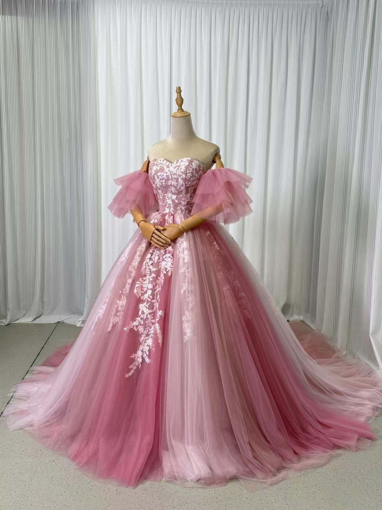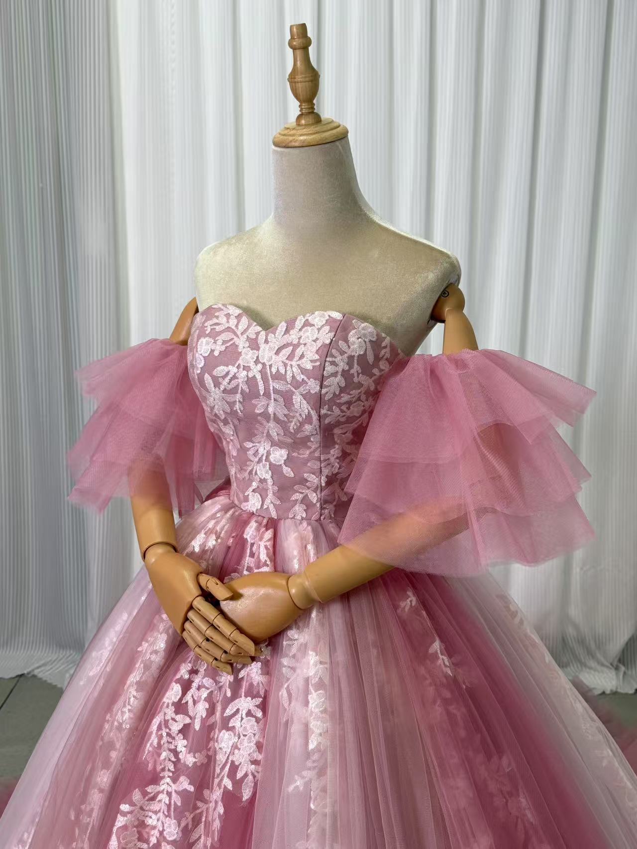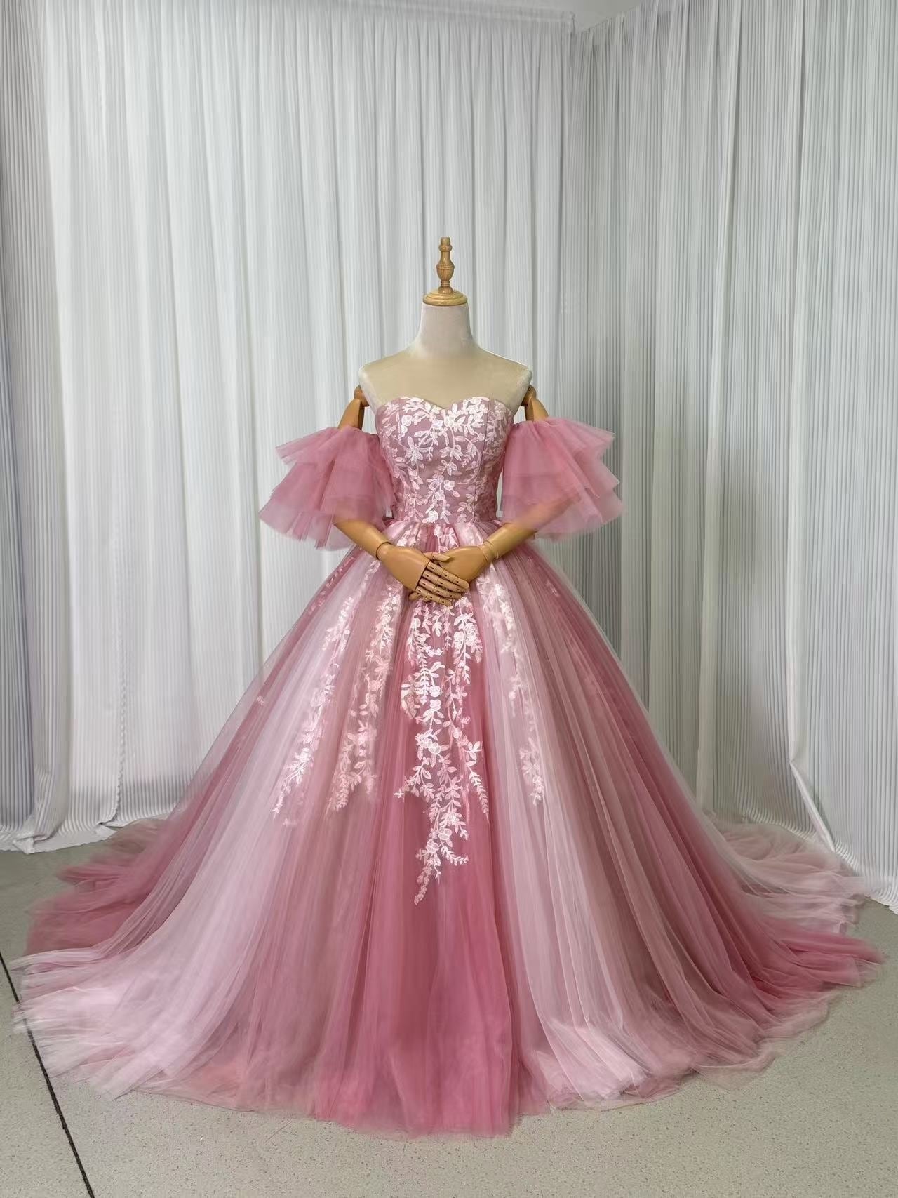 送料無料!人気上昇! 2色 上品花レース カラードレス フリル袖 プリンセスライン 2次会 花嫁 ロングトレーン オーバ 結婚式/披露宴