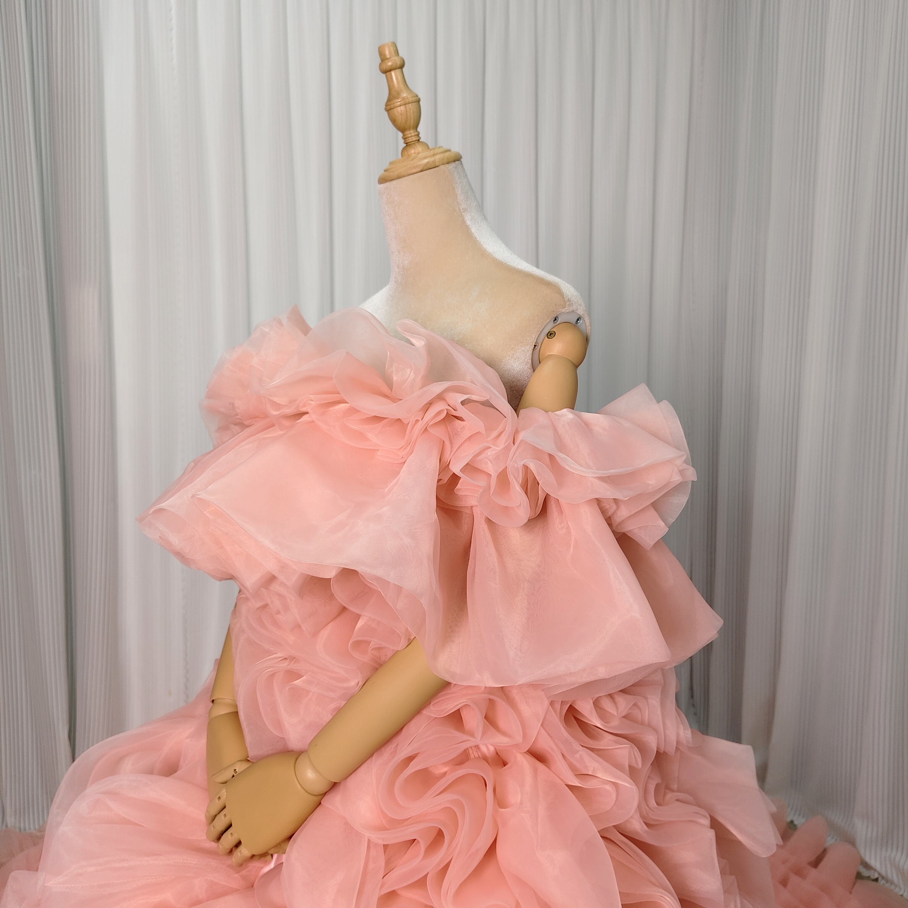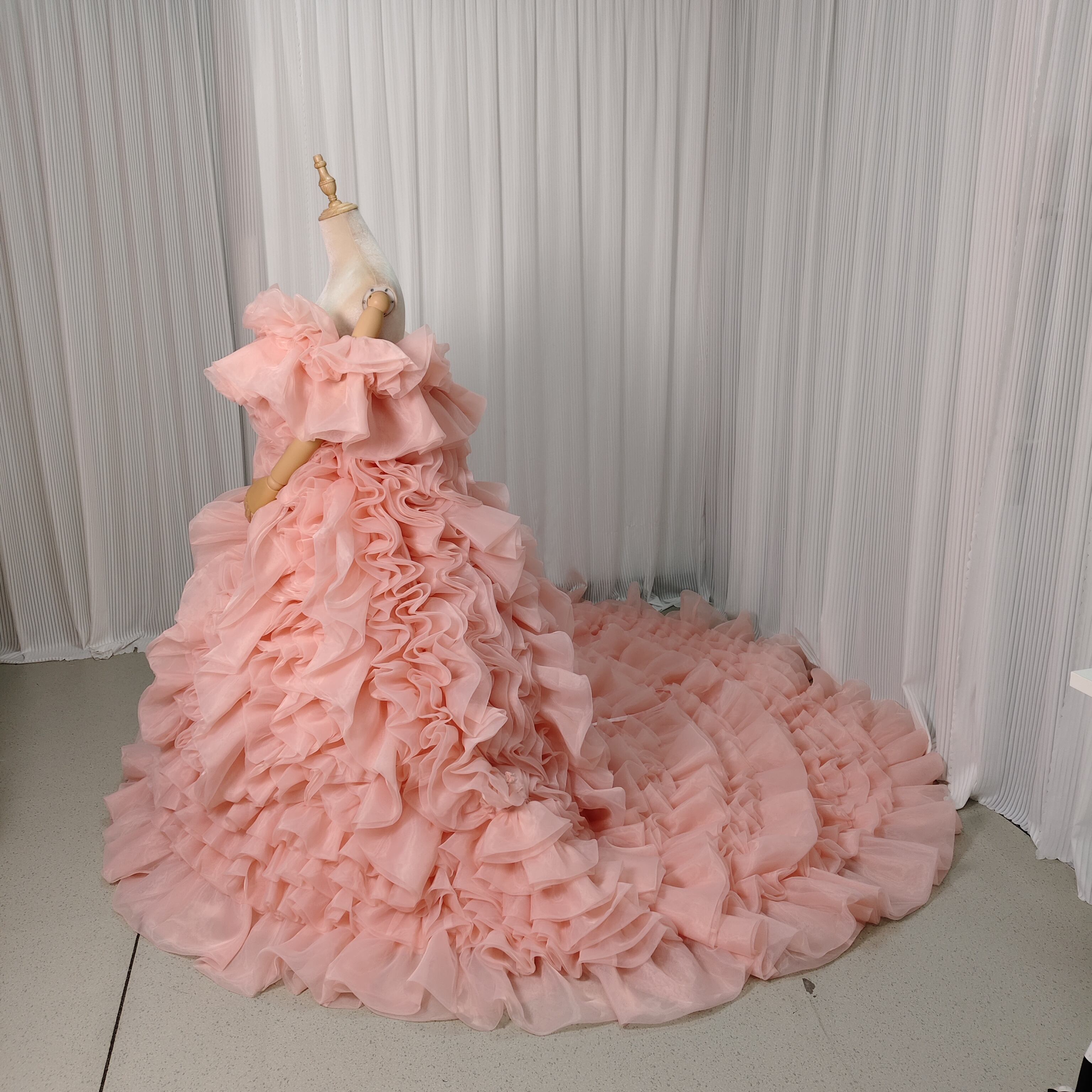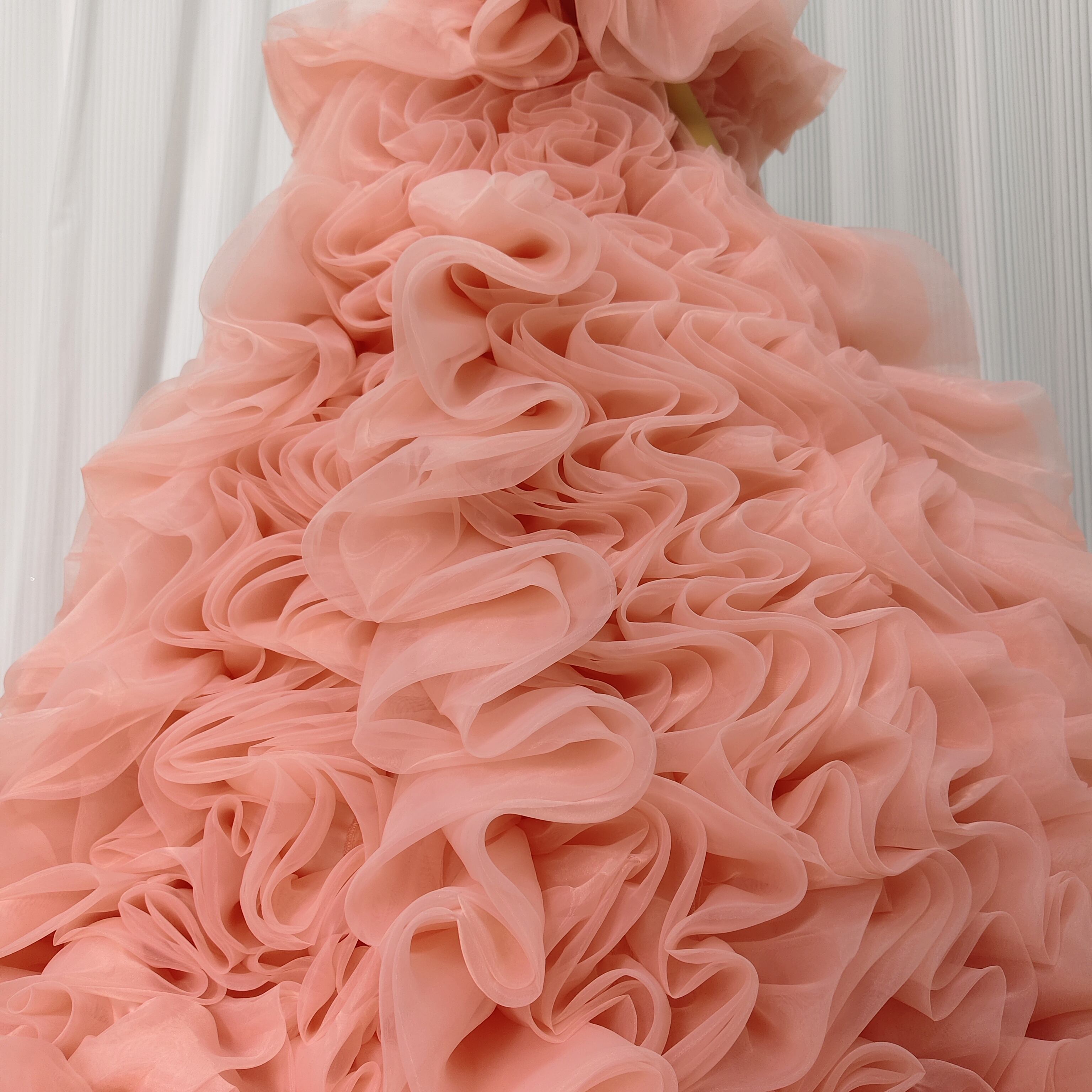 韓国風もこもこ ピンク 上質オーガンジー くすみピンクカラードレス リ華やかなリボントレーン花嫁