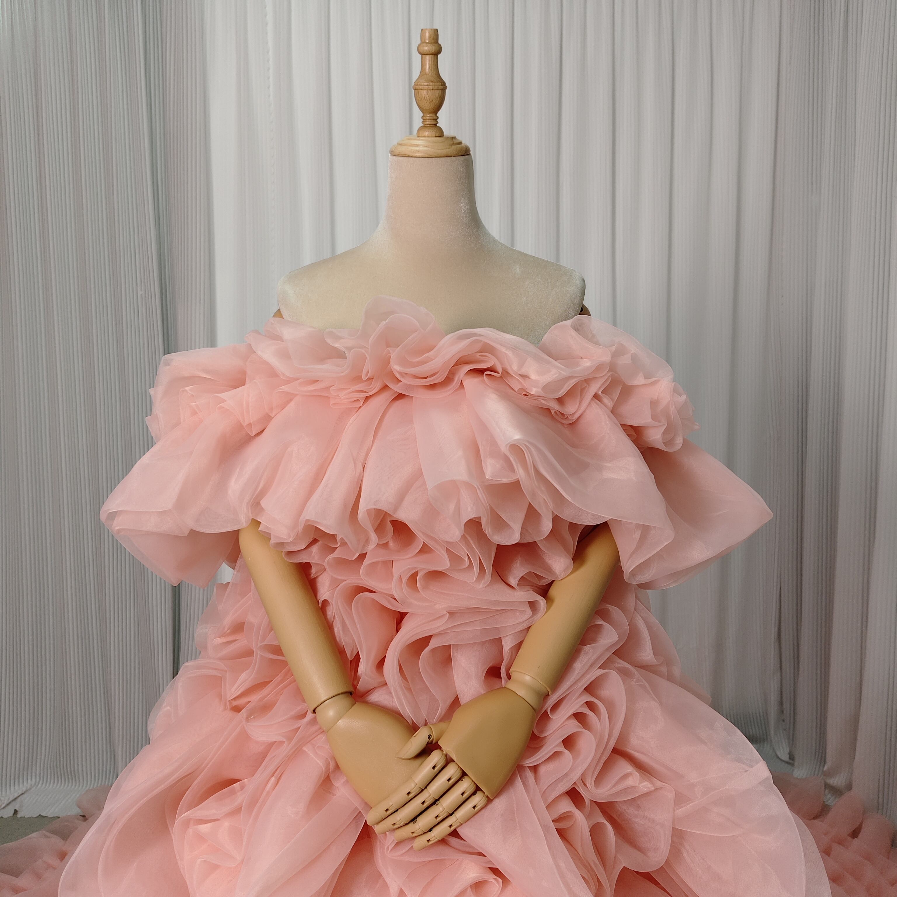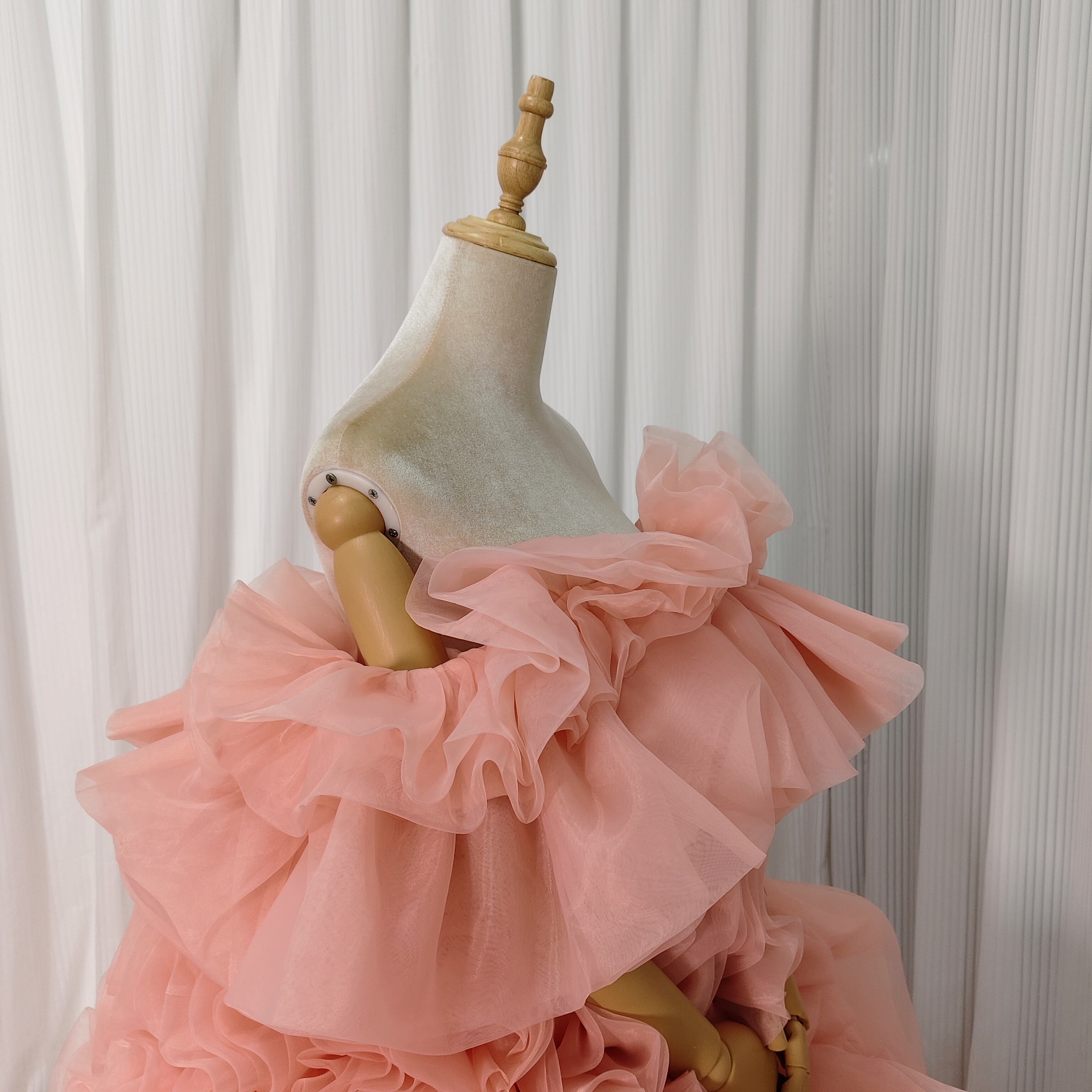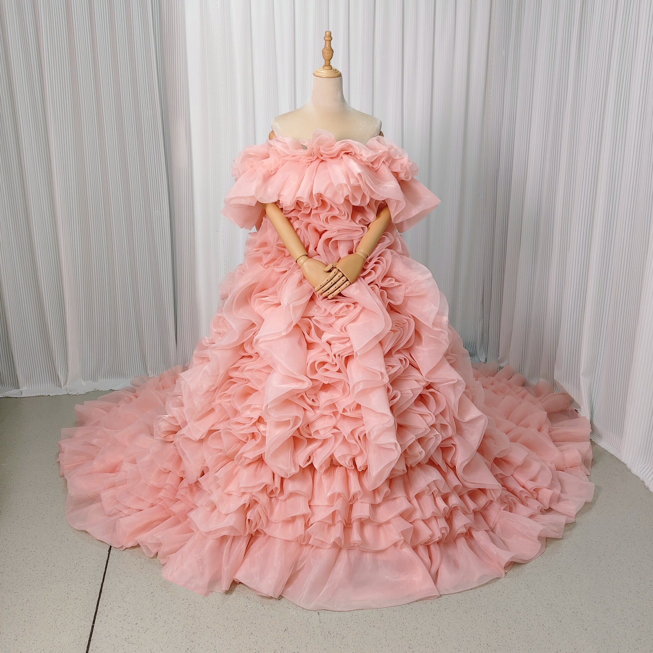 韓国風もこもこ ピンク 上質オーガンジー くすみピンクカラードレス リ華やかなリボントレーン花嫁