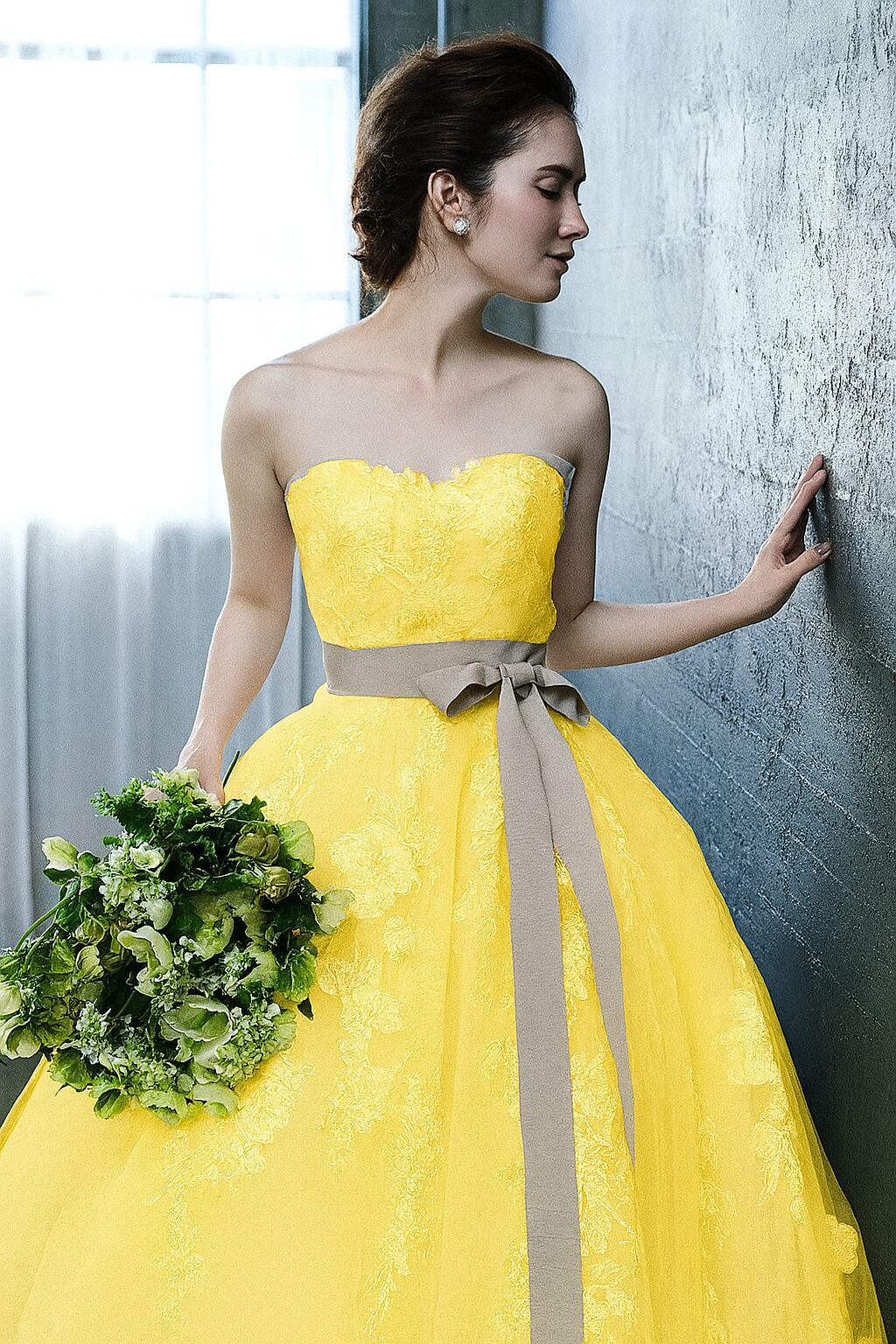 高品質!黄色カラードレス オフショルダー 色直し サイズ調整可能 華やかなトレーン ドレスアレンジ お色直し