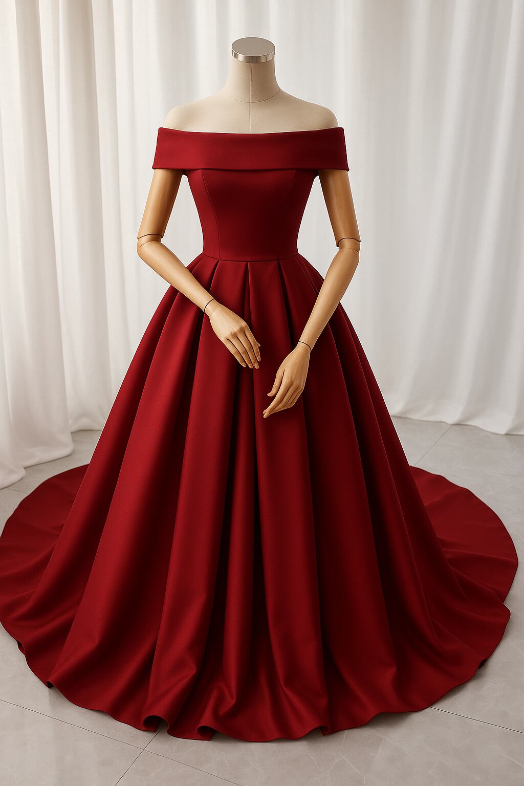輝きな光彩を放つ オフショルダー ワインレッド カラードレス ロングトレーン披露宴/前撮り二次会