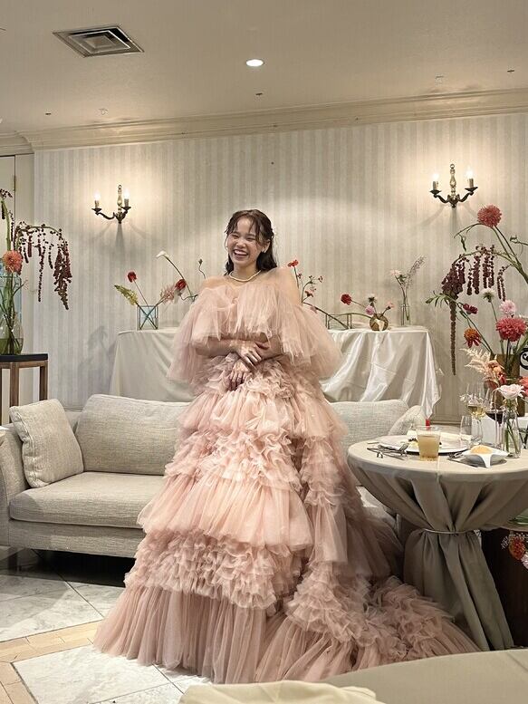 実例写真 韓国風もこもこ オフショルダー チュールドレス くすみピンクカラードレス お色直し取り外し華やかなリボントレーン花嫁