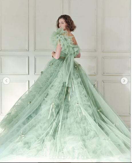 ブルーグレー オフショルダー カラードレス ふわふわオーバースカート柔らかく重ねたチュールスカート サッシュベルト 結婚式 披露宴